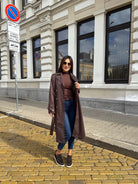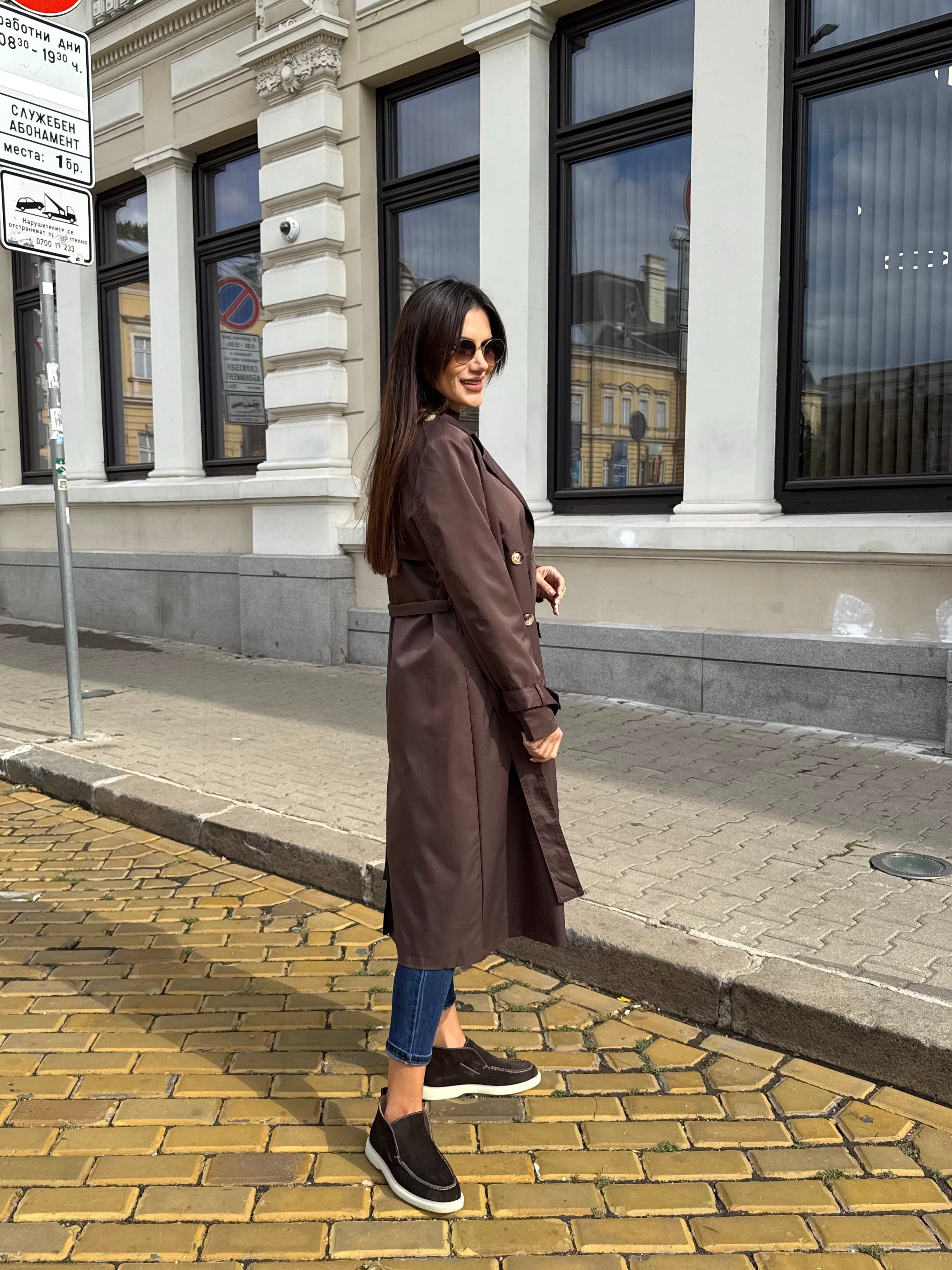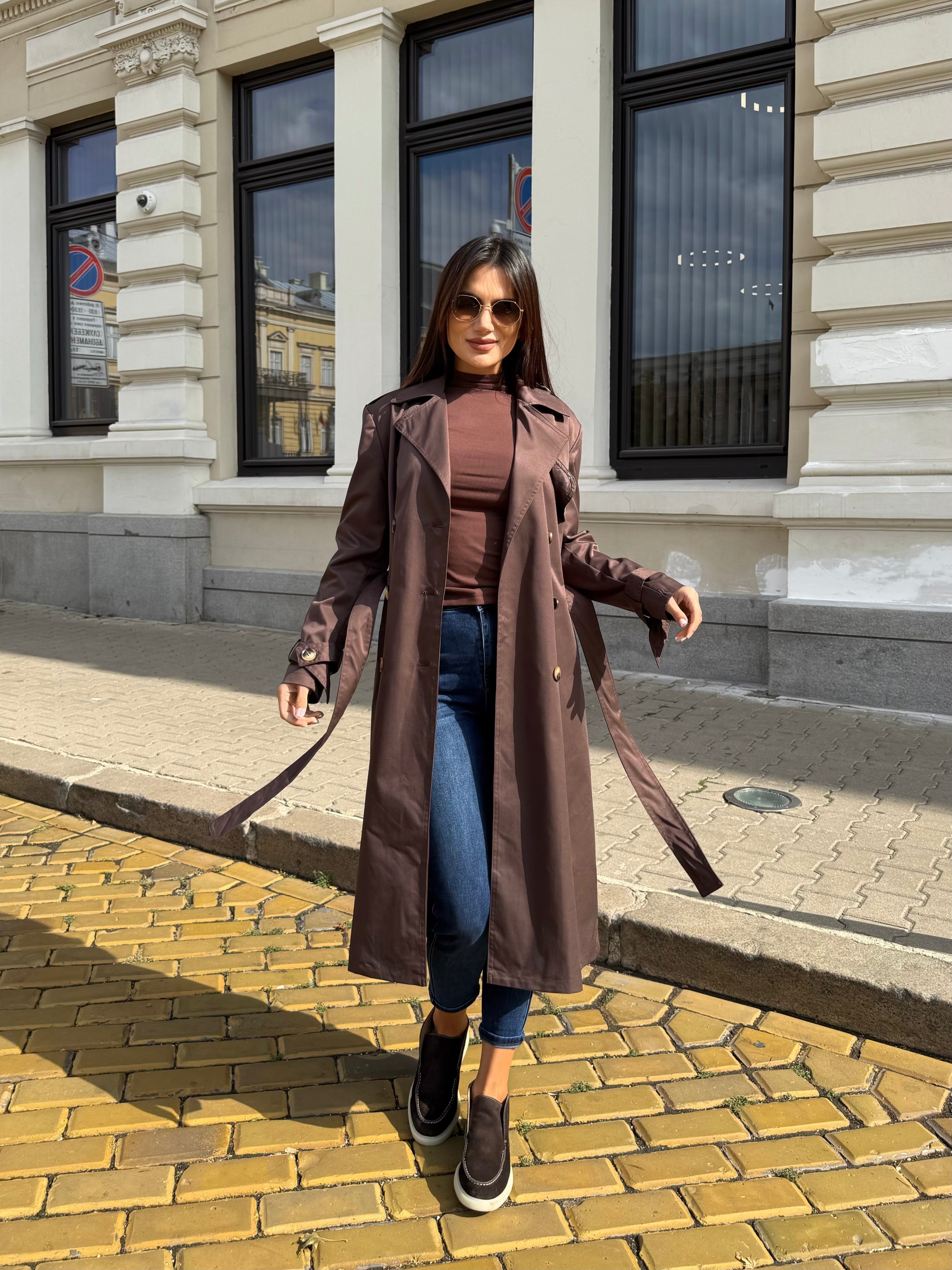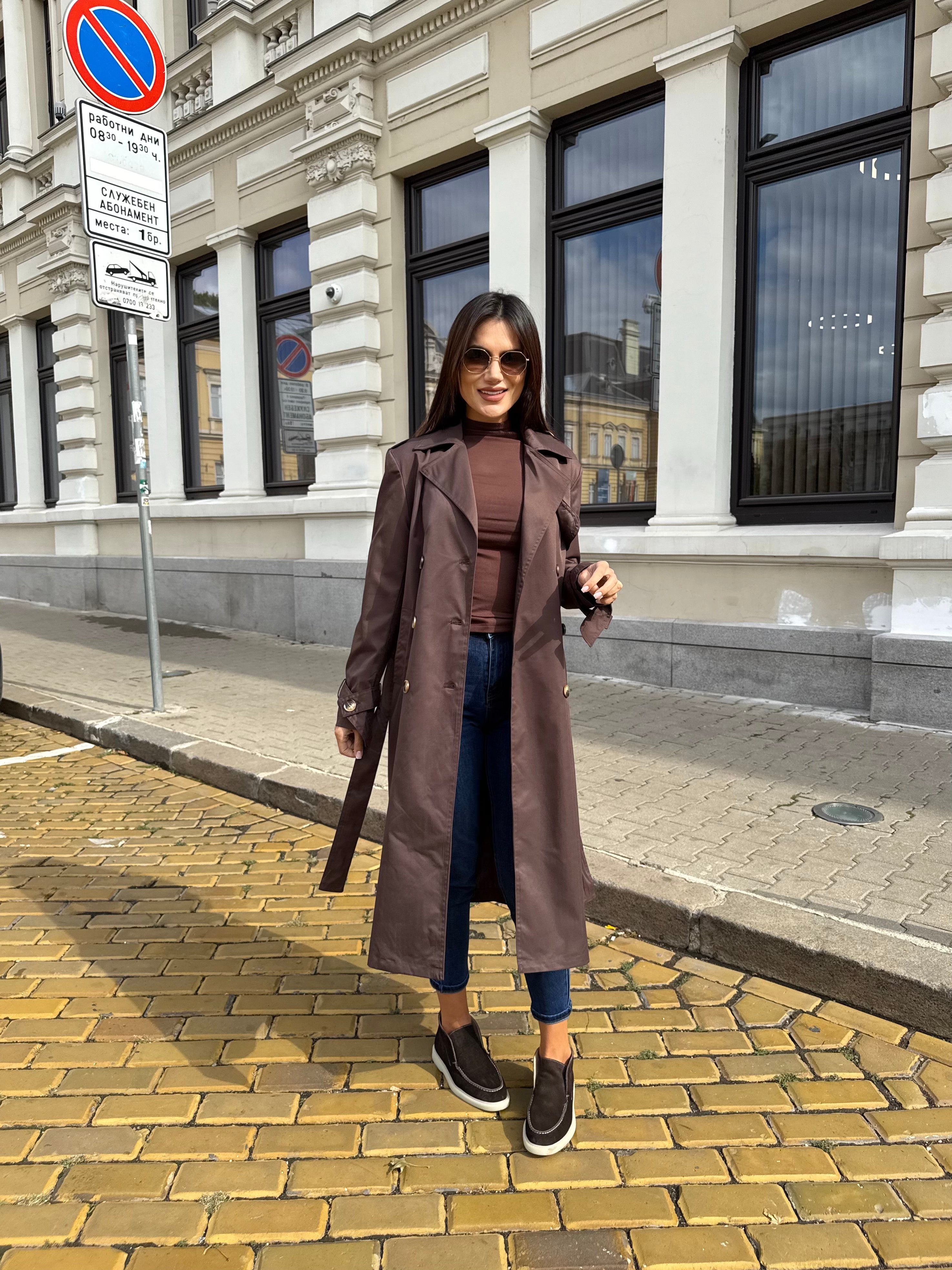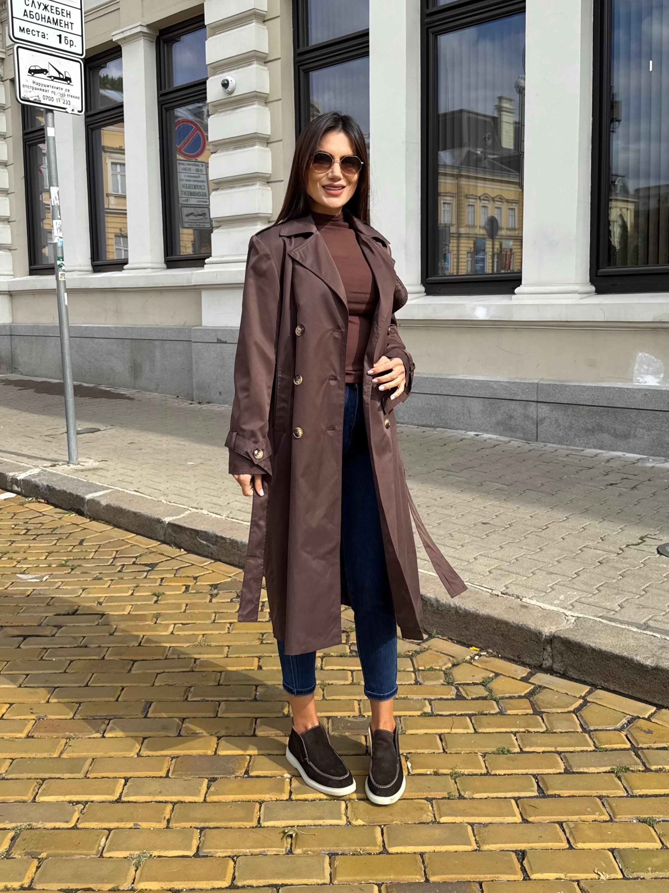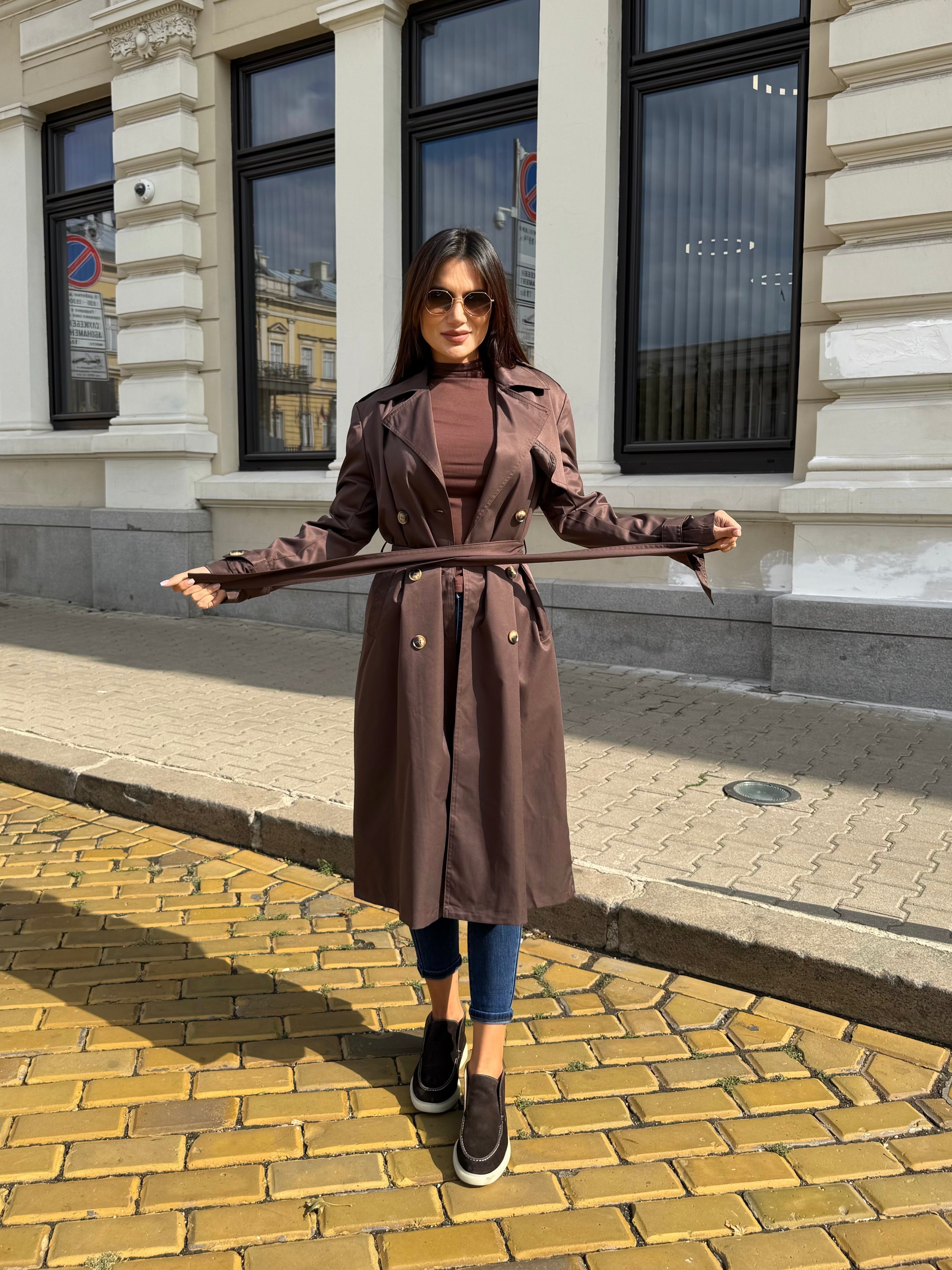 Elegant long trench coat with a classic silhouette and waist belt that highlights the figure and creates a refined look. The model features double-breasted fastening and a classic collar, making it a timeless piece for every wardrobe.