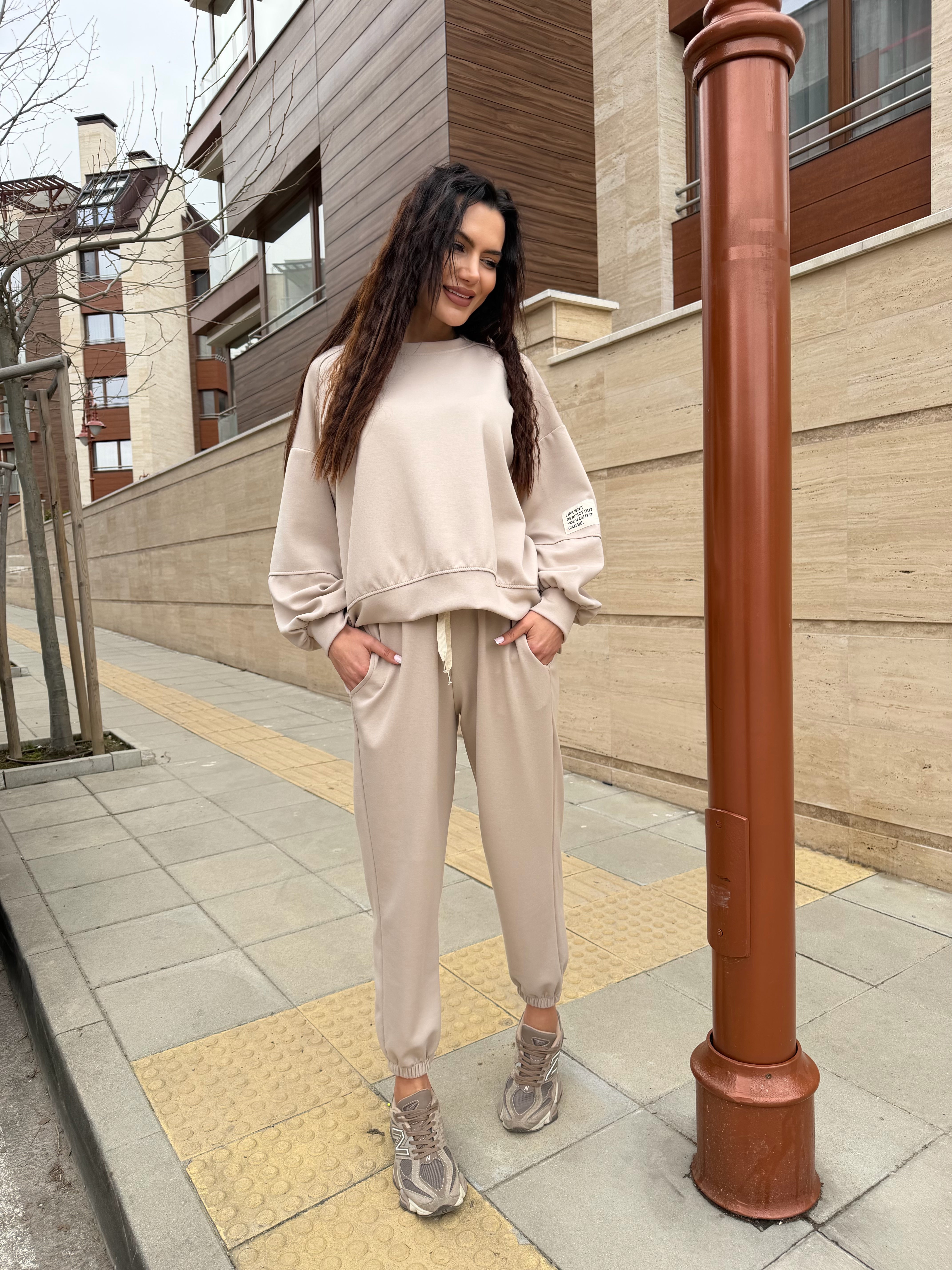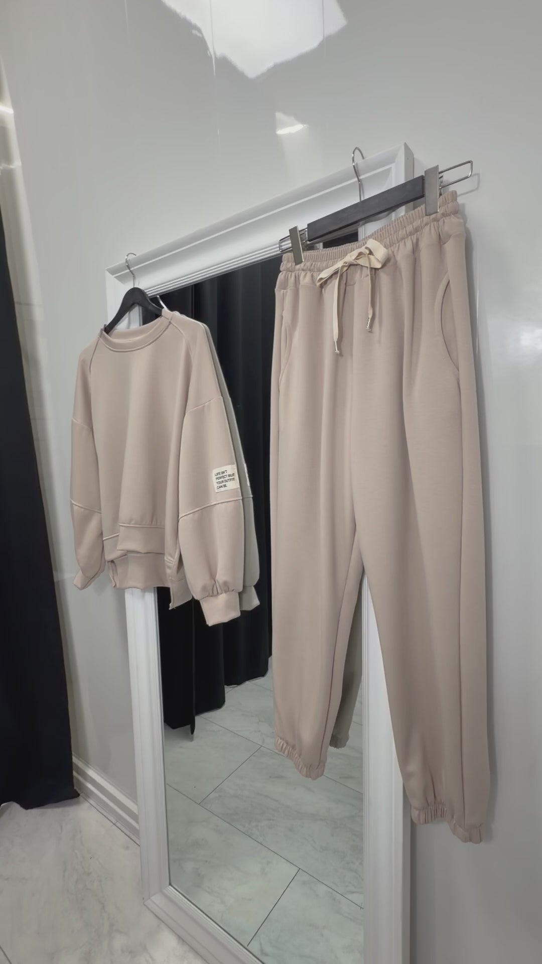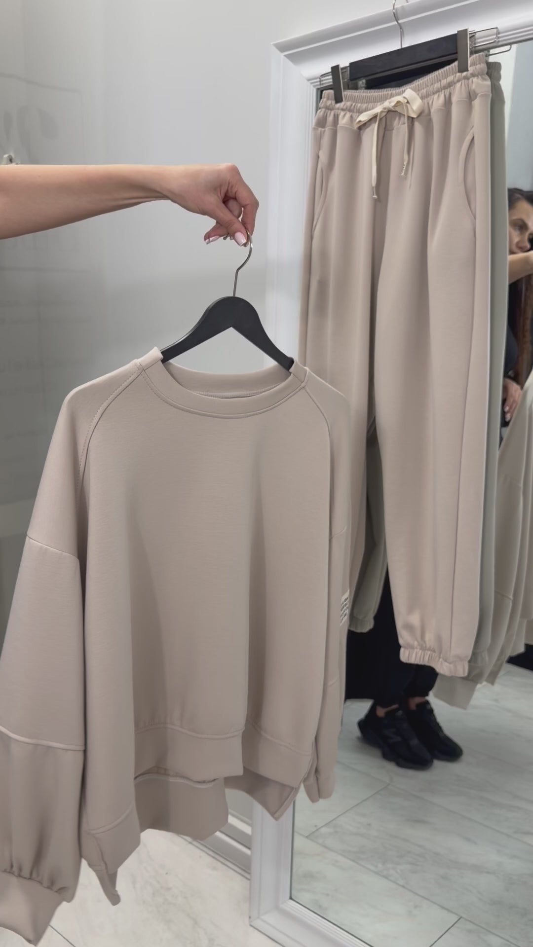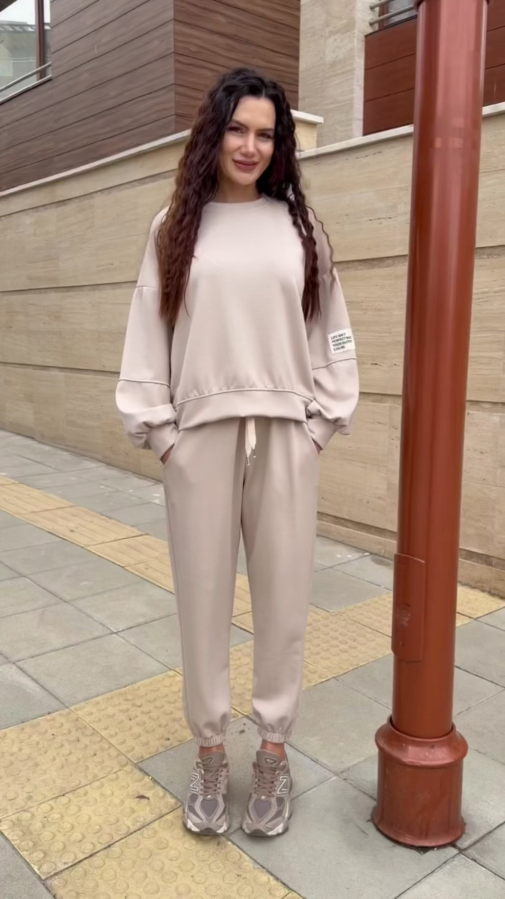 A relaxed oversized sweatshirt with dropped shoulders meets softly tailored joggers with a defined elastic waist — creating a silhouette that feels effortless yet refined.