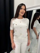 Елегантна дамска блуза с къс ръкав, декорирана с фини златисти сърца, които придават стилен и женствен акцент. Меката и еластична материя осигурява комфорт и красива линия по тялото.