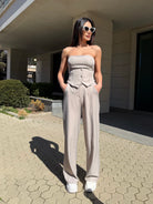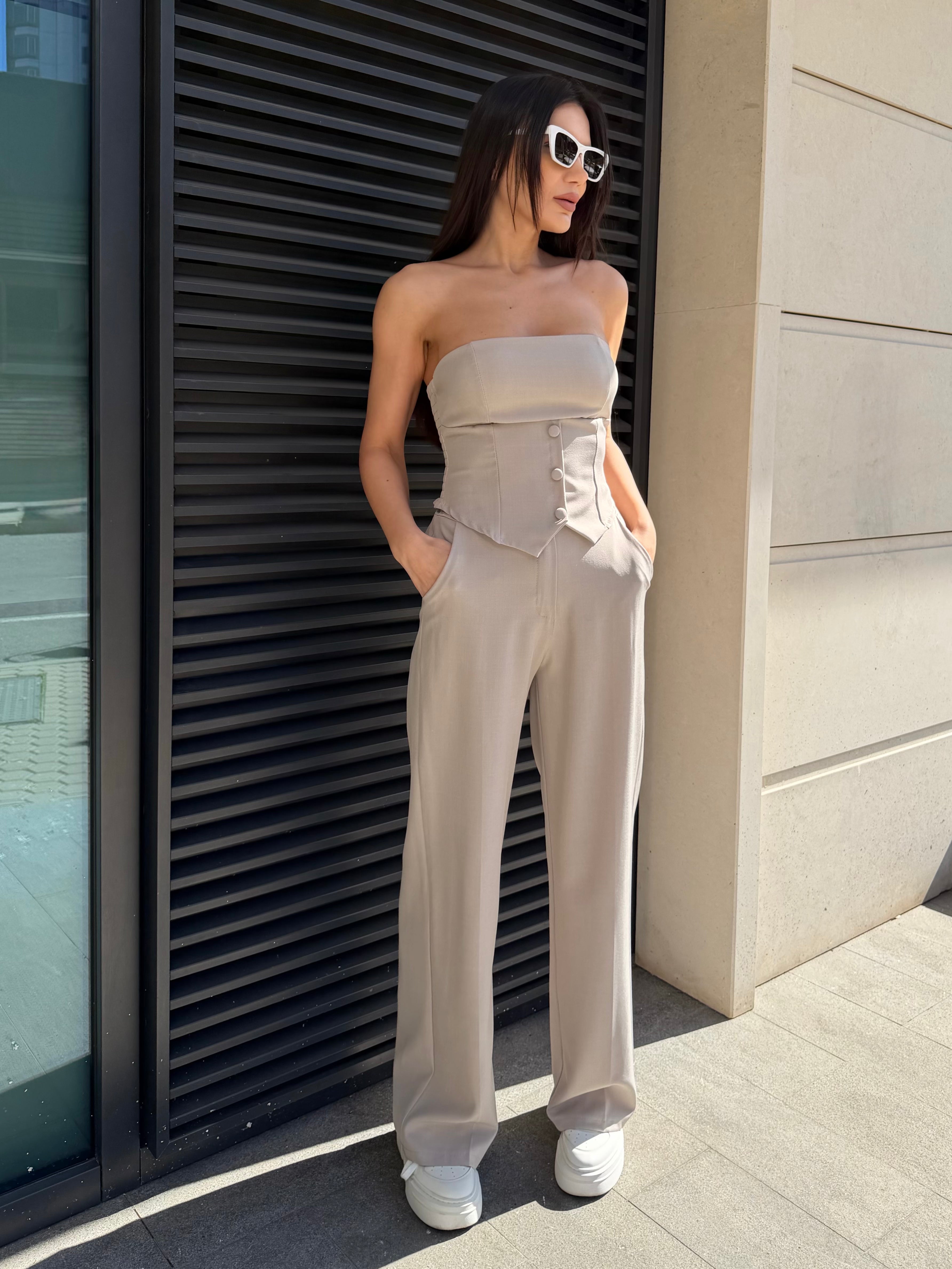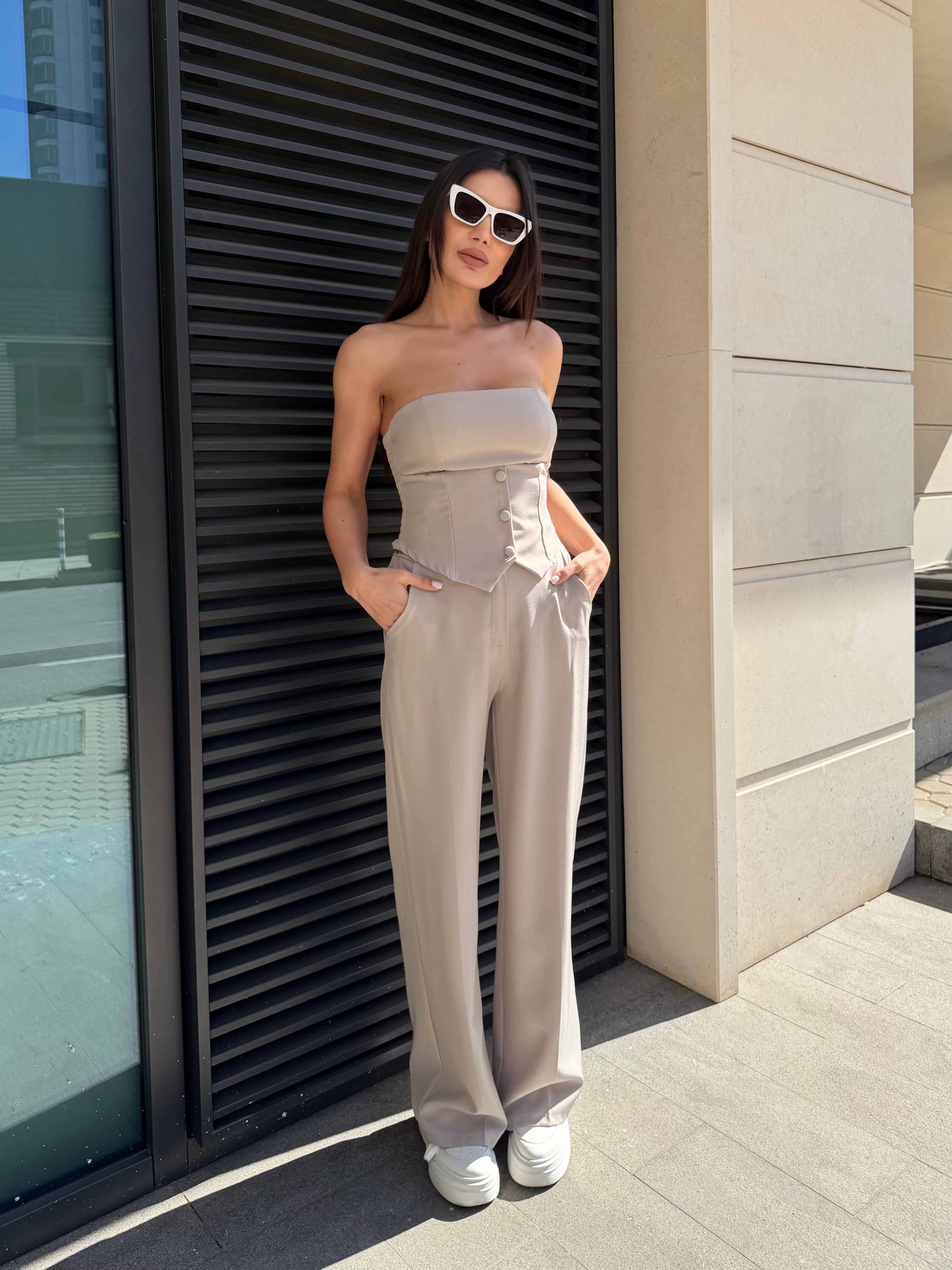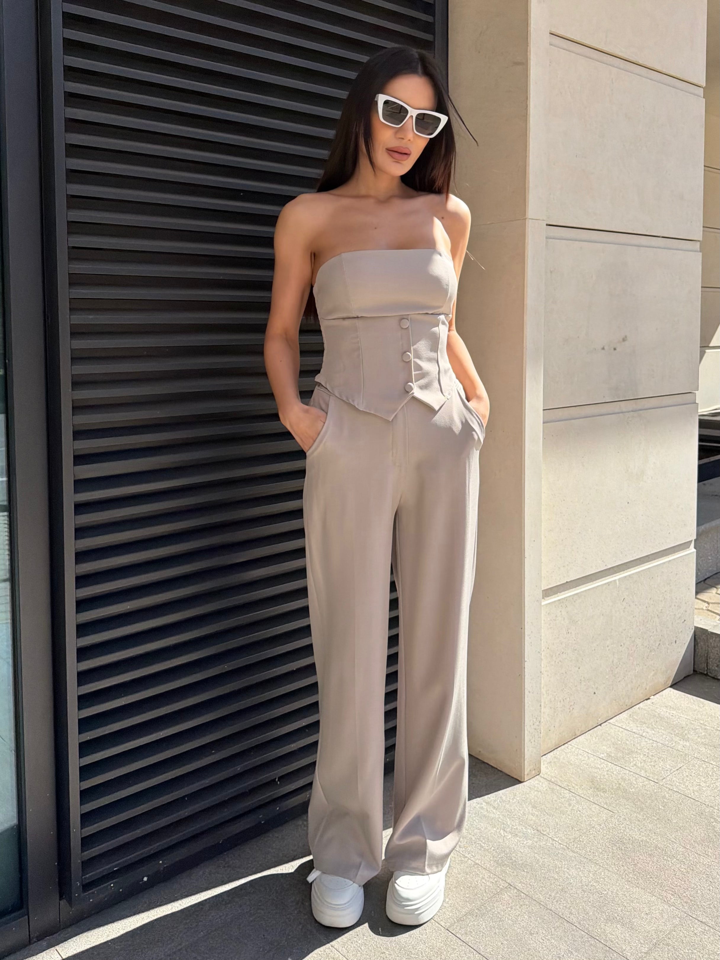 Елегантен дамски сет с бюстие тип корсет и панталон с висока талия, създаден да подчертае силуета и да придаде изтънчена женственост.