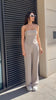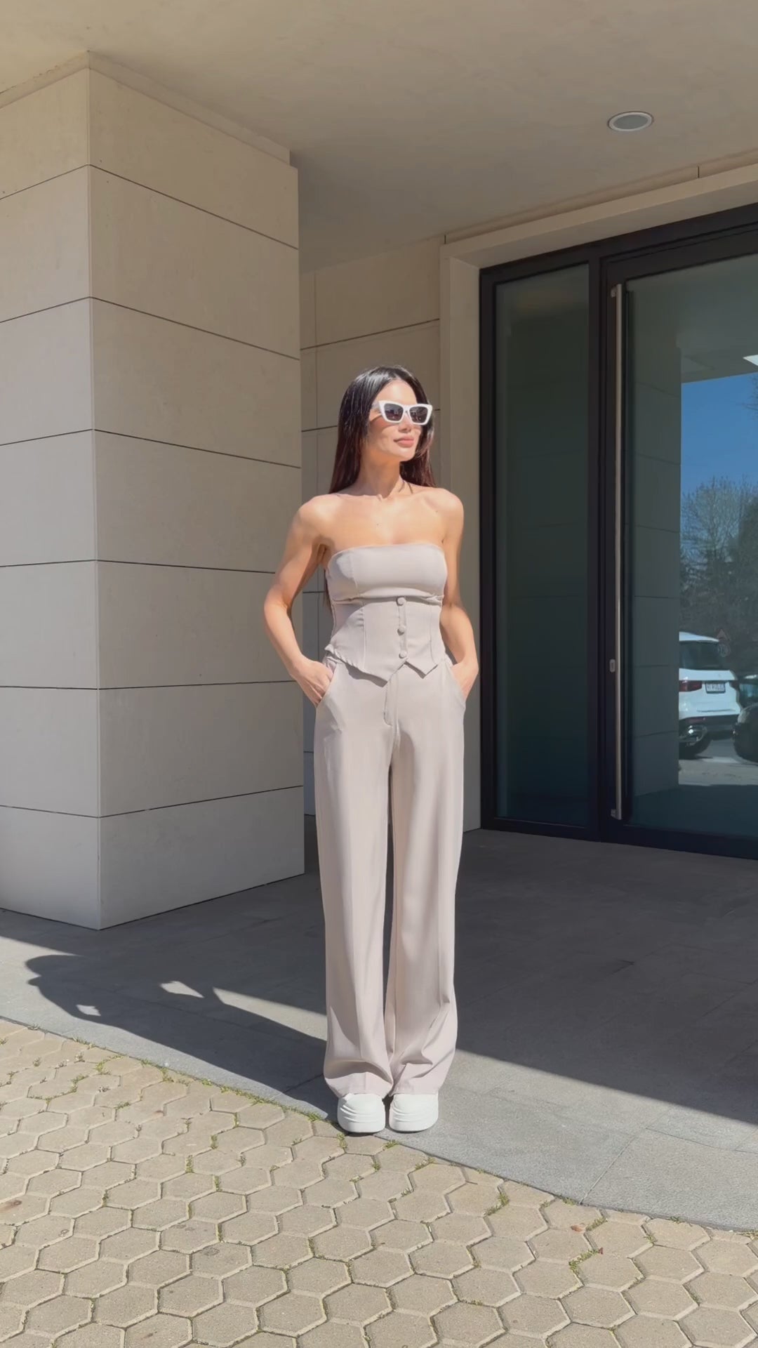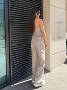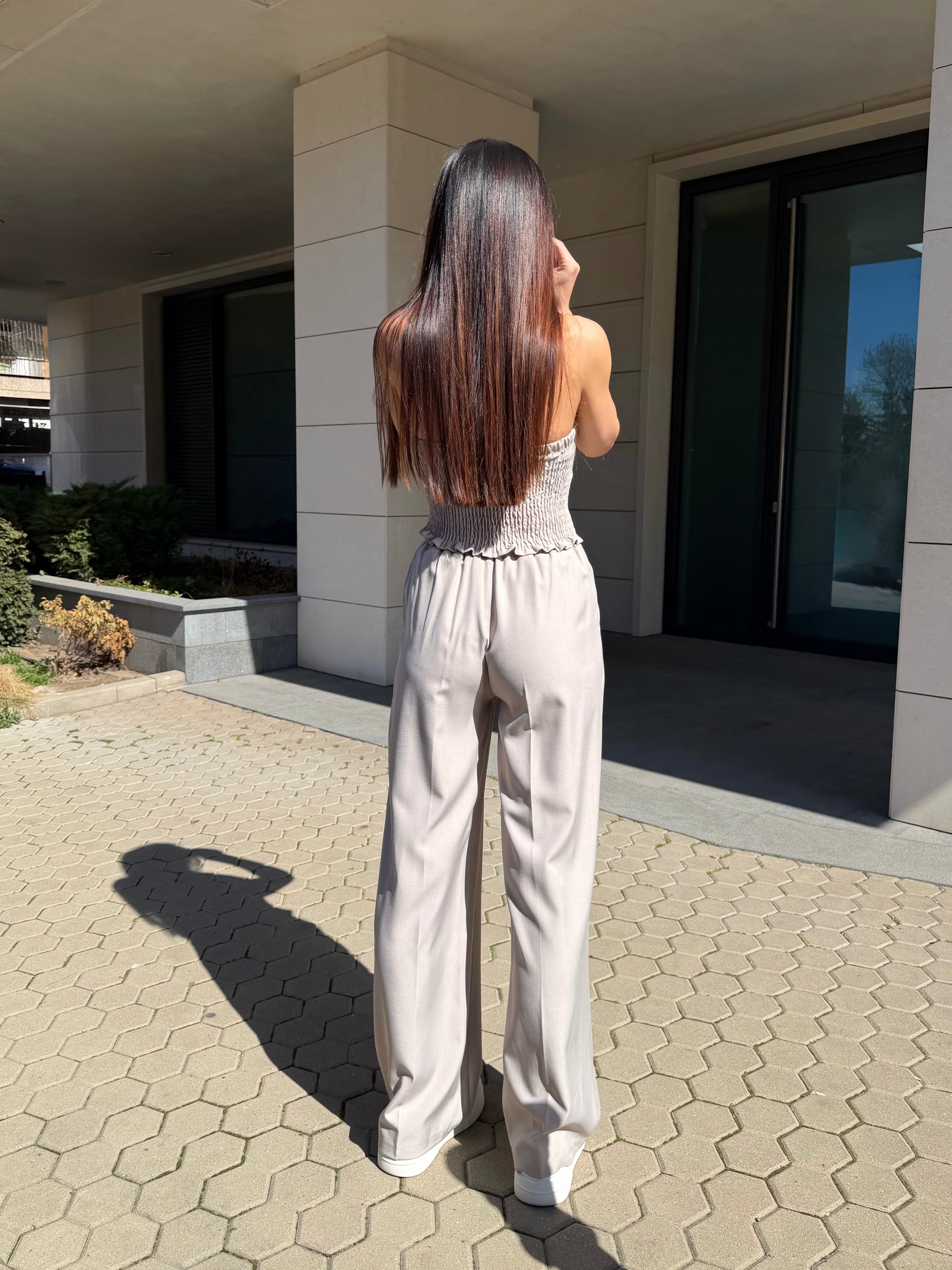 Бюстието оформя фигурата благодарение на еластичната задна част, а панталонът със свободна линия създава балансирана и модерна визия.