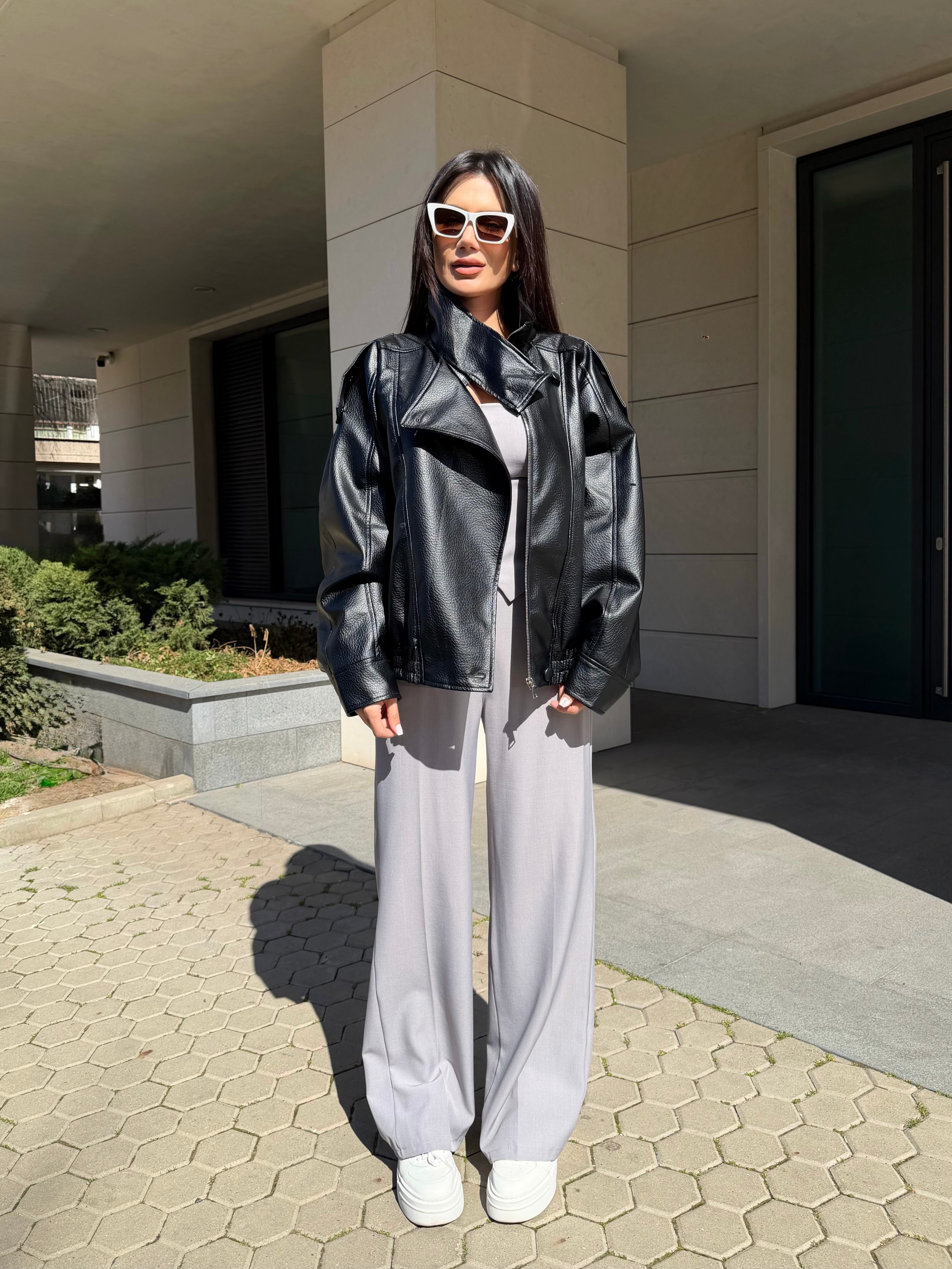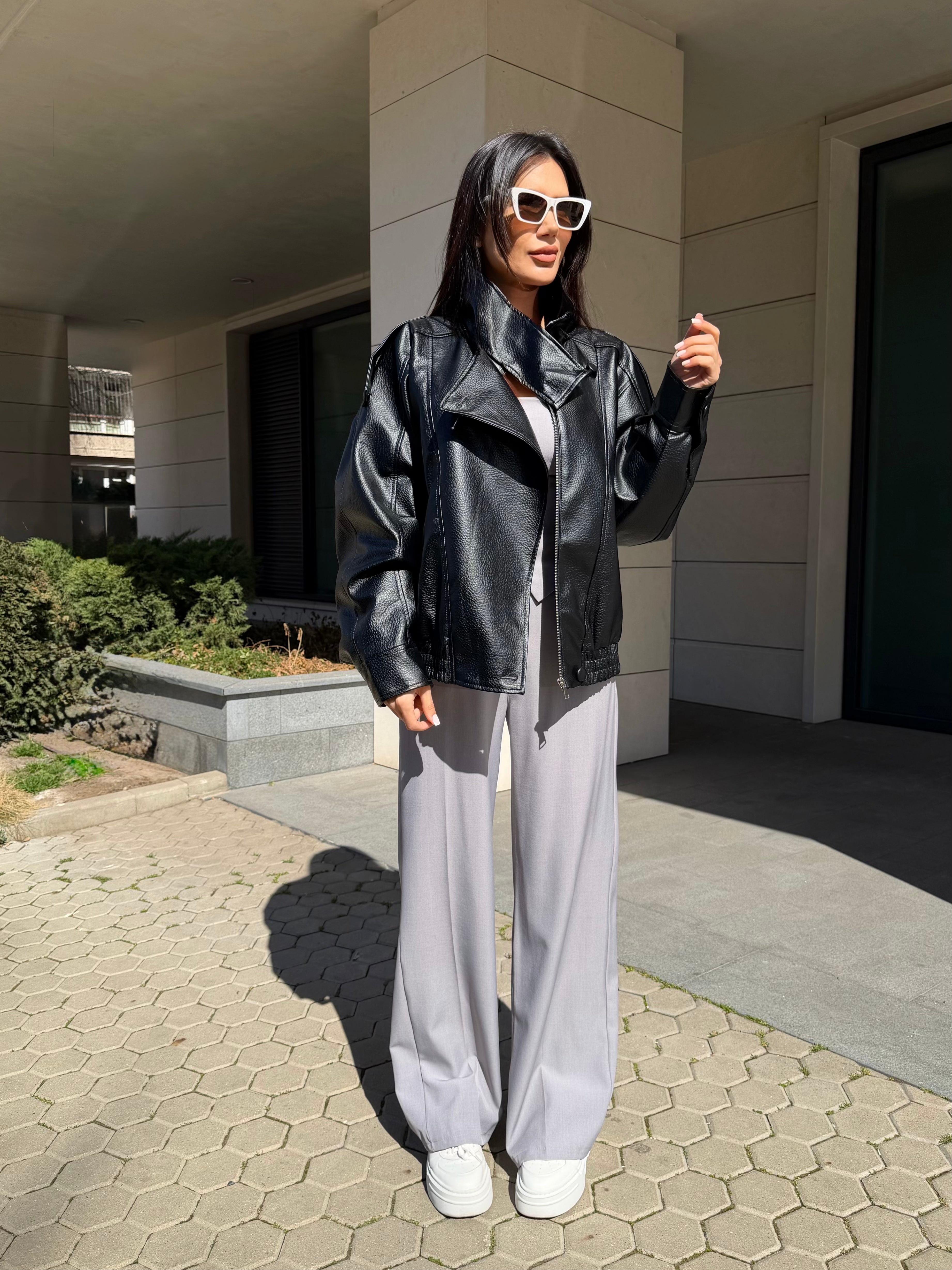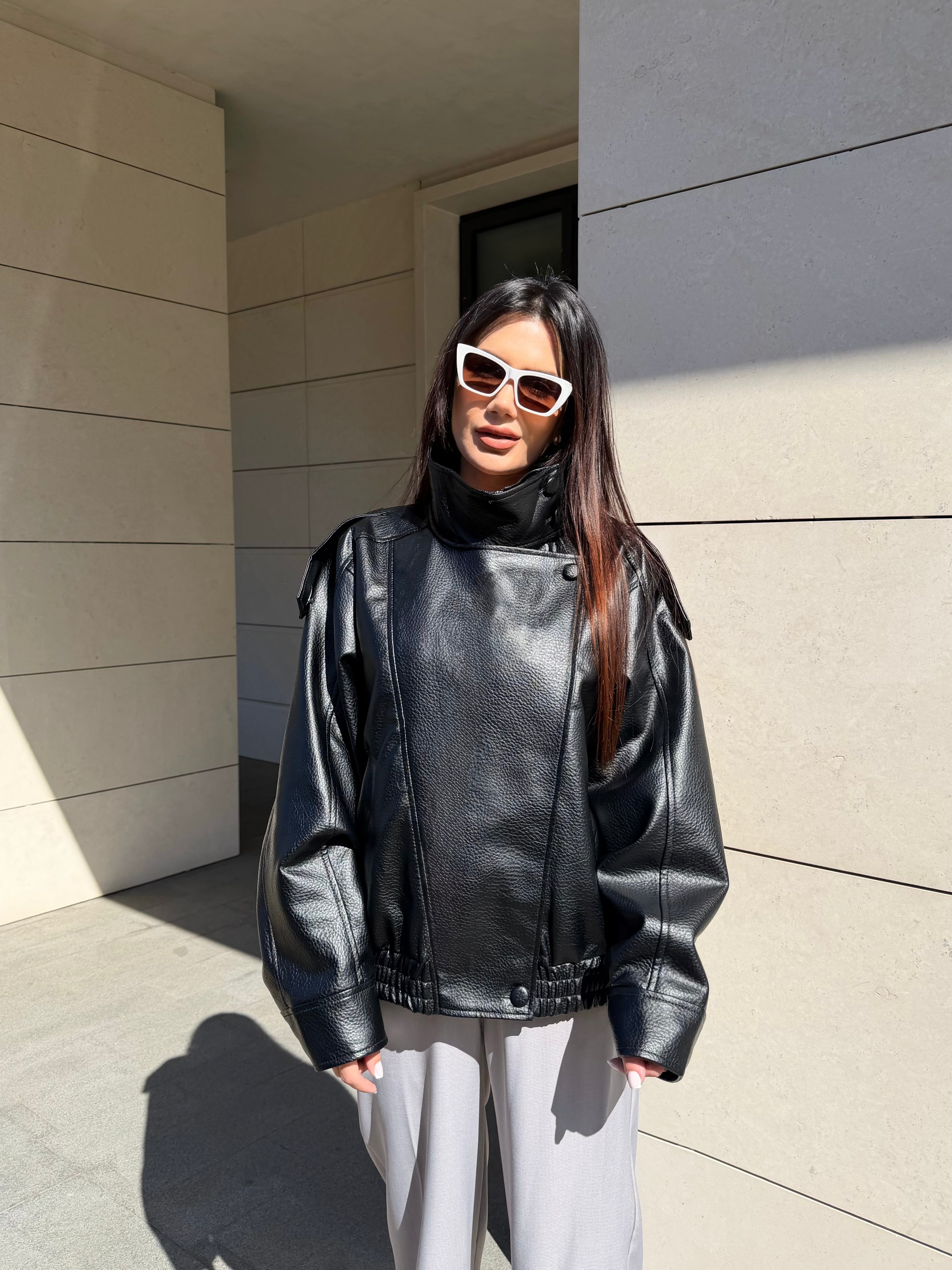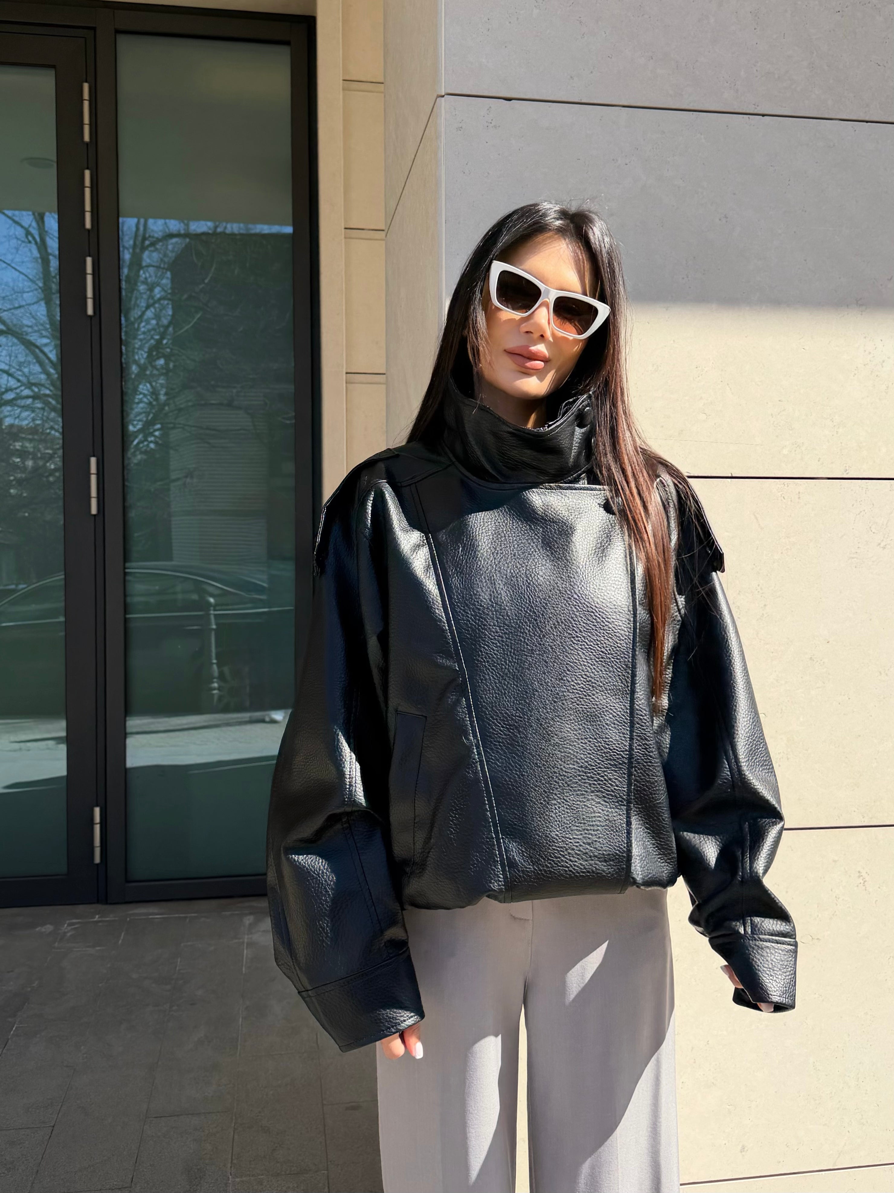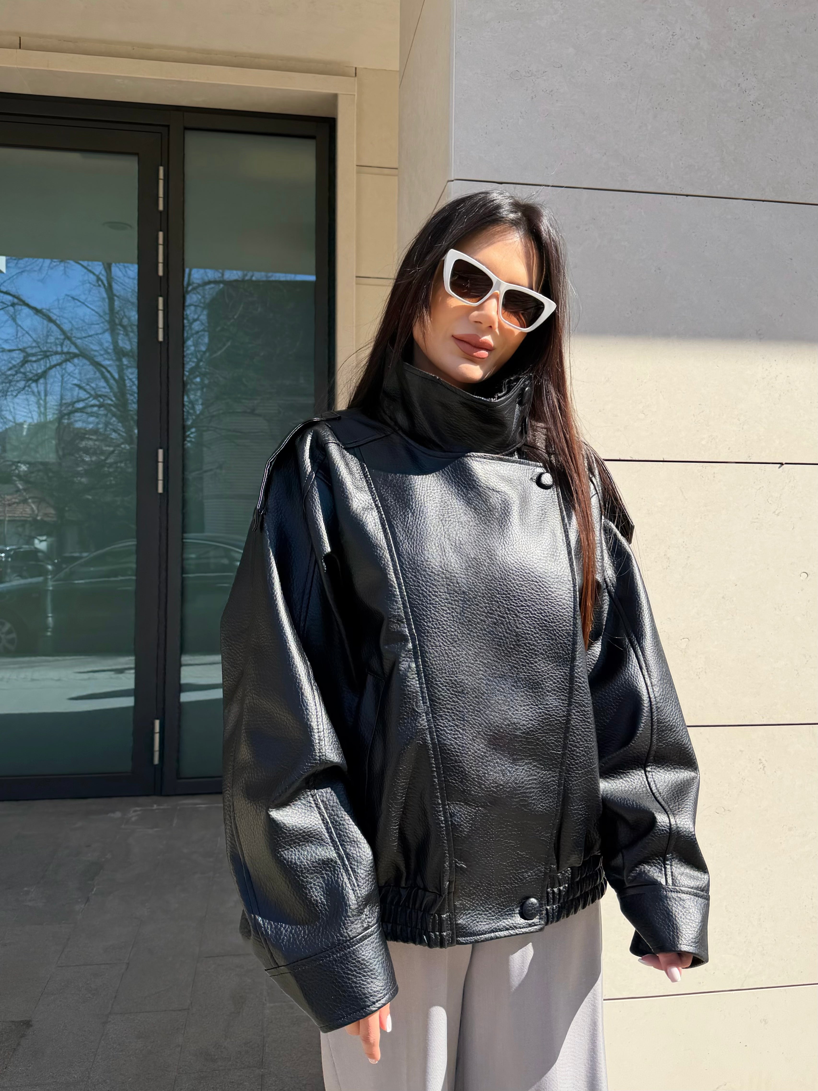 Модерно дамско кожено яке с oversize кройка и висока яка за силно и стилно излъчване. Меката еко кожа и обемният силует придават луксозен вид и комфорт при носене.