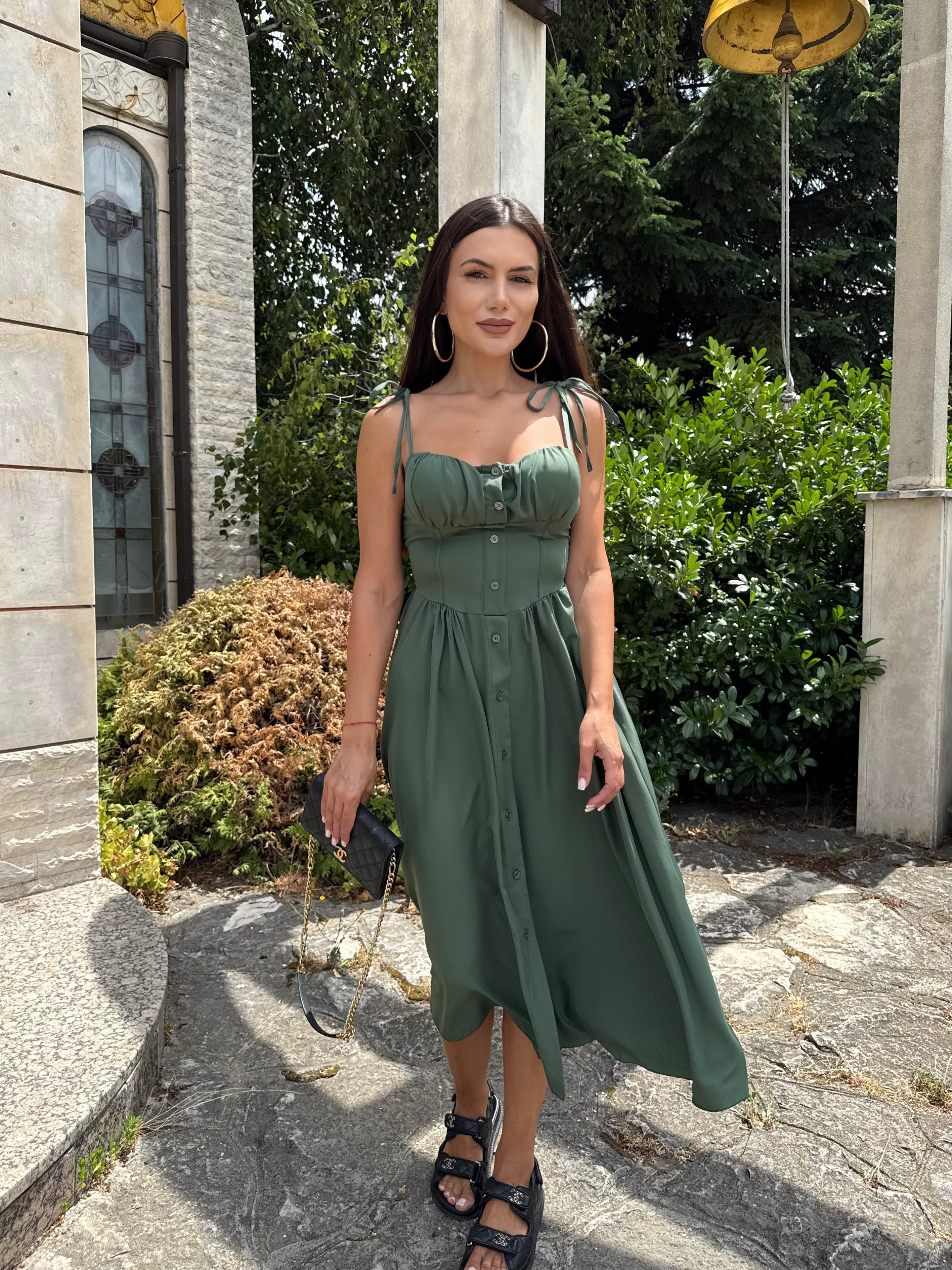 Ефирна, вталена и изключително женствена – MARINA е роклята, която подчертава силуета с лекота и финес. Маслено зеленият нюанс придава усещане за лукс и естествена елегантност, а прецизната кройка оформя талията и създава красива, издължена линия.