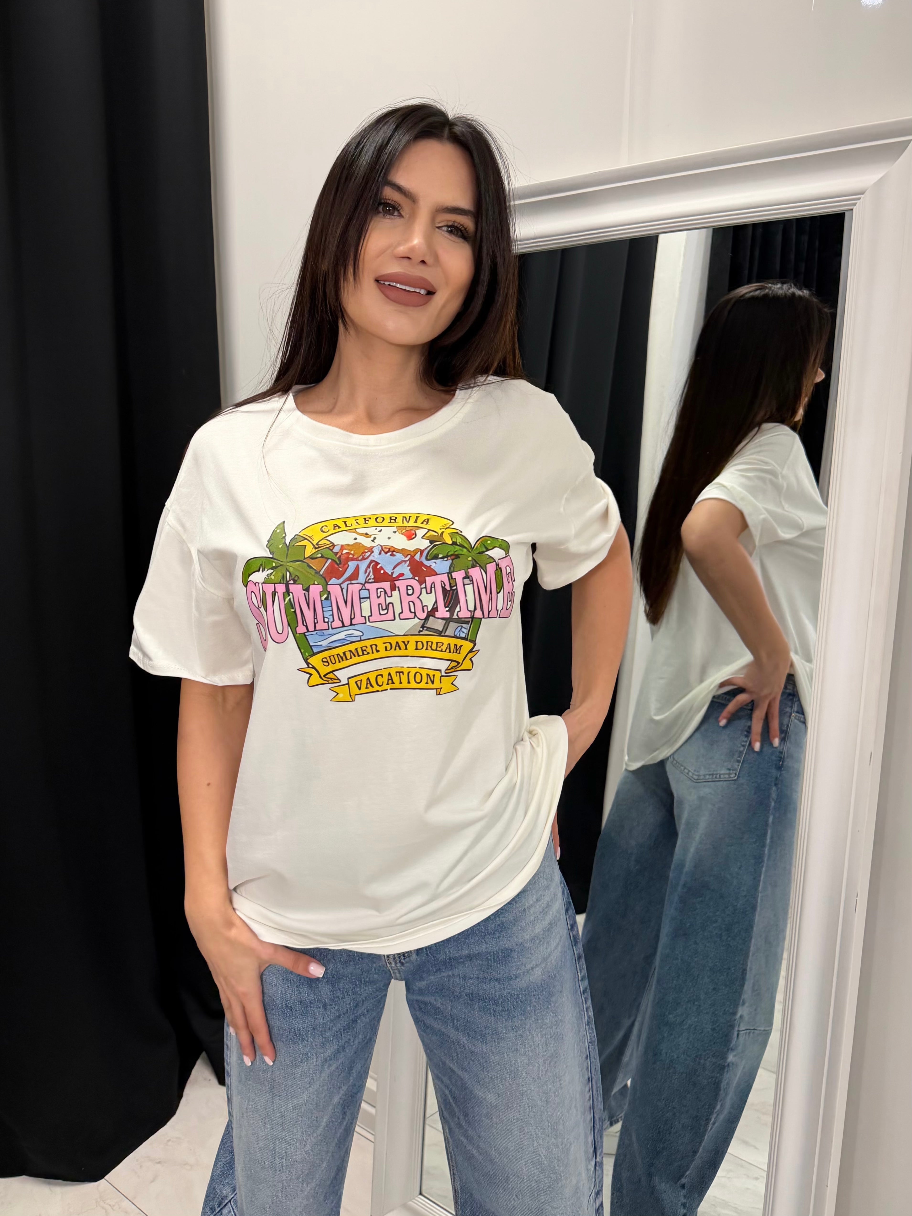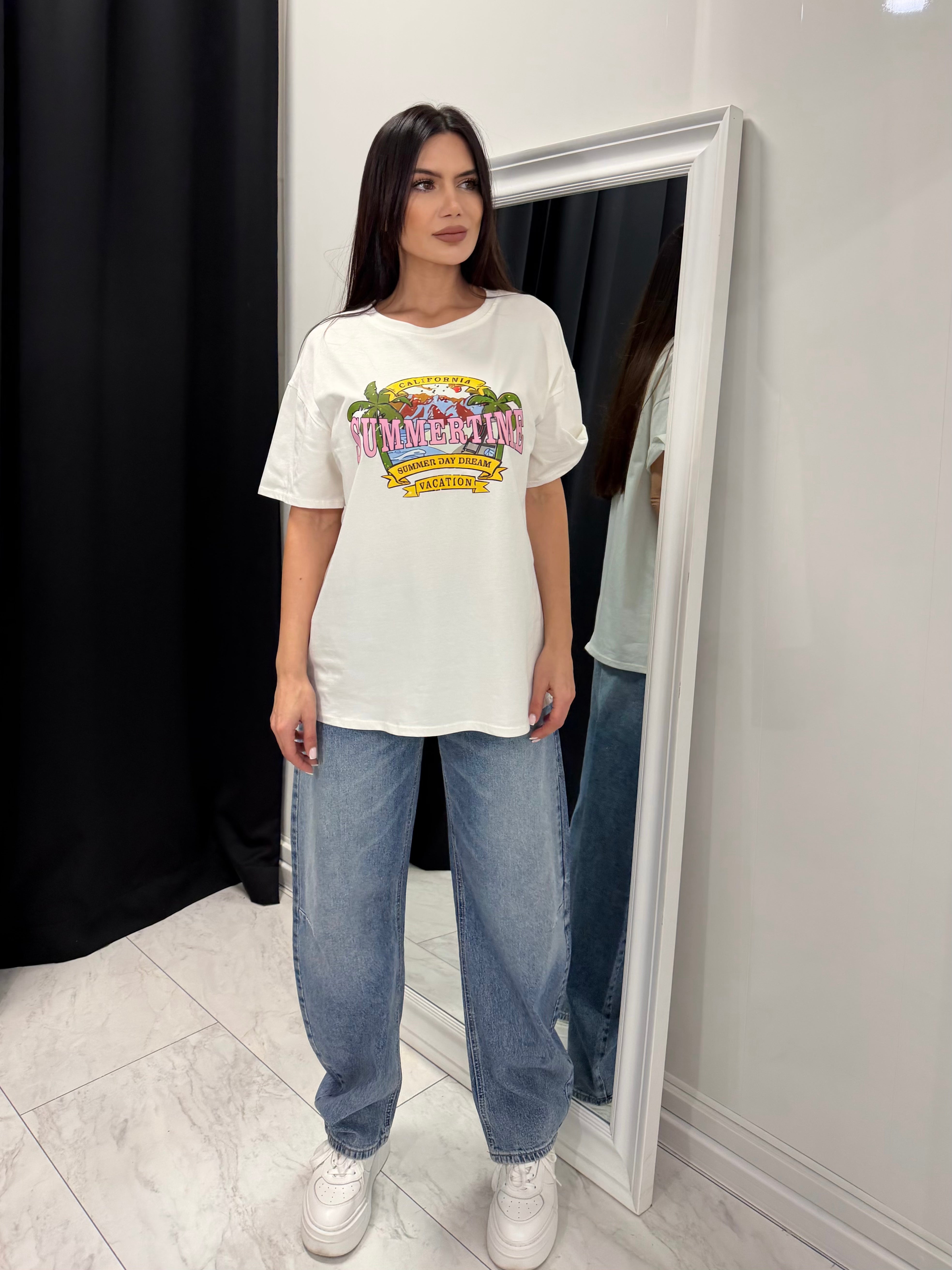 Oversized силуетът създава модерна и комфортна визия, а цветният принт с надпис “Summertime – Summer Day Dream – Vacation” придава свежо ваканционно настроение.