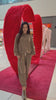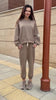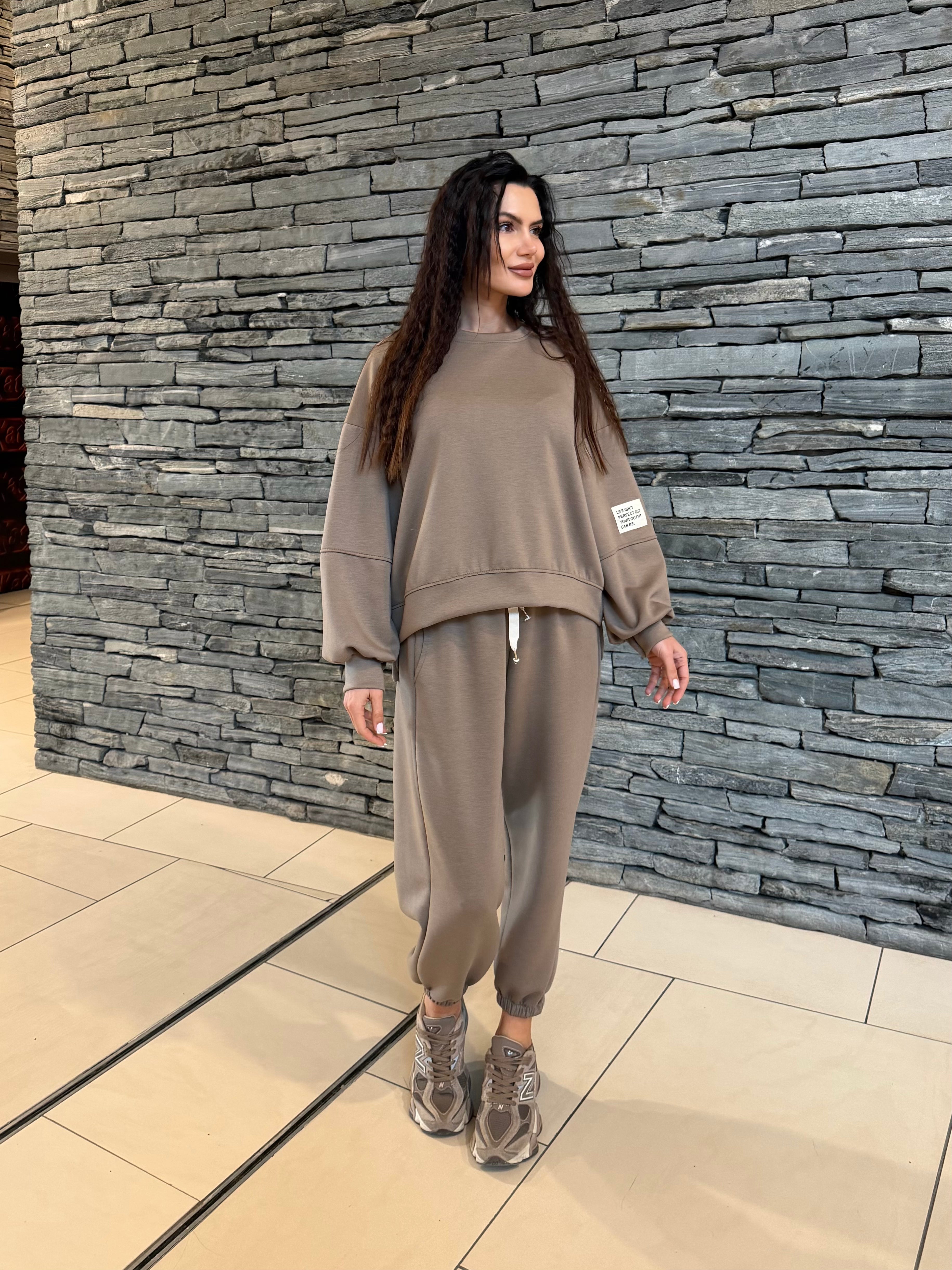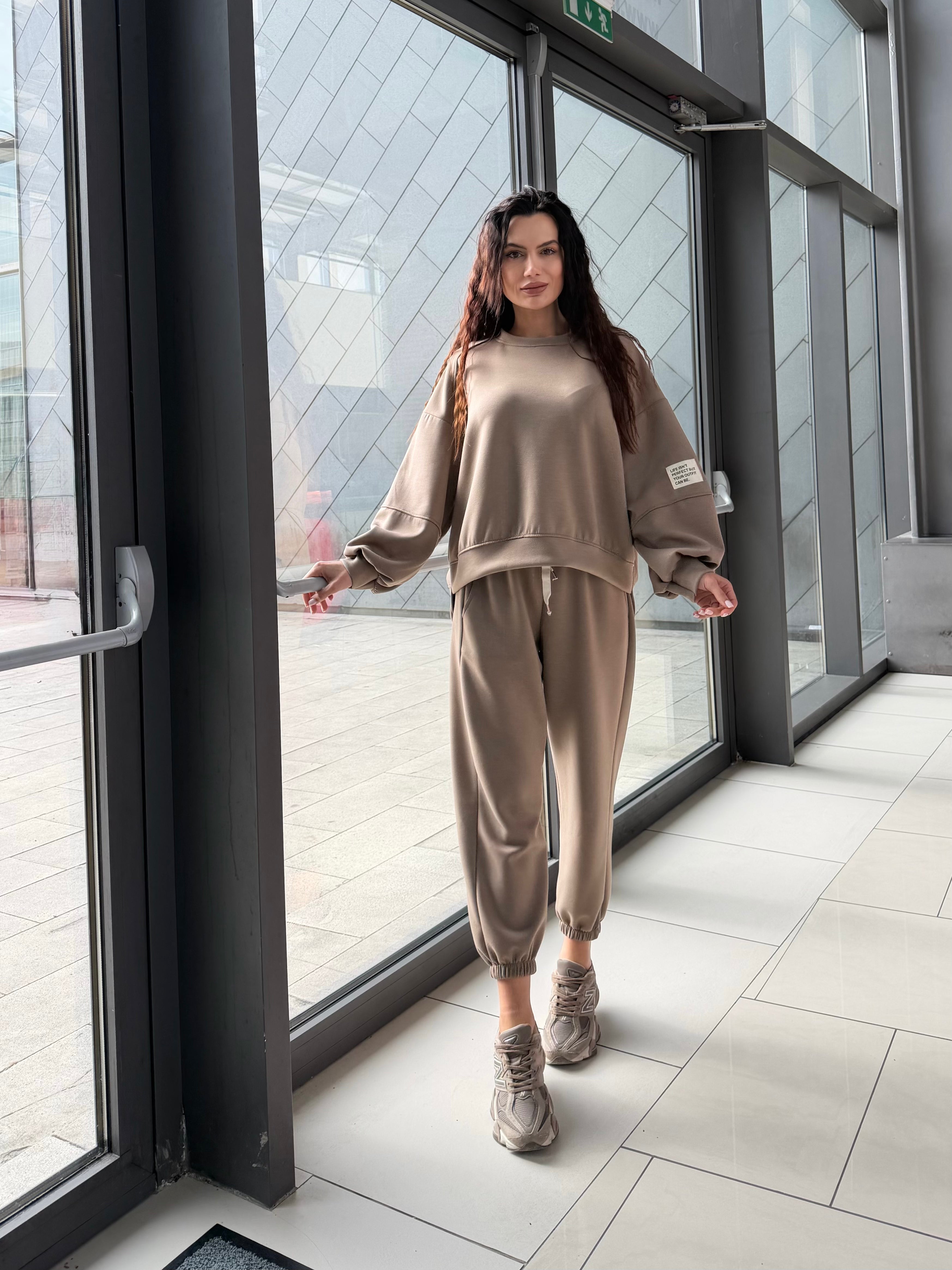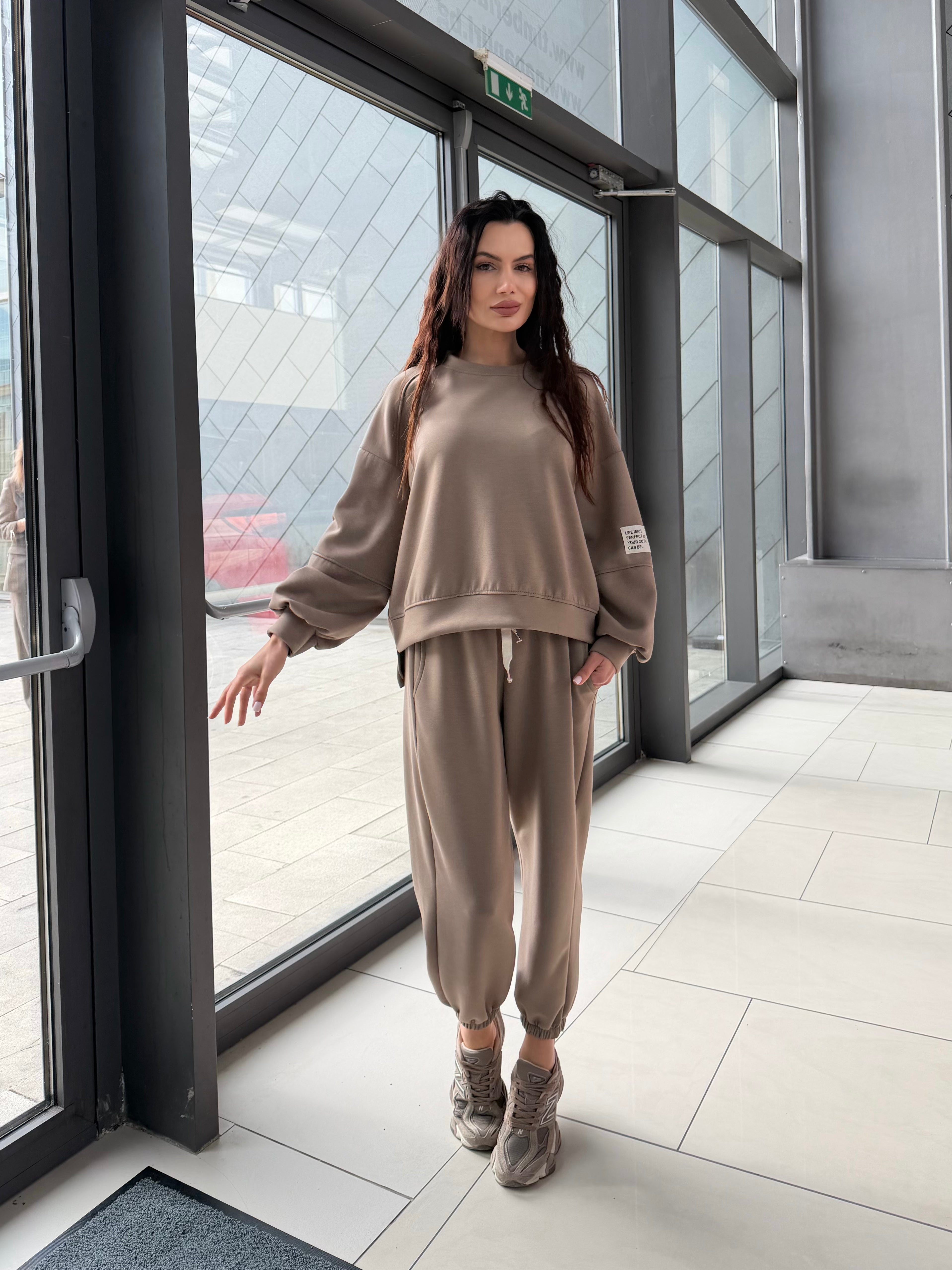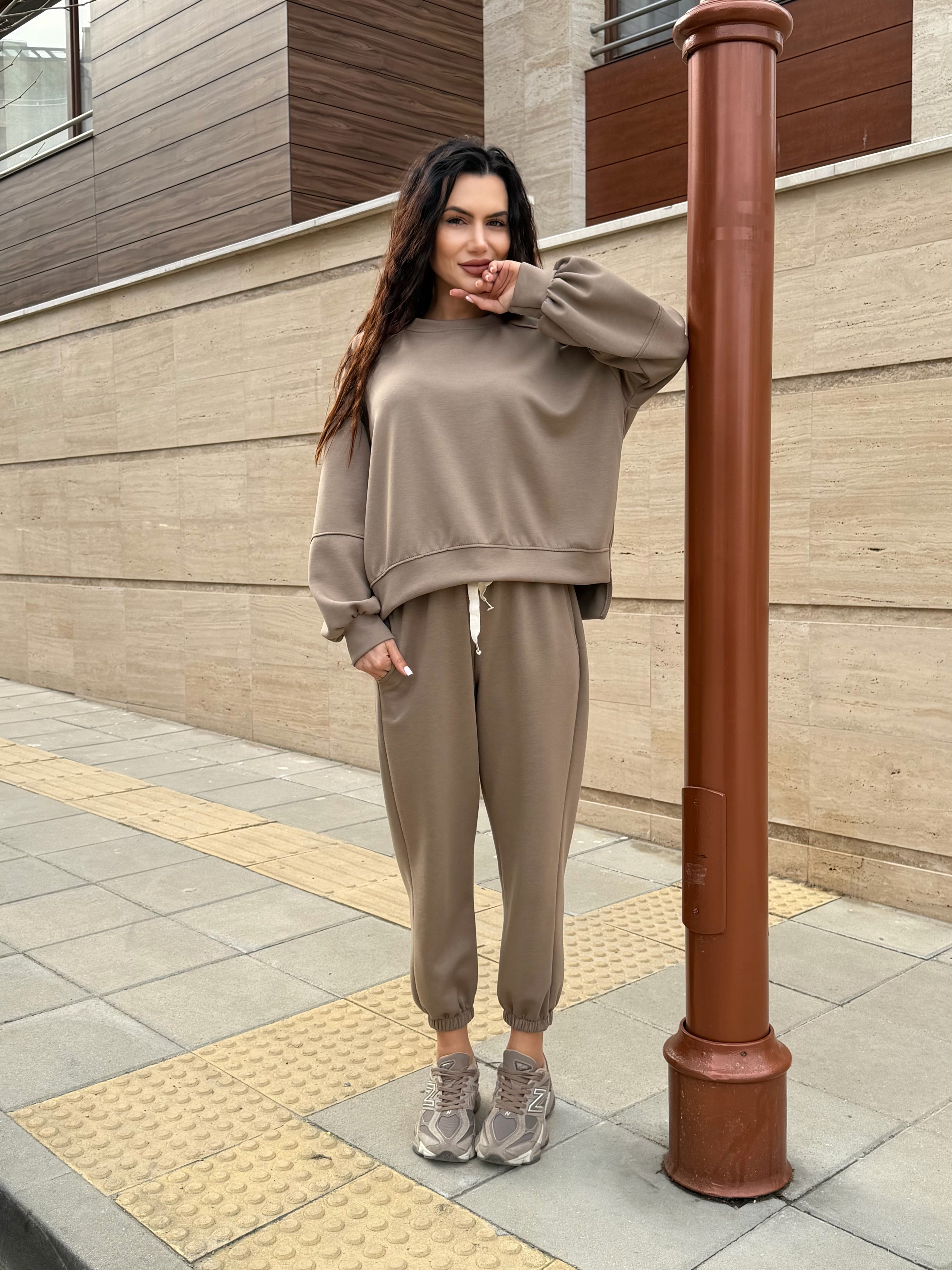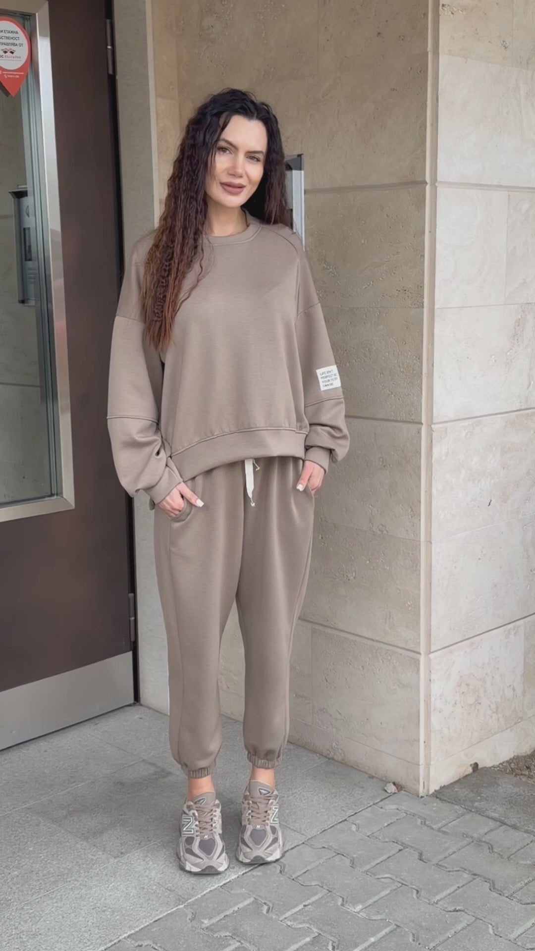 Свободната линия на горната част с паднали рамене и обемни ръкави създава модерна, градска визия, а панталонът с еластична талия оформя балансиран и издължен силует.