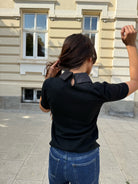 BLUZA CHIC cu mâneci scurte, decolteu rotund, confecționată din material fin tricotat la mașină.