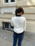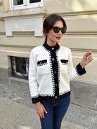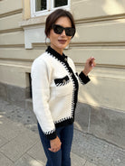 Cardigan de damă cu croială lejeră și buzunare exterioare în față. Accentul este realizat cu fir auriu.