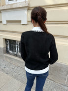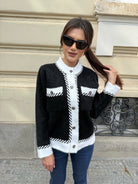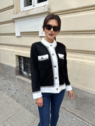 Cardigan de damă cu croială lejeră și buzunare exterioare în față. Accentul este realizat cu fir auriu.