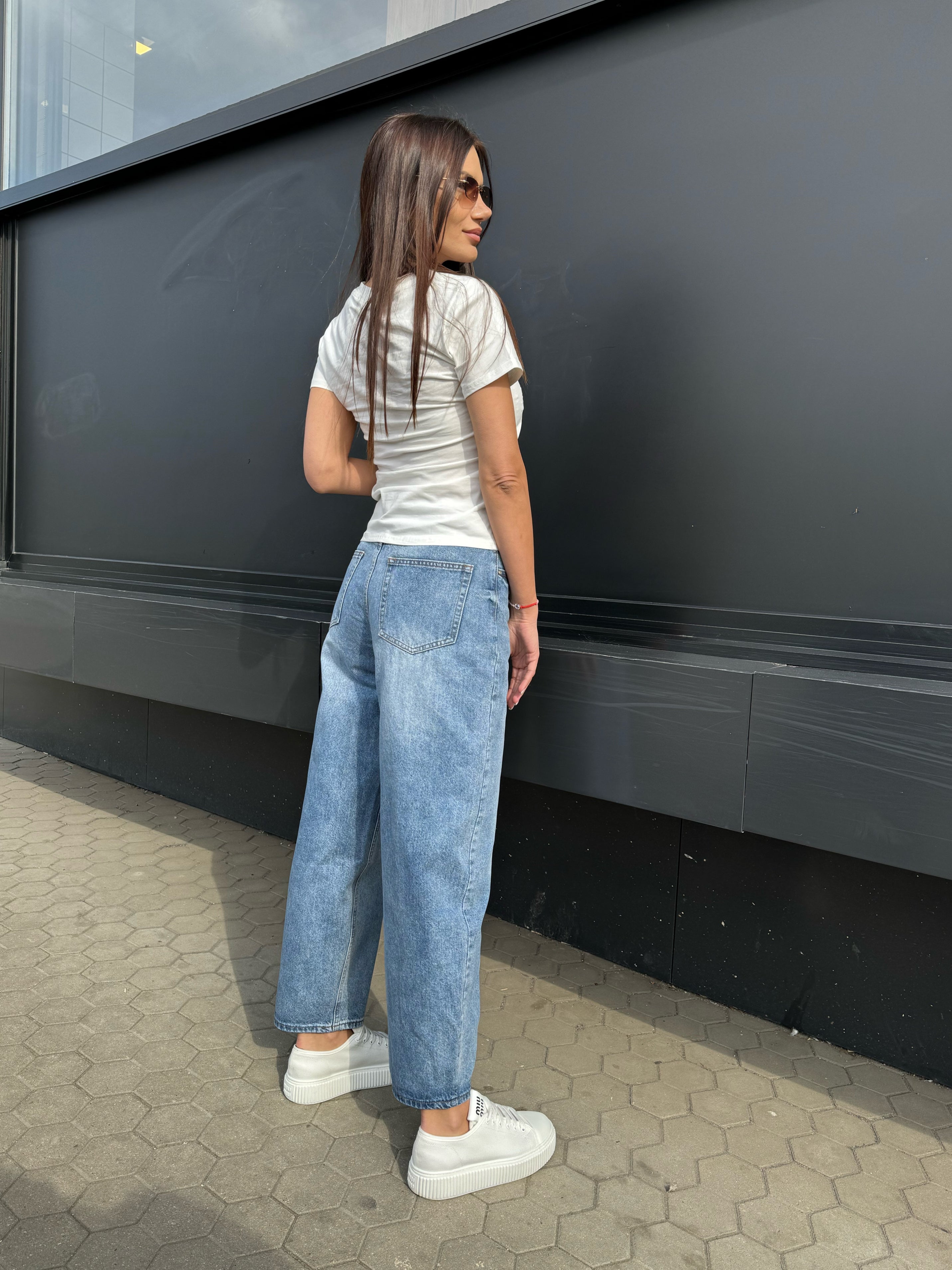MODEL Blugi tip balon într-o culoare albastră elegantă, cu o curea asortată.
