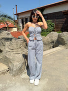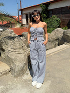 Stil estival și eleganță casual – acesta este setul „Stripe Breeze” . Acesta este alcătuit dintr-un top crop fără bretele cu legături spectaculoase în față și pantaloni largi cu talie înaltă și dungi verticale subtile care alungesc silueta. Potrivit atât pentru o plimbare la mare, cât și pentru o zi de vară în oraș.