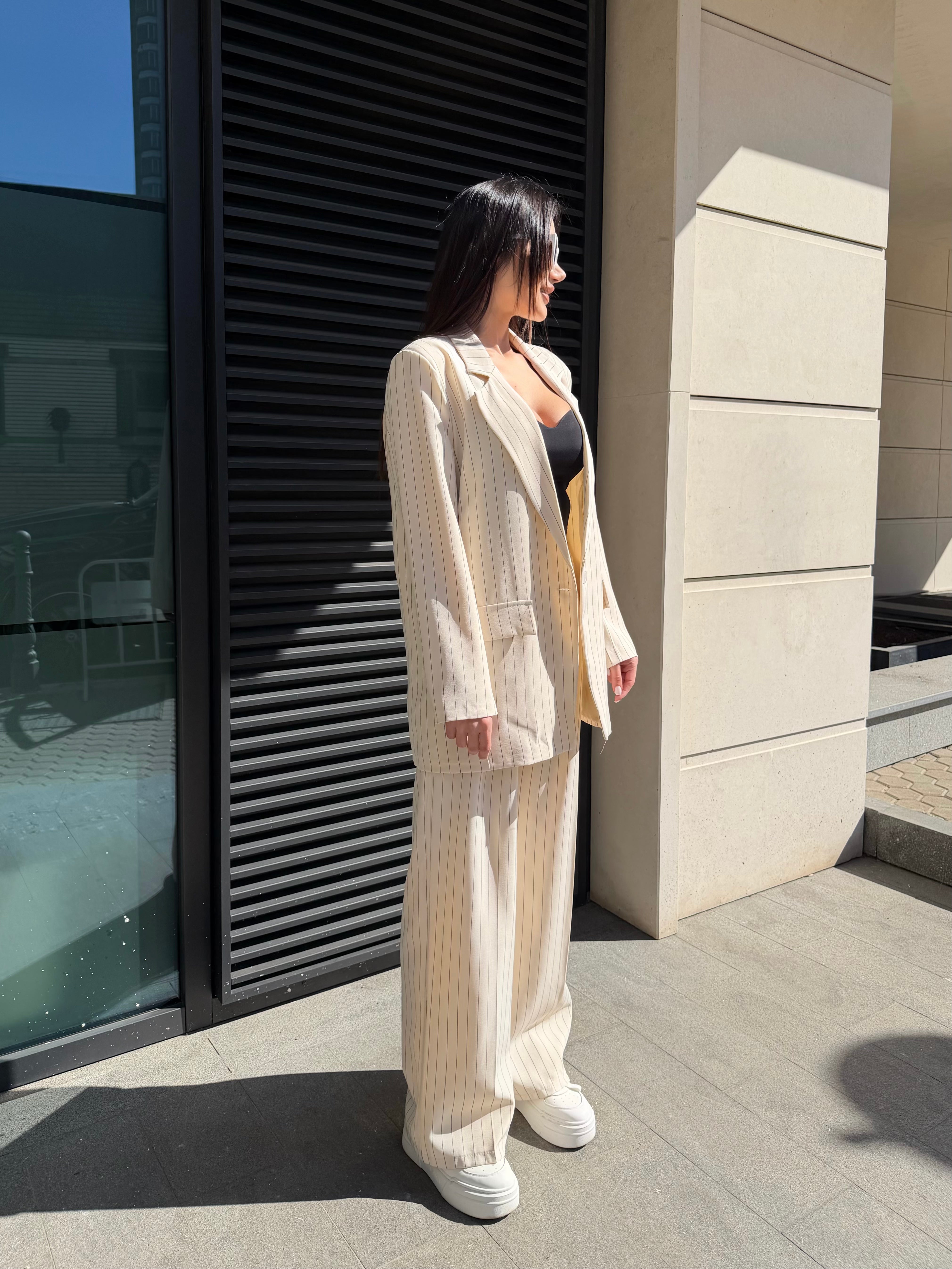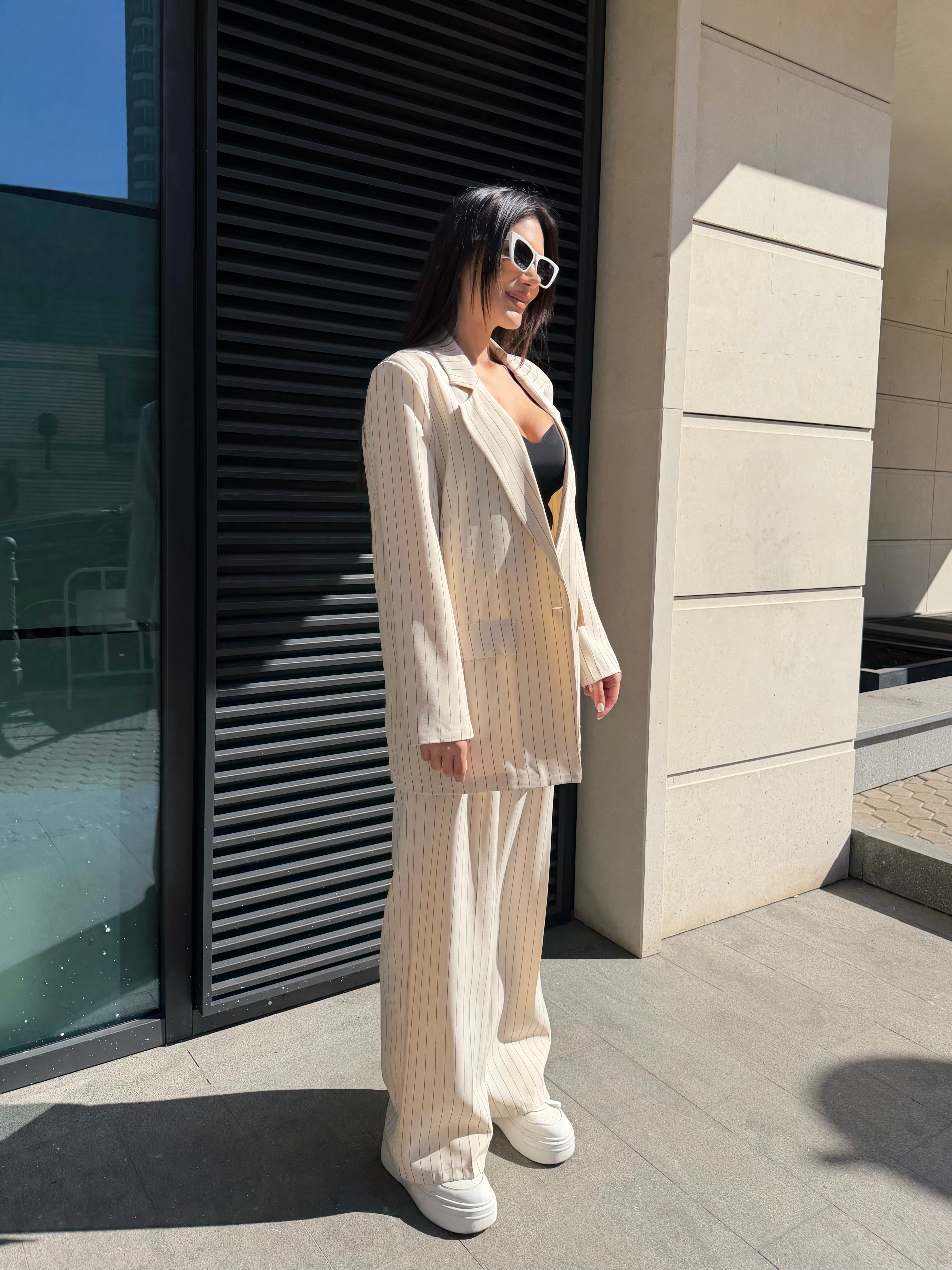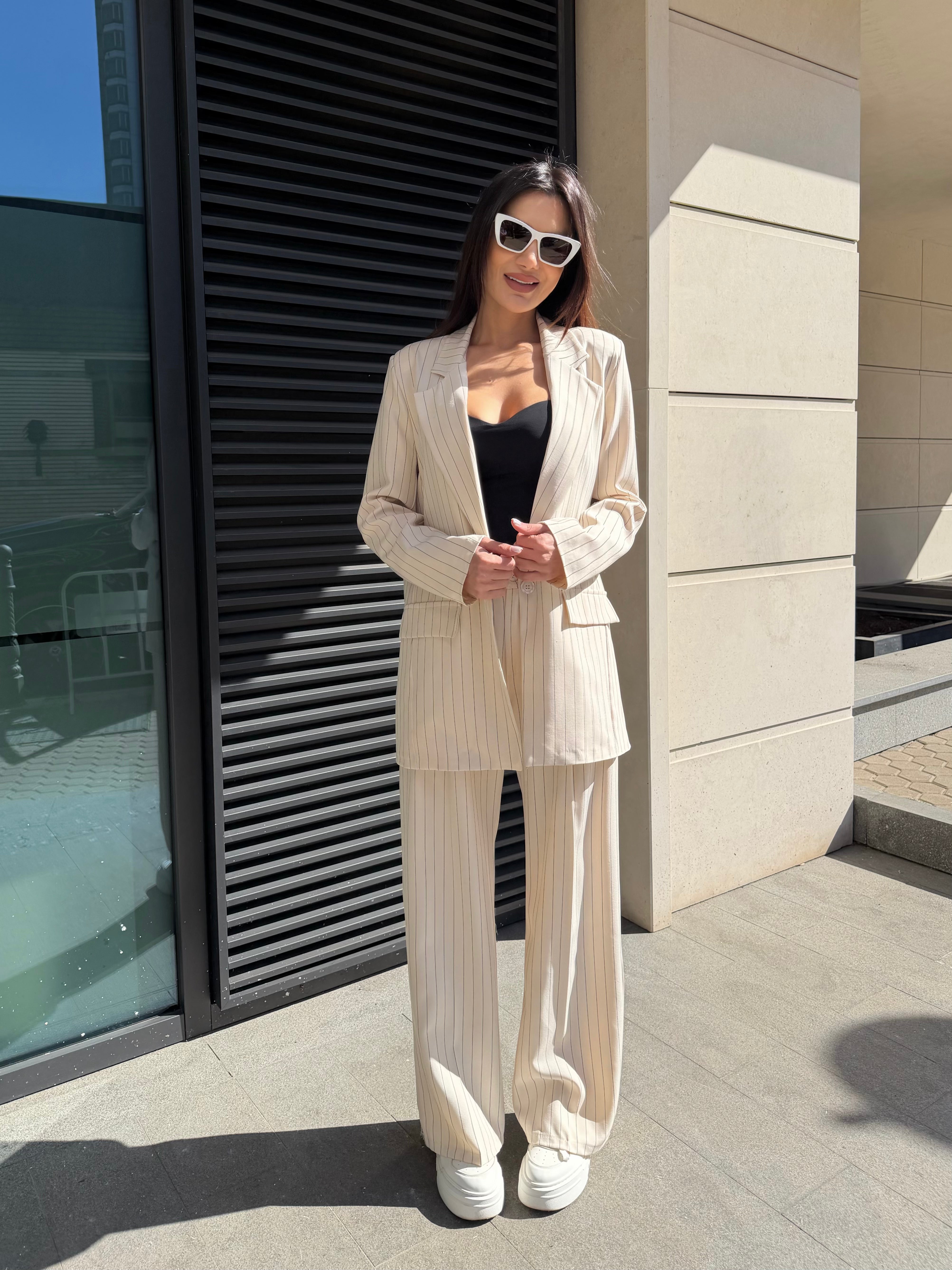 Елегантен дамски костюм от две части, състоящ се от сако и панталон с модерна свободна кройка. Фините вертикални райета придават изтънчен и стилен вид, който издължава силуета.