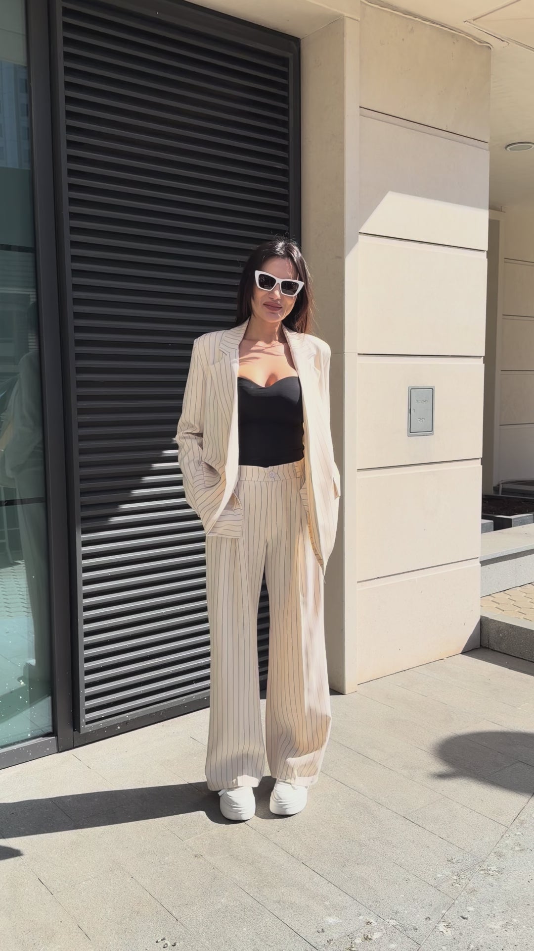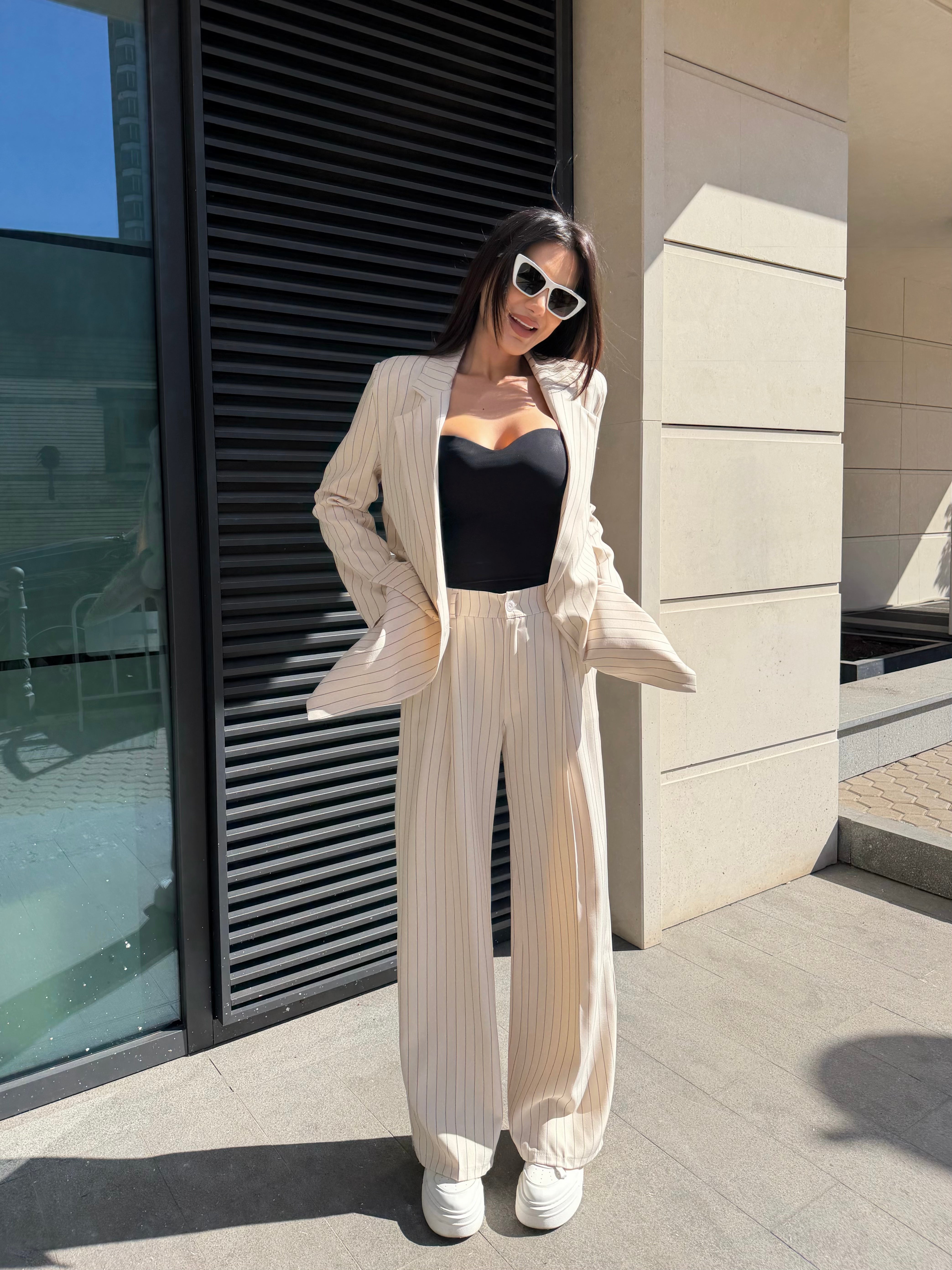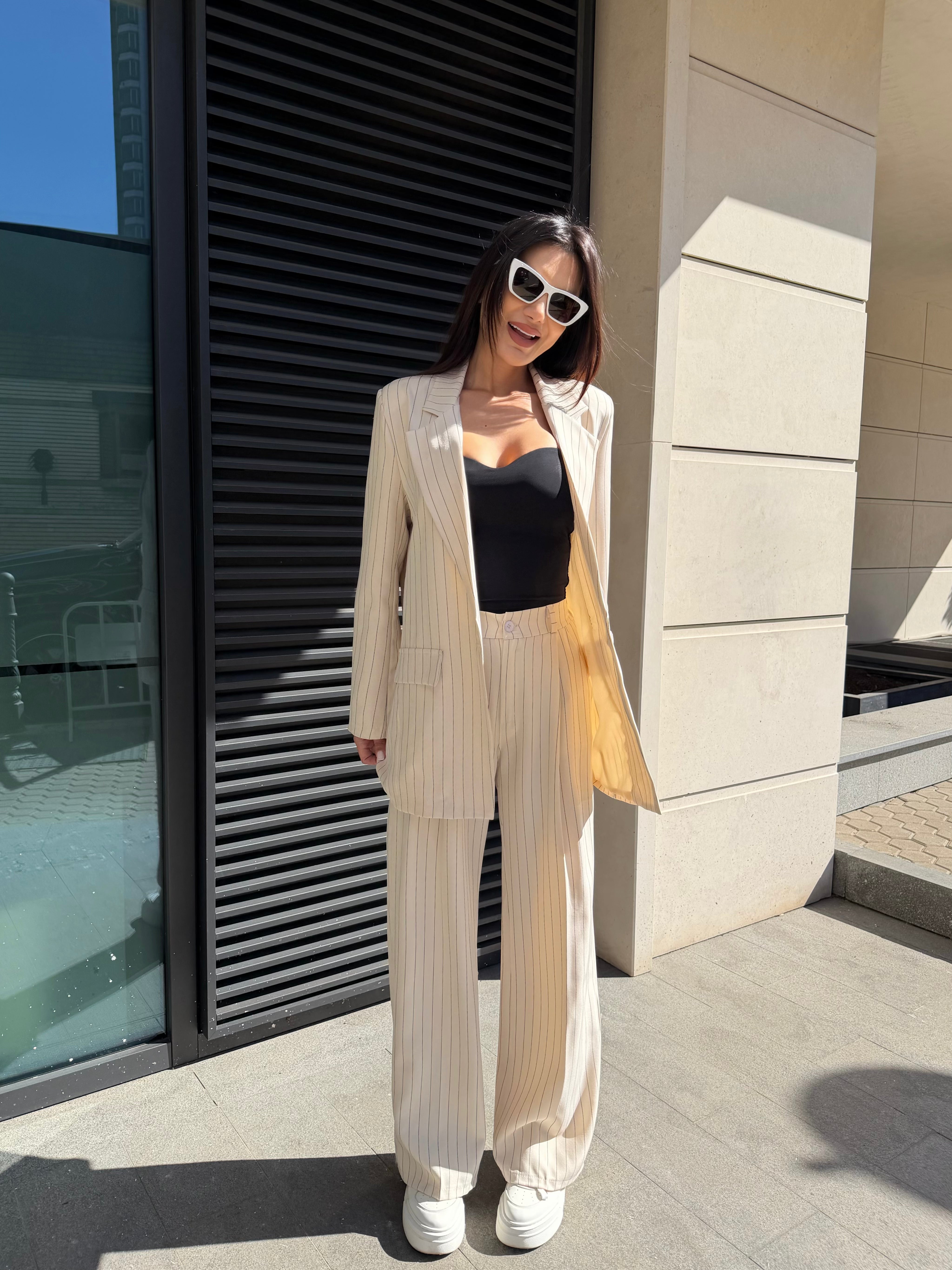 Елегантен дамски костюм от две части, състоящ се от сако и панталон с модерна свободна кройка. Фините вертикални райета придават изтънчен и стилен вид, който издължава силуета.