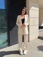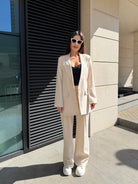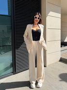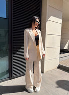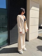 Сакото е със свободна линия и класически ревер, което го прави идеално както за елегантна визия, така и за модерни градски комбинации. Панталонът е с висока талия и ластик в задната част за допълнителен комфорт.