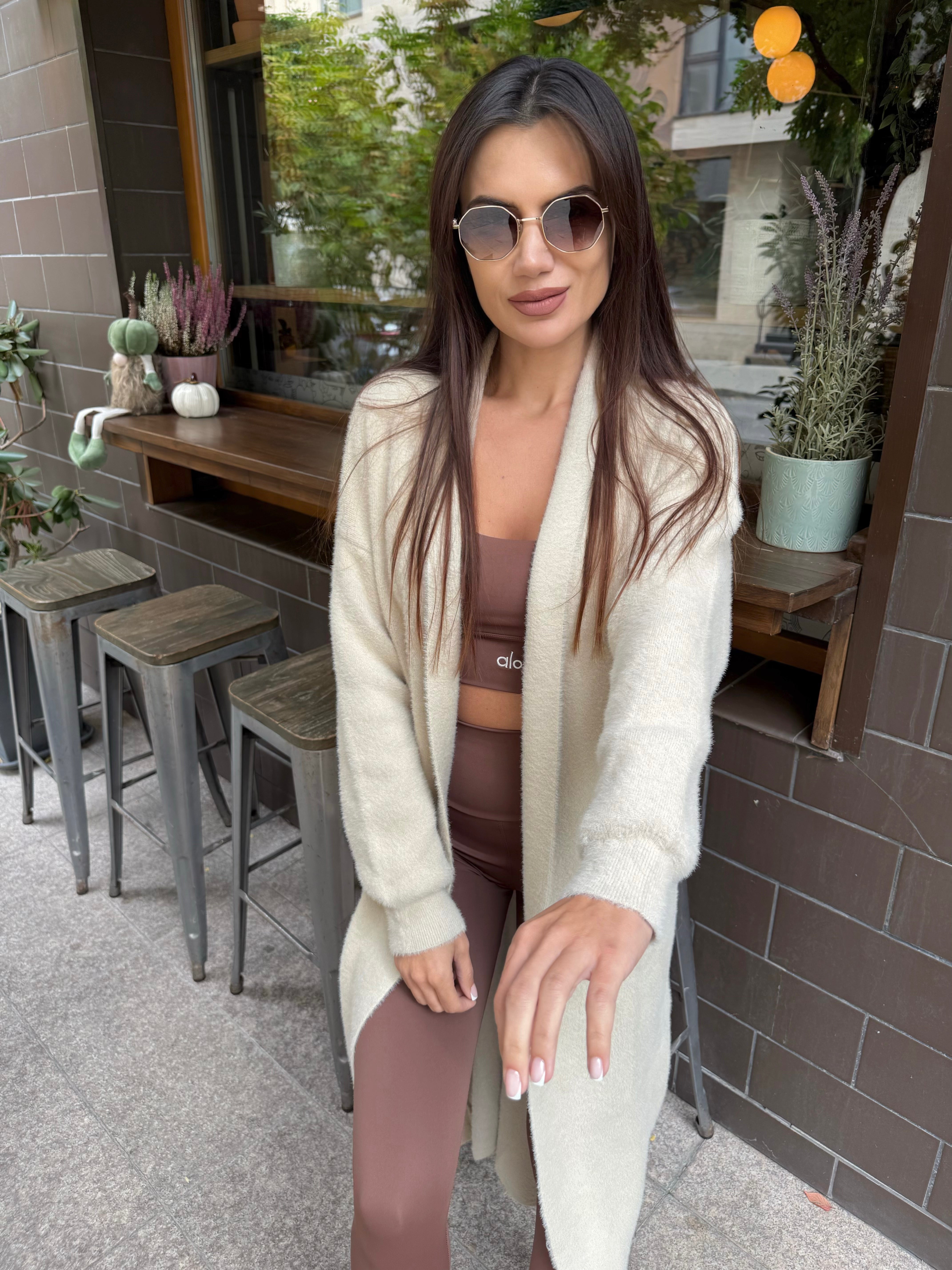 Елегантна дълга жилетка в мек бежов нюанс – символ на изчистен стил и комфорт. Перфектна за всеки ден и лесна за комбиниране с всякакви цветове.