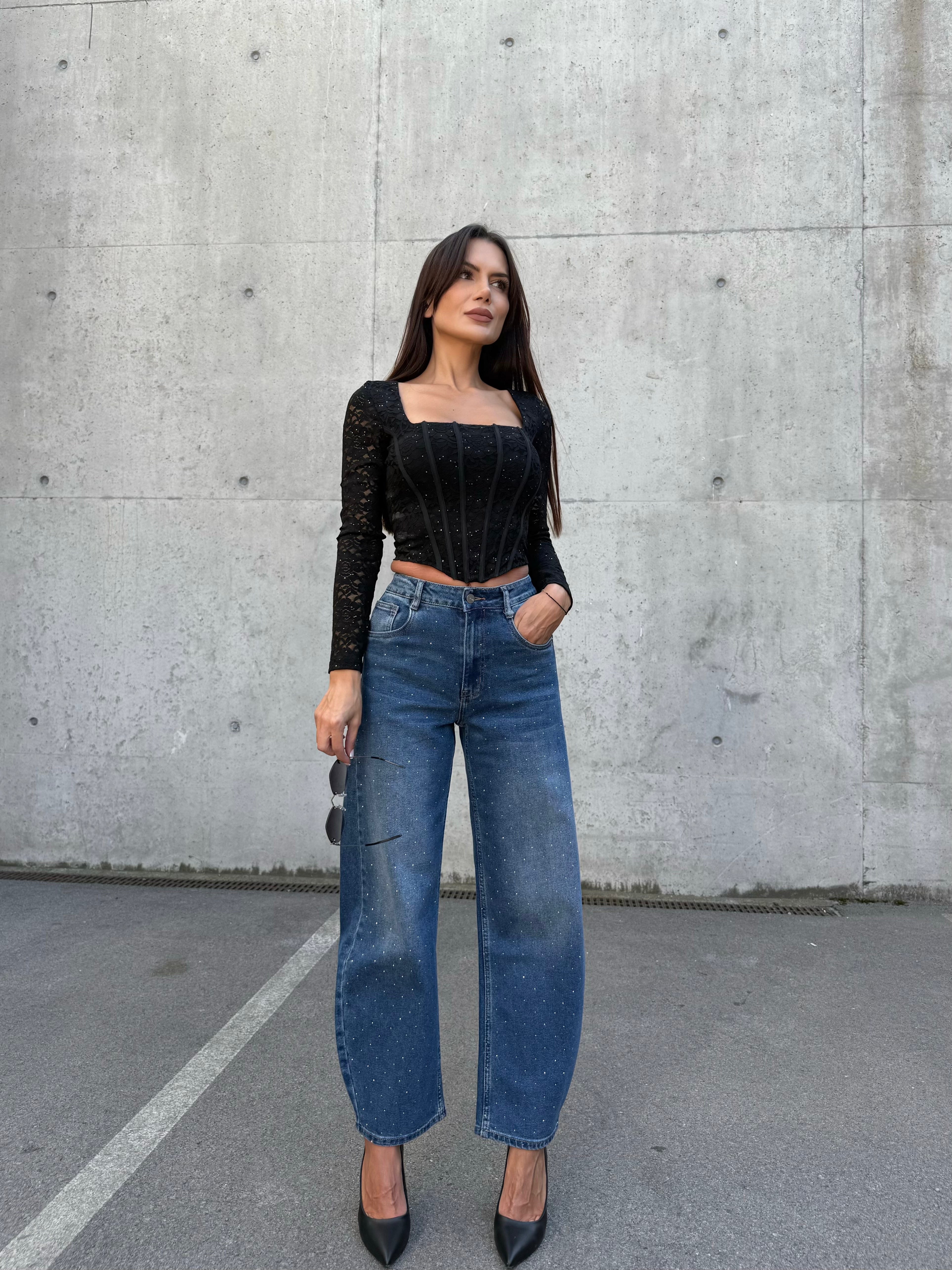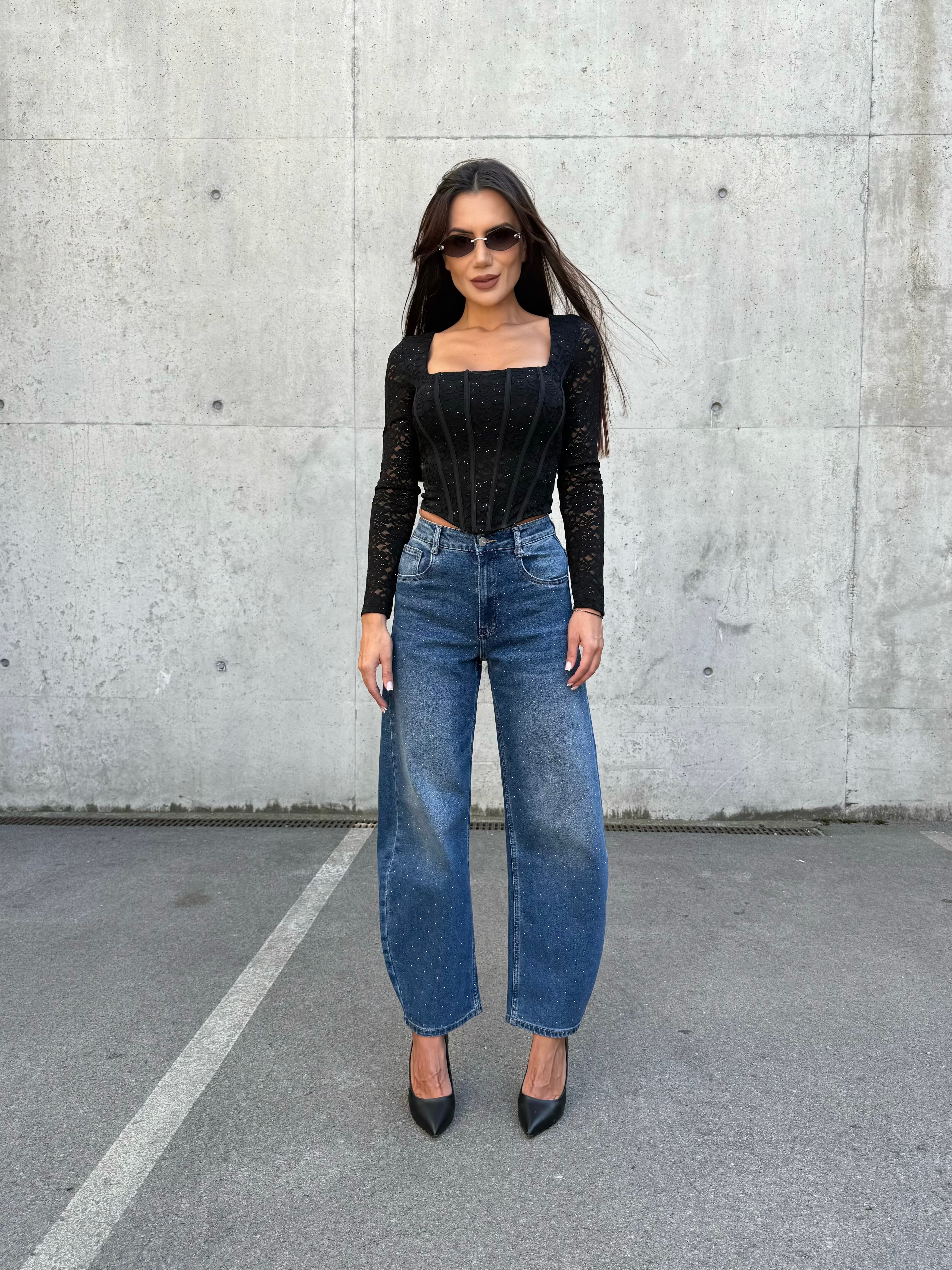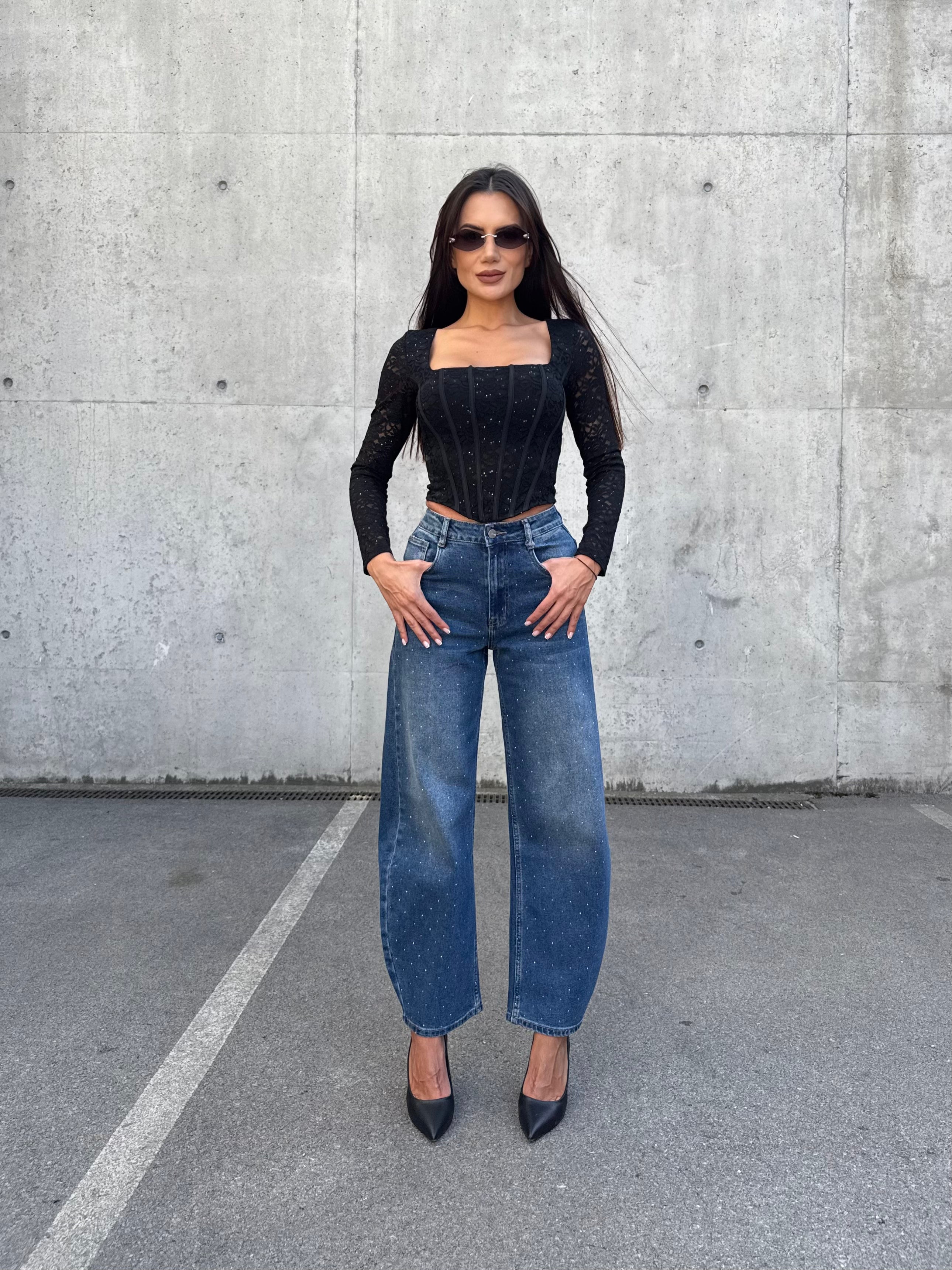 Създадени да привличат внимание, дънките BALLOON DENIM комбинират модерния балон силует с изящна декорация от камъни. С висока талия, комфортна кройка и елегантно падане, те са идеалният избор за всяка визия – от ежедневен street style до вечерен изискан аутфит.