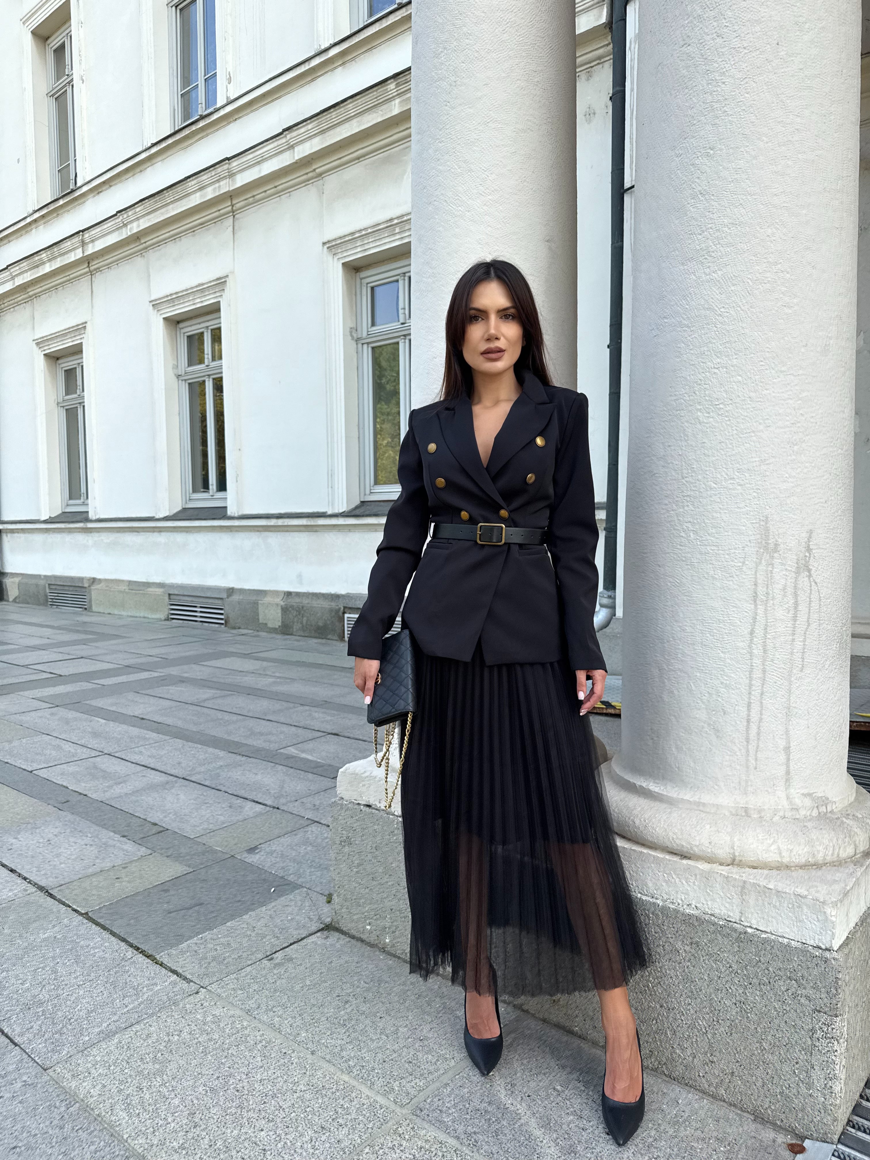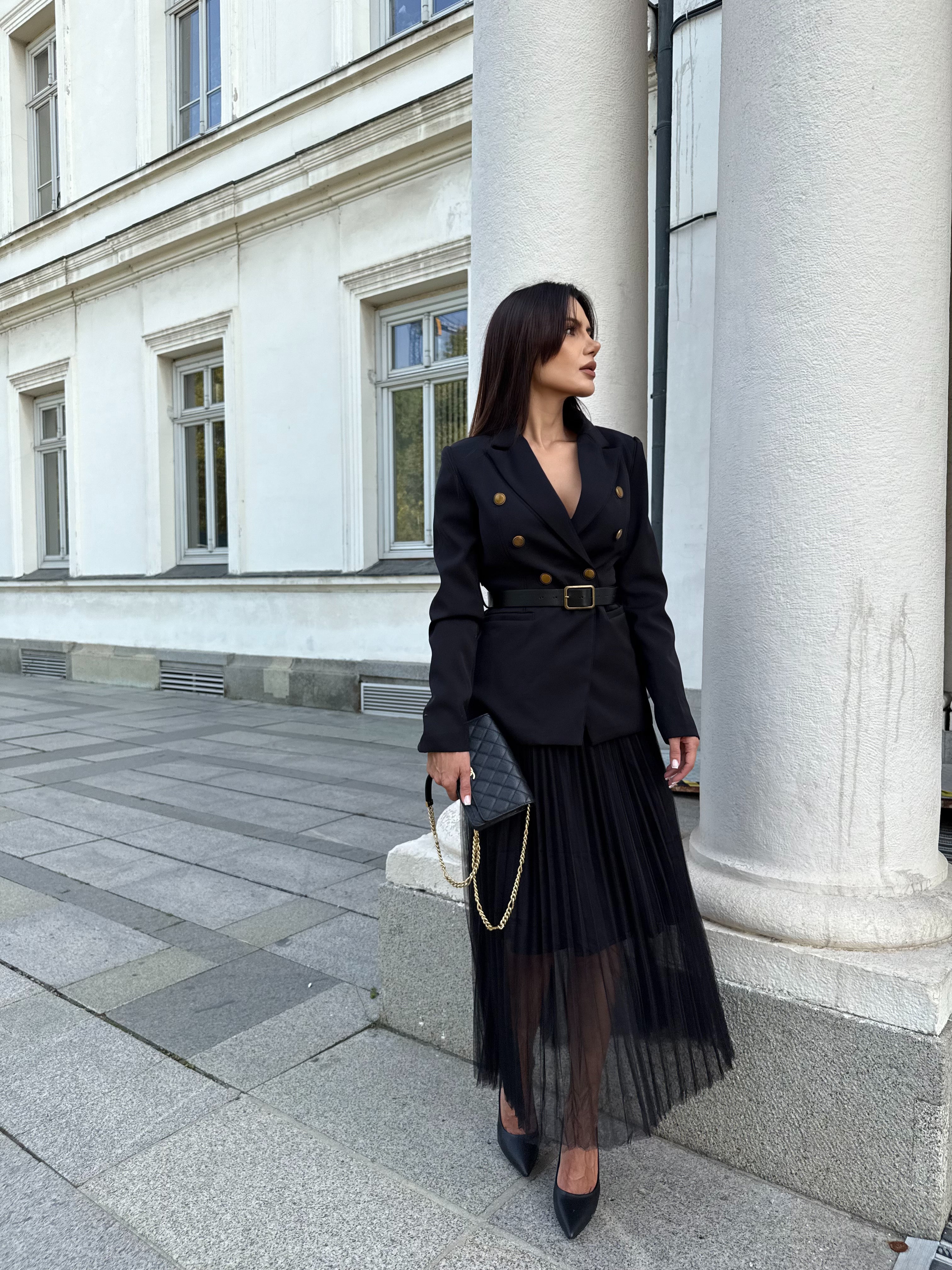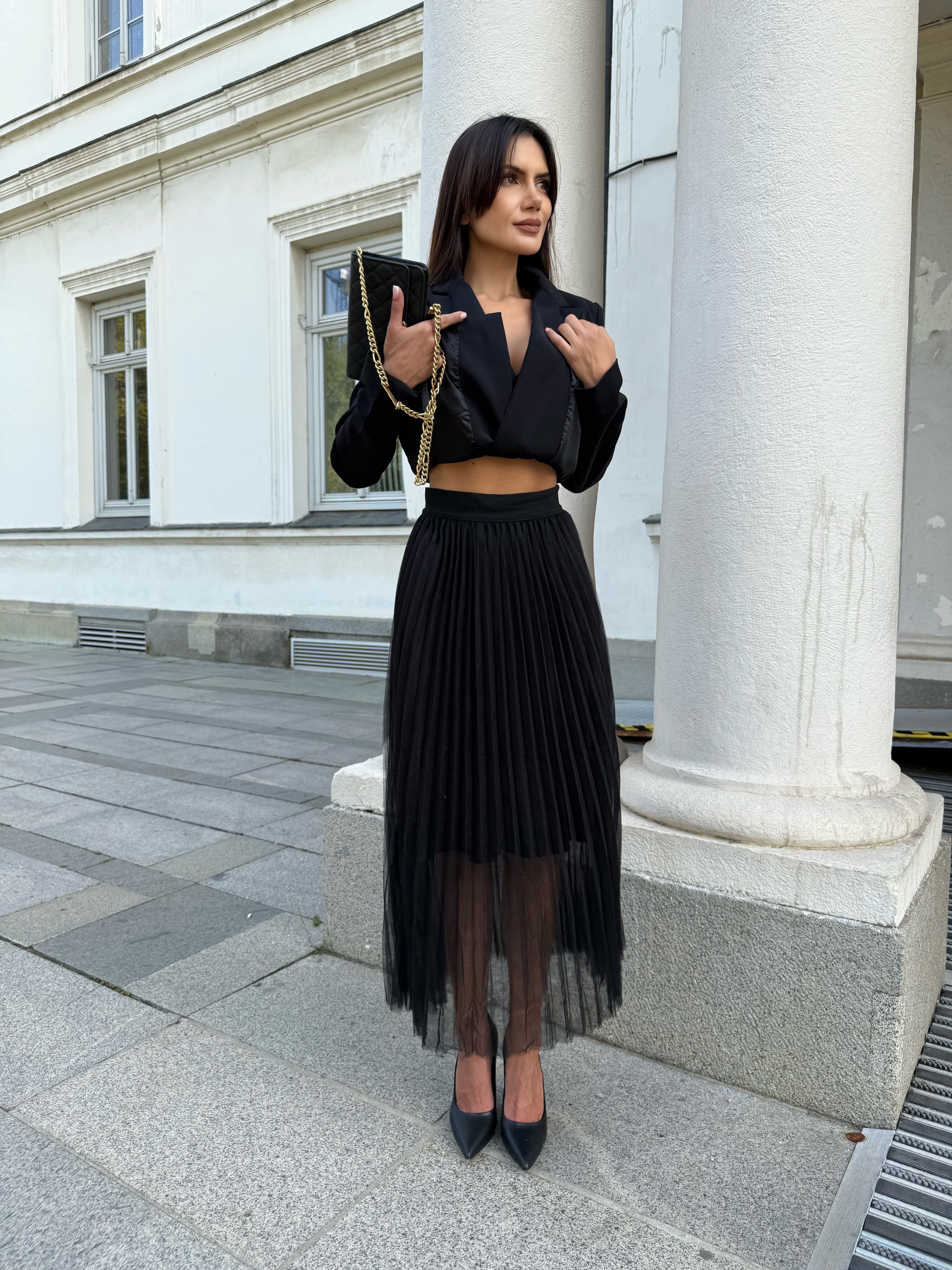 NOIR TULLE SKIRT е съчетание между елегантност и романтика. Полата е с плисирана основа и ефирен тюлен слой, който придава лекота и изтънченост на всяко движение. Черният цвят я прави универсална и лесна за комбиниране – както с елегантно сако, така и с по-небрежен топ.