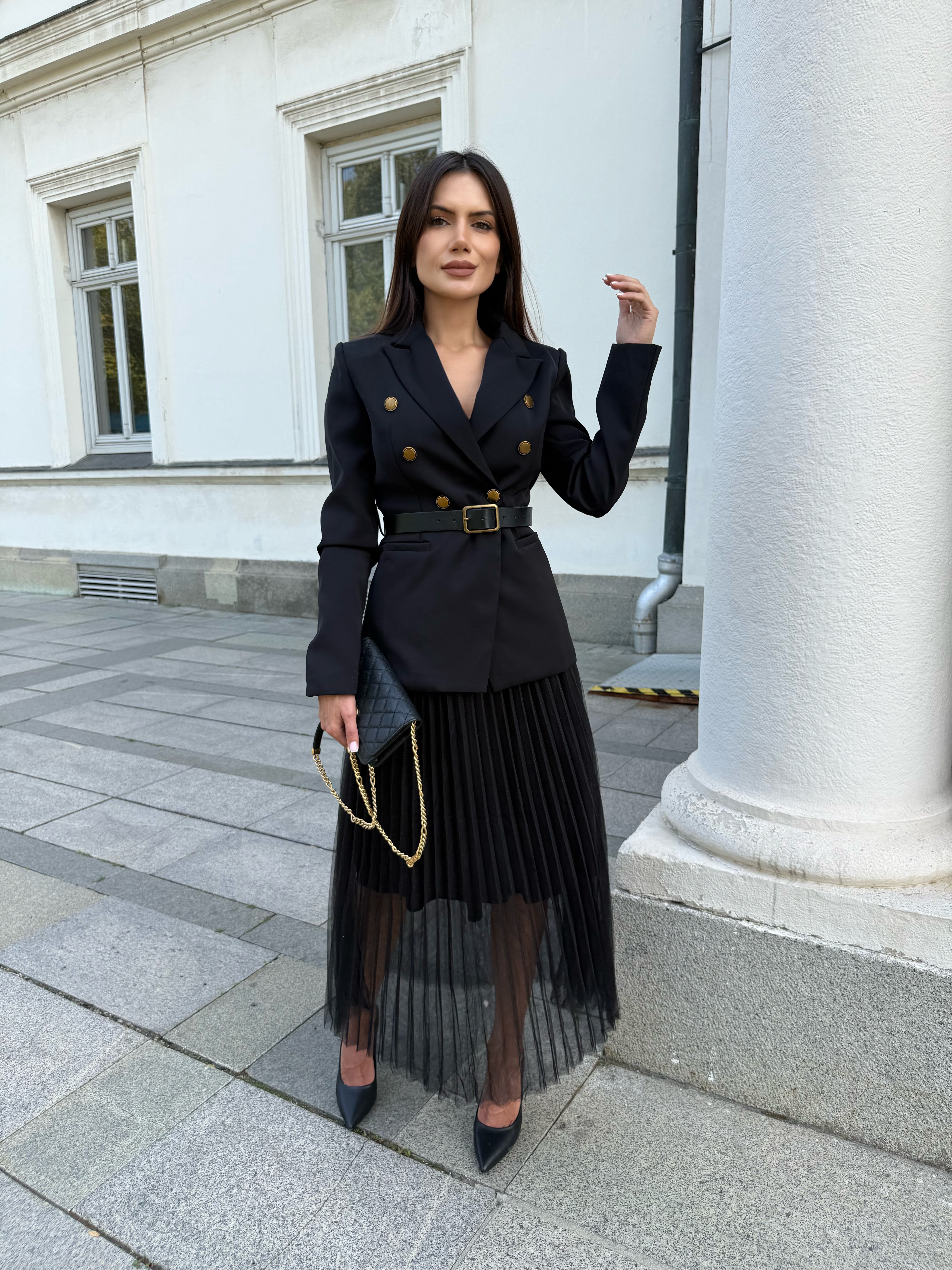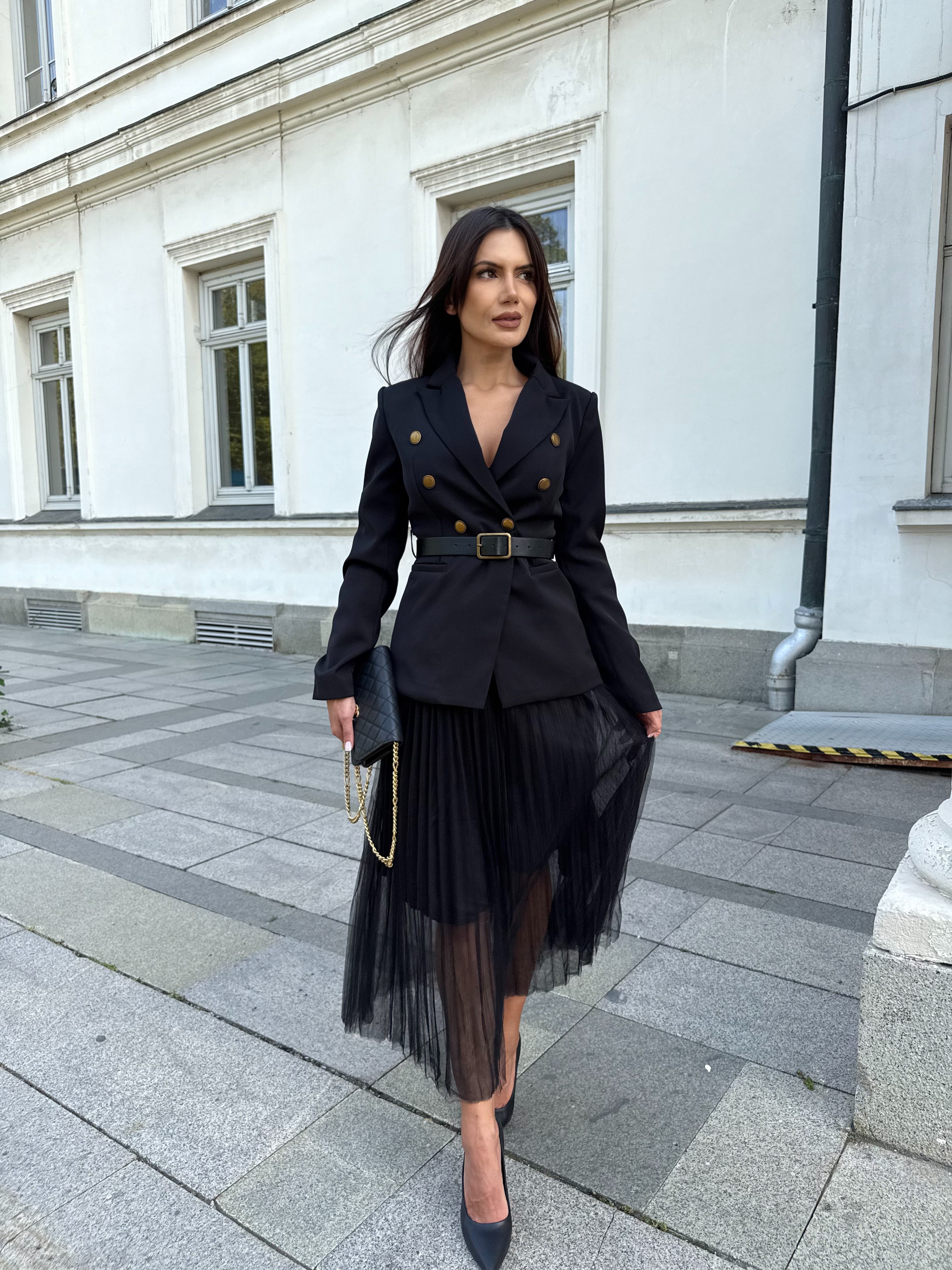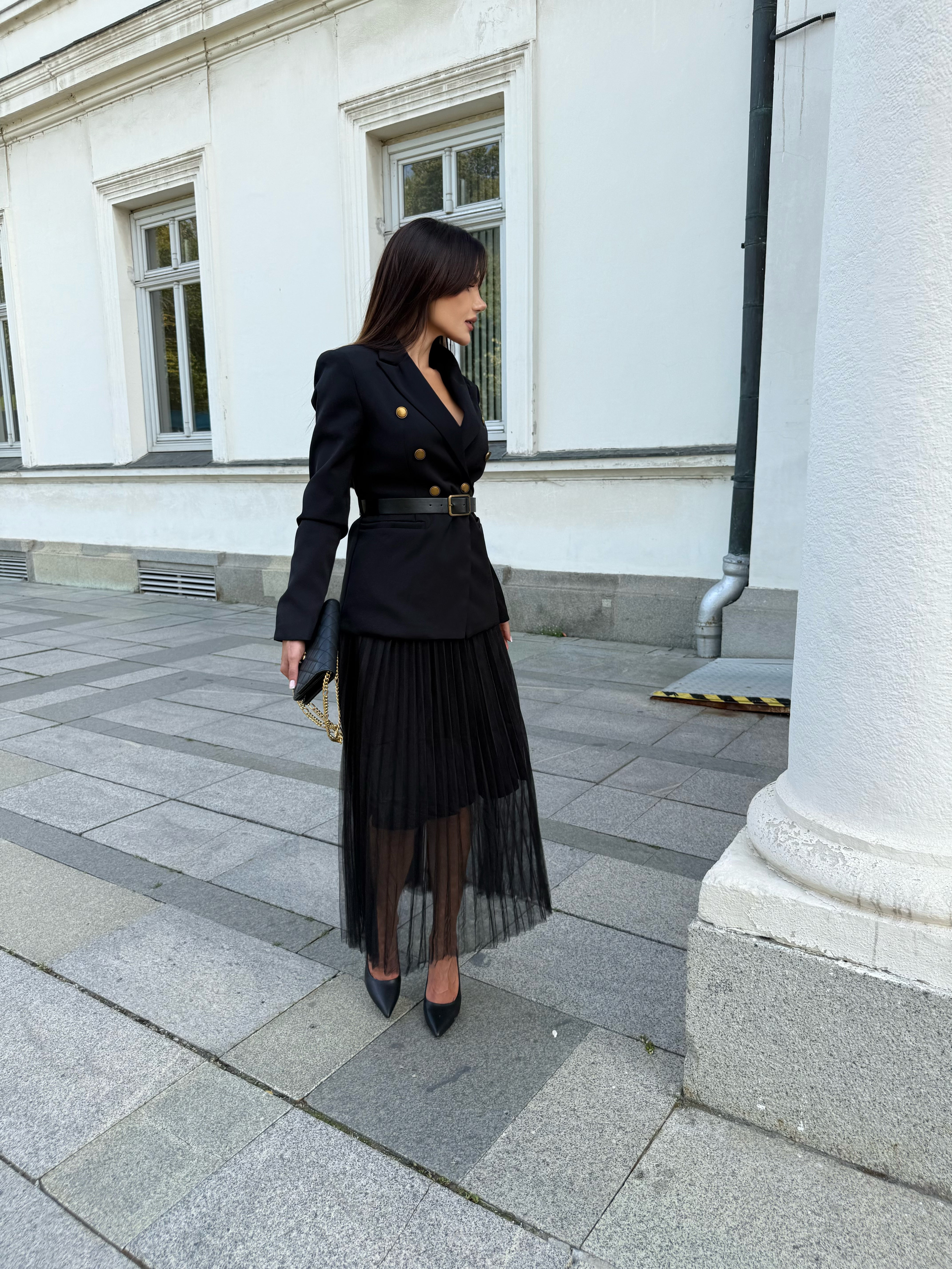 NOIR TULLE SKIRT е съчетание между елегантност и романтика. Полата е с плисирана основа и ефирен тюлен слой, който придава лекота и изтънченост на всяко движение. Черният цвят я прави универсална и лесна за комбиниране – както с елегантно сако, така и с по-небрежен топ.