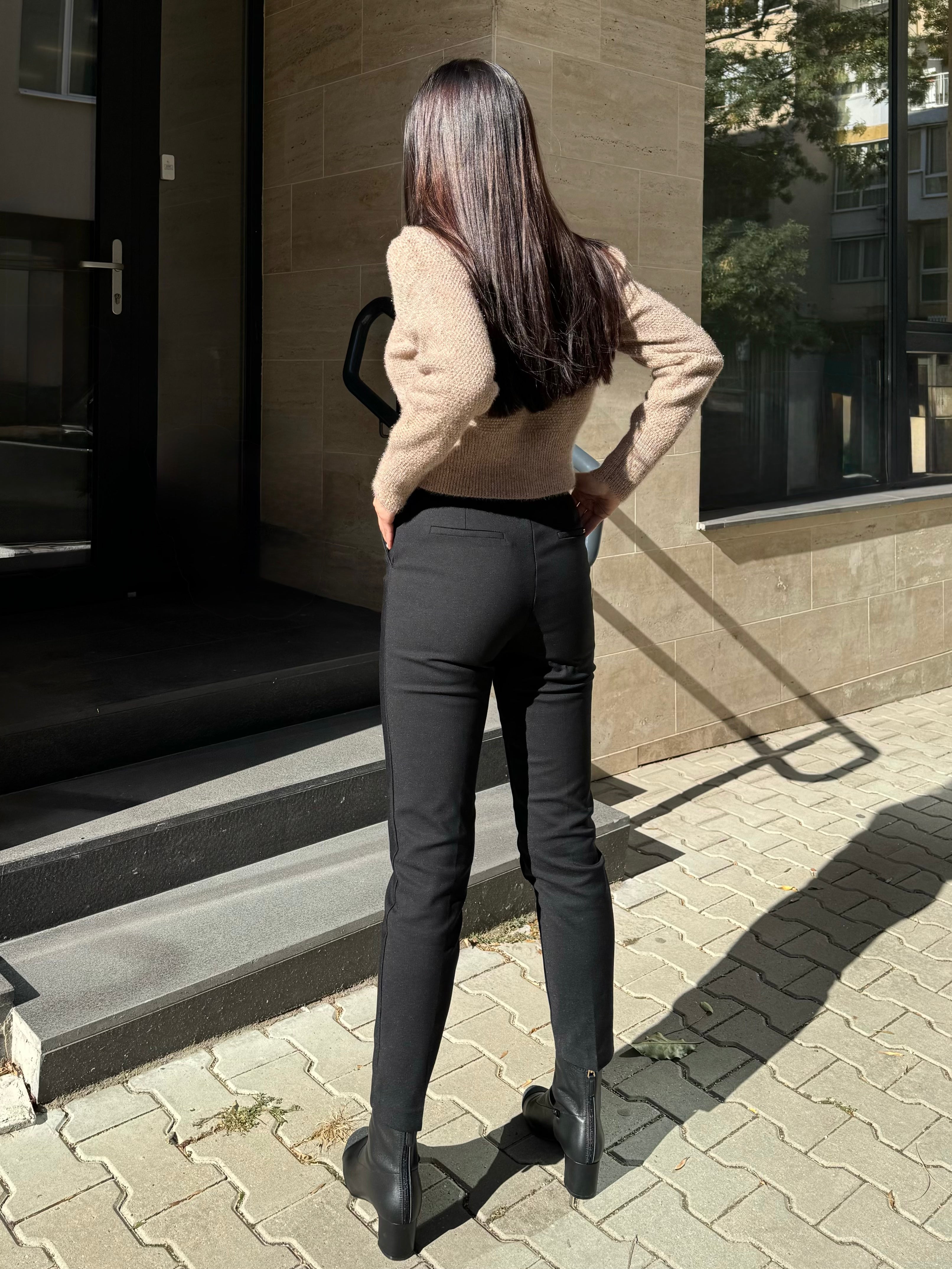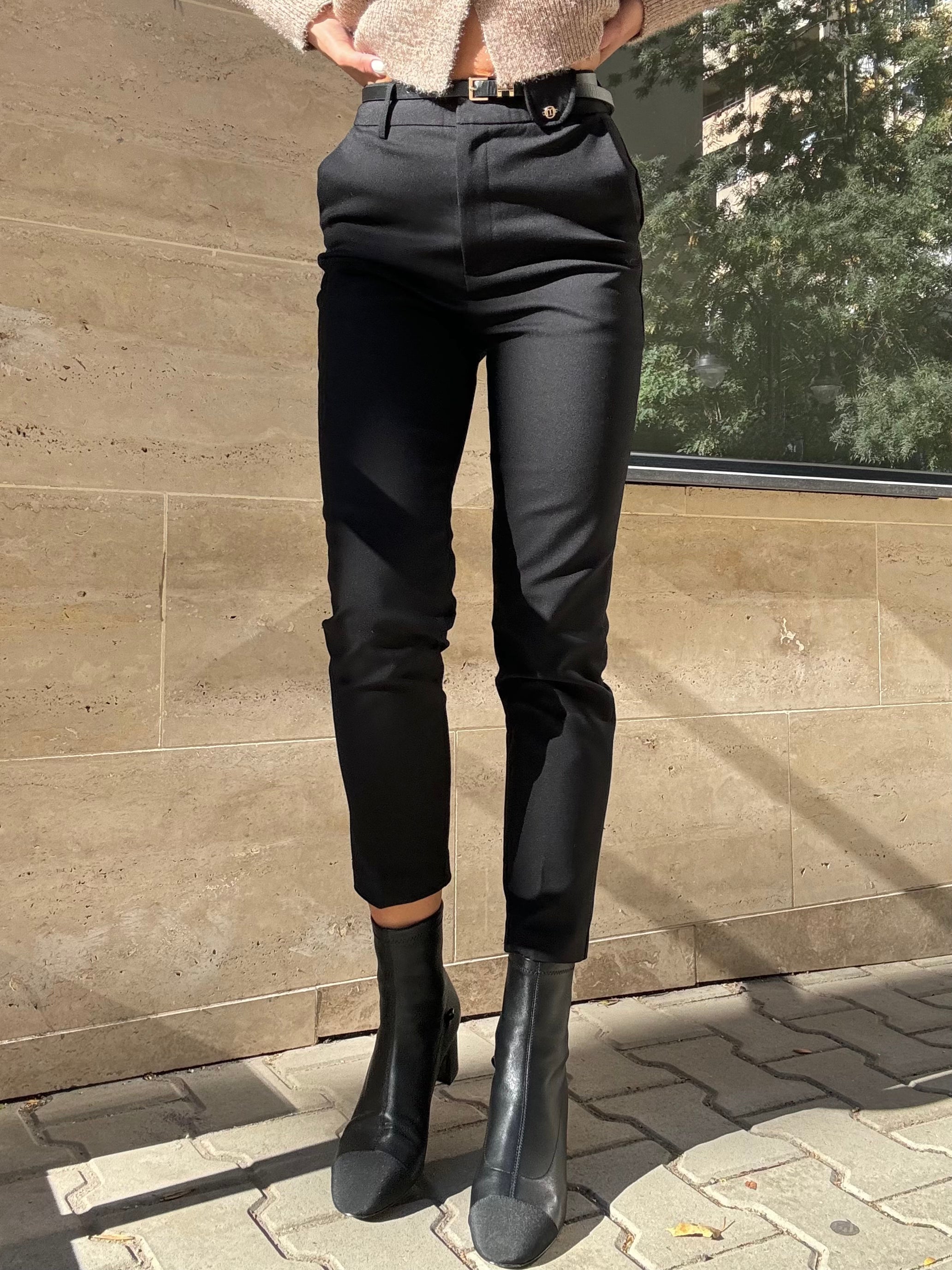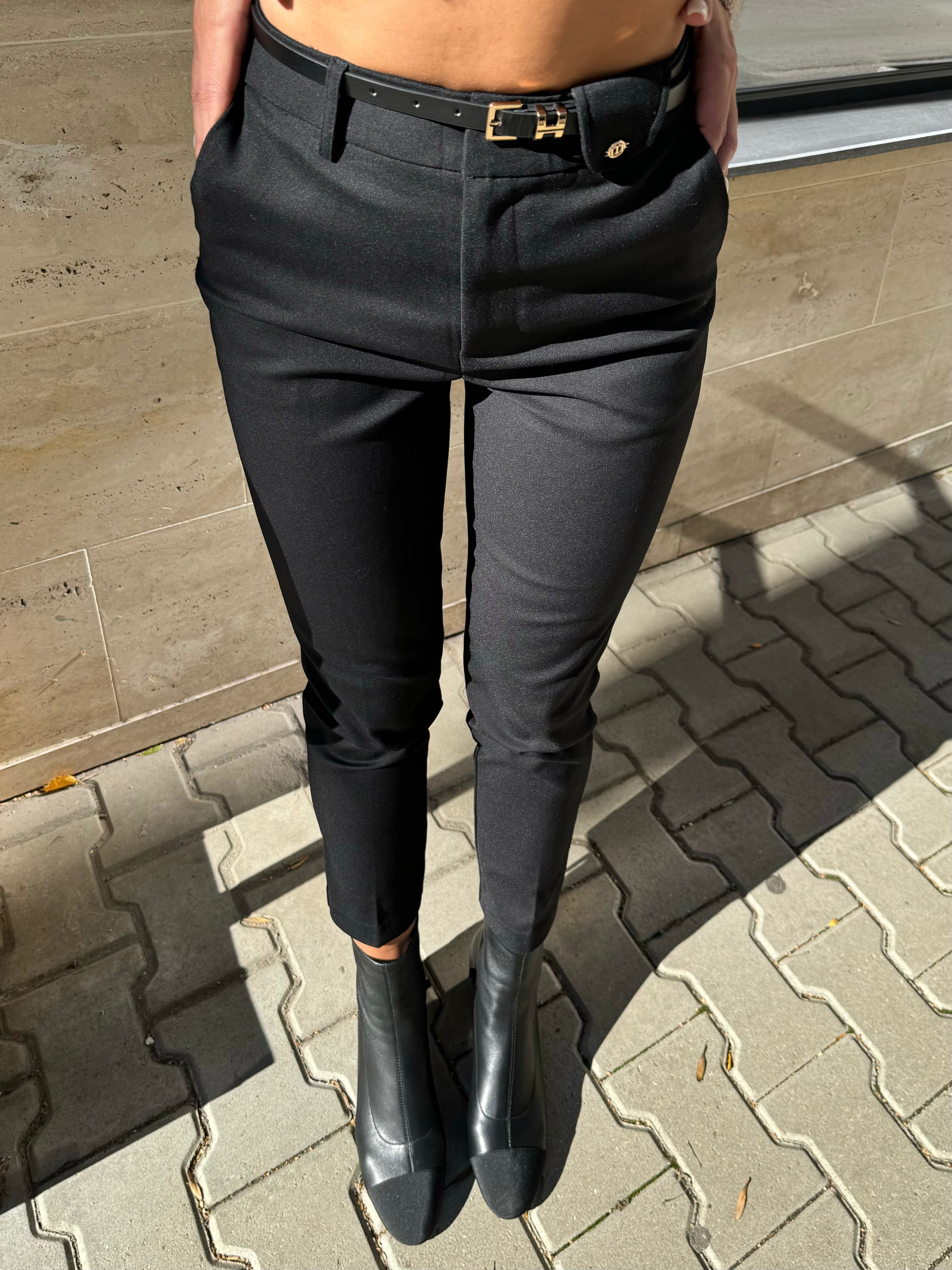 Елегантен черен панталон със slim кройка, изработен от мека и еластична материя за перфектно прилягане. Моделът е с висока талия и включва стилен кожен колан, който подчертава силуета. Подходящ както за офис визии, така и за вечерни излизания.