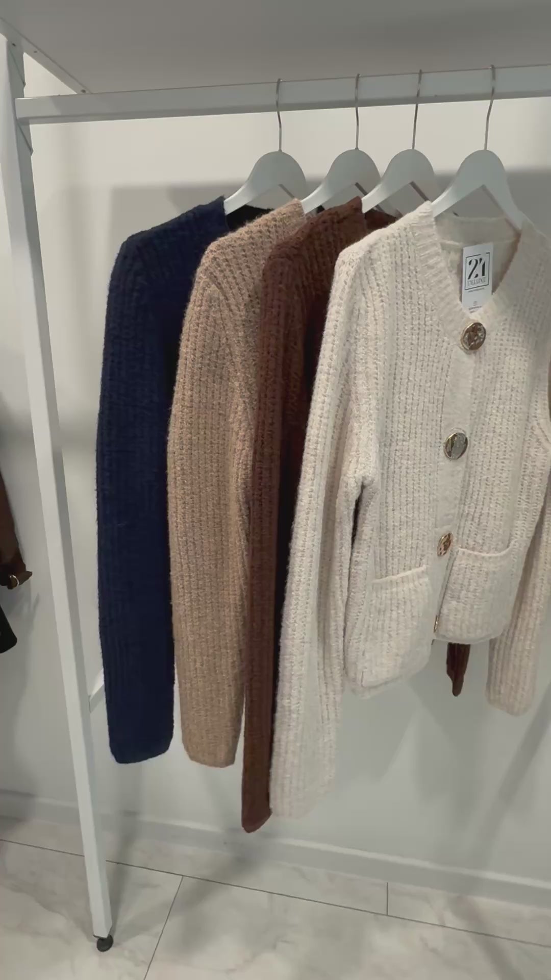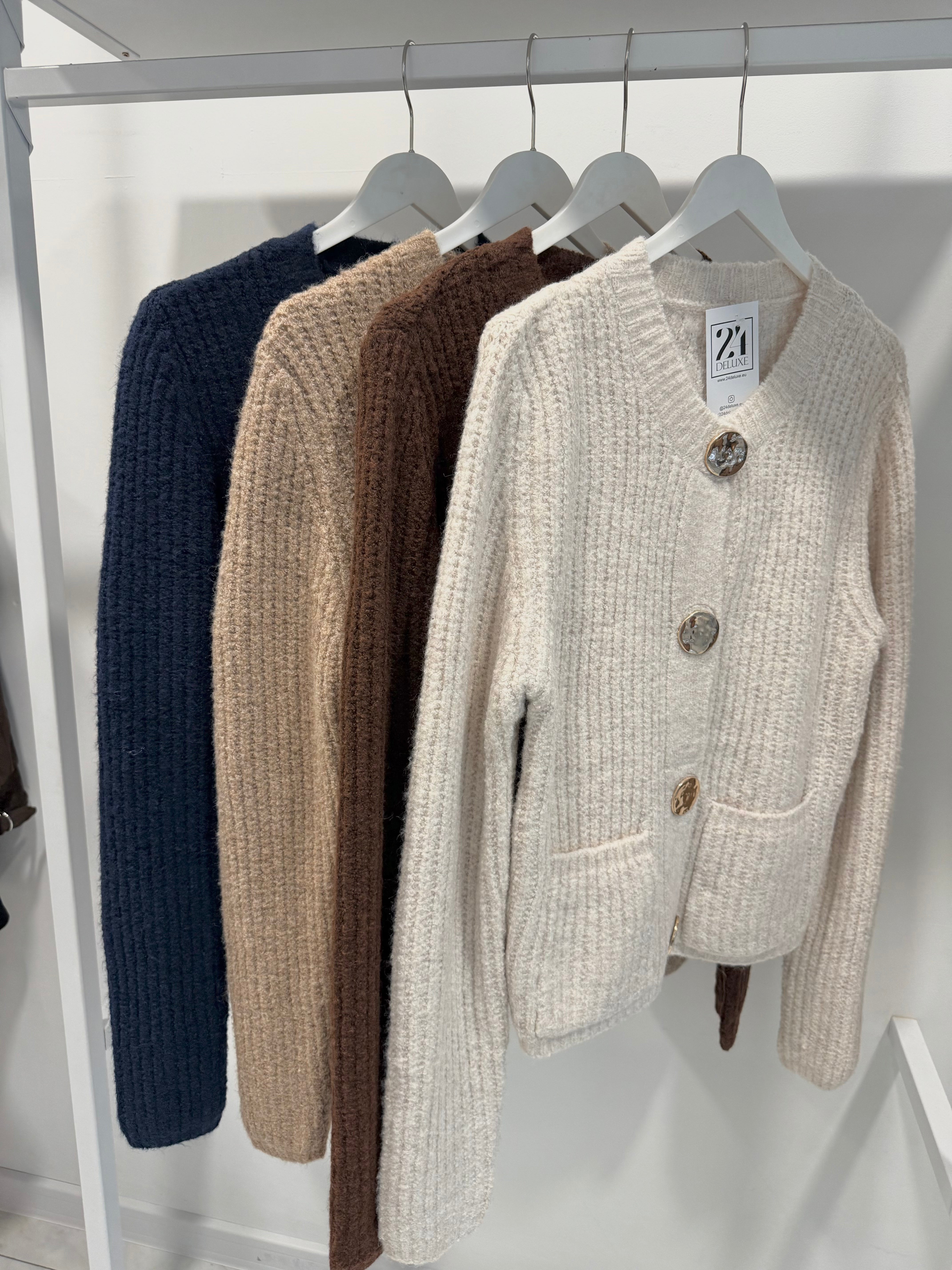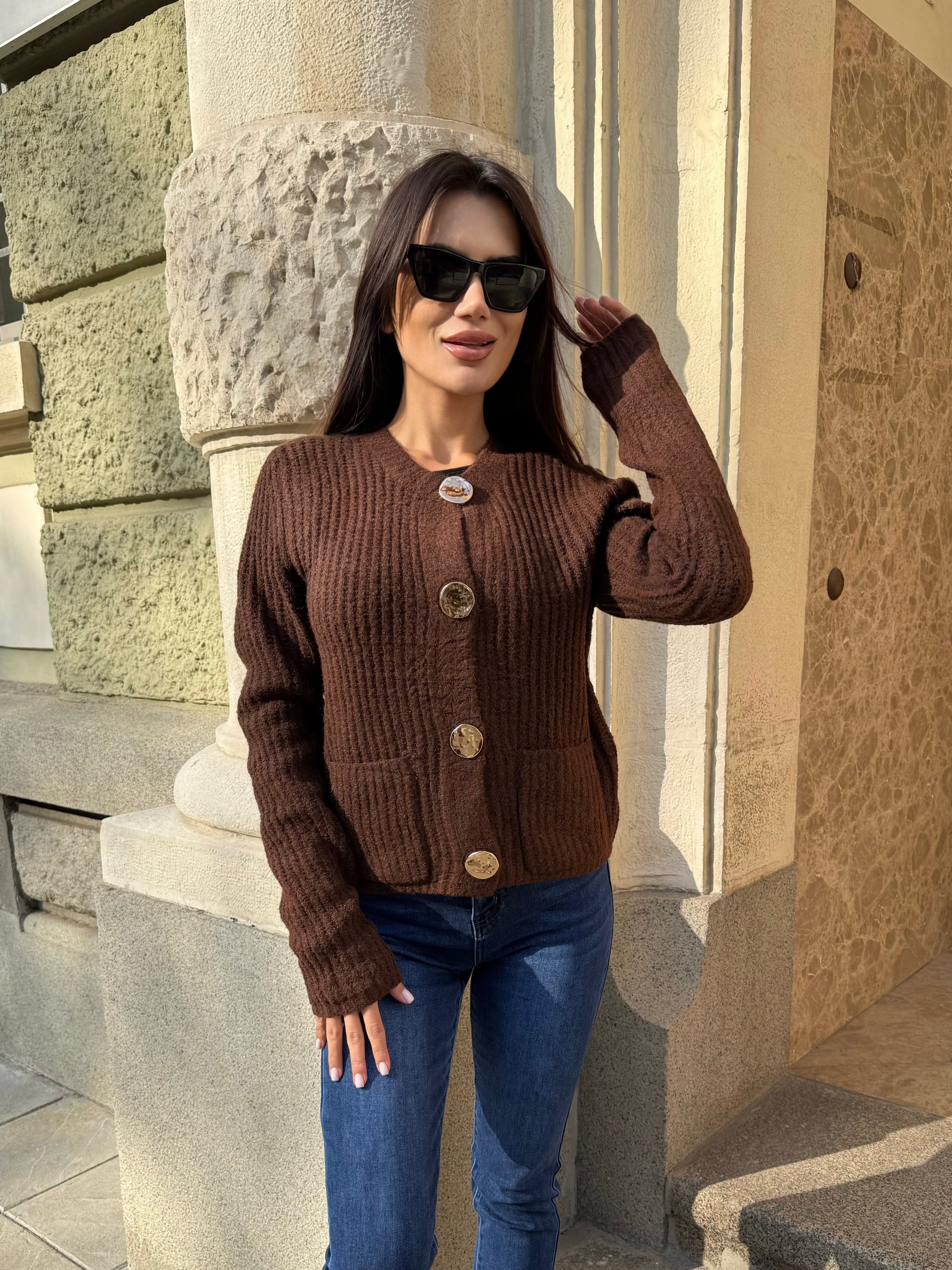 Изработена от топло рипсено плетиво и украсена с луксозни златни копчета, които добавят изтънчен блясък към всяка визия.
