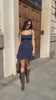 Feminine mini dress featuring a corset-inspired fitted top and a flared skirt that enhances the waist and creates a perfectly sculpted silhouette.