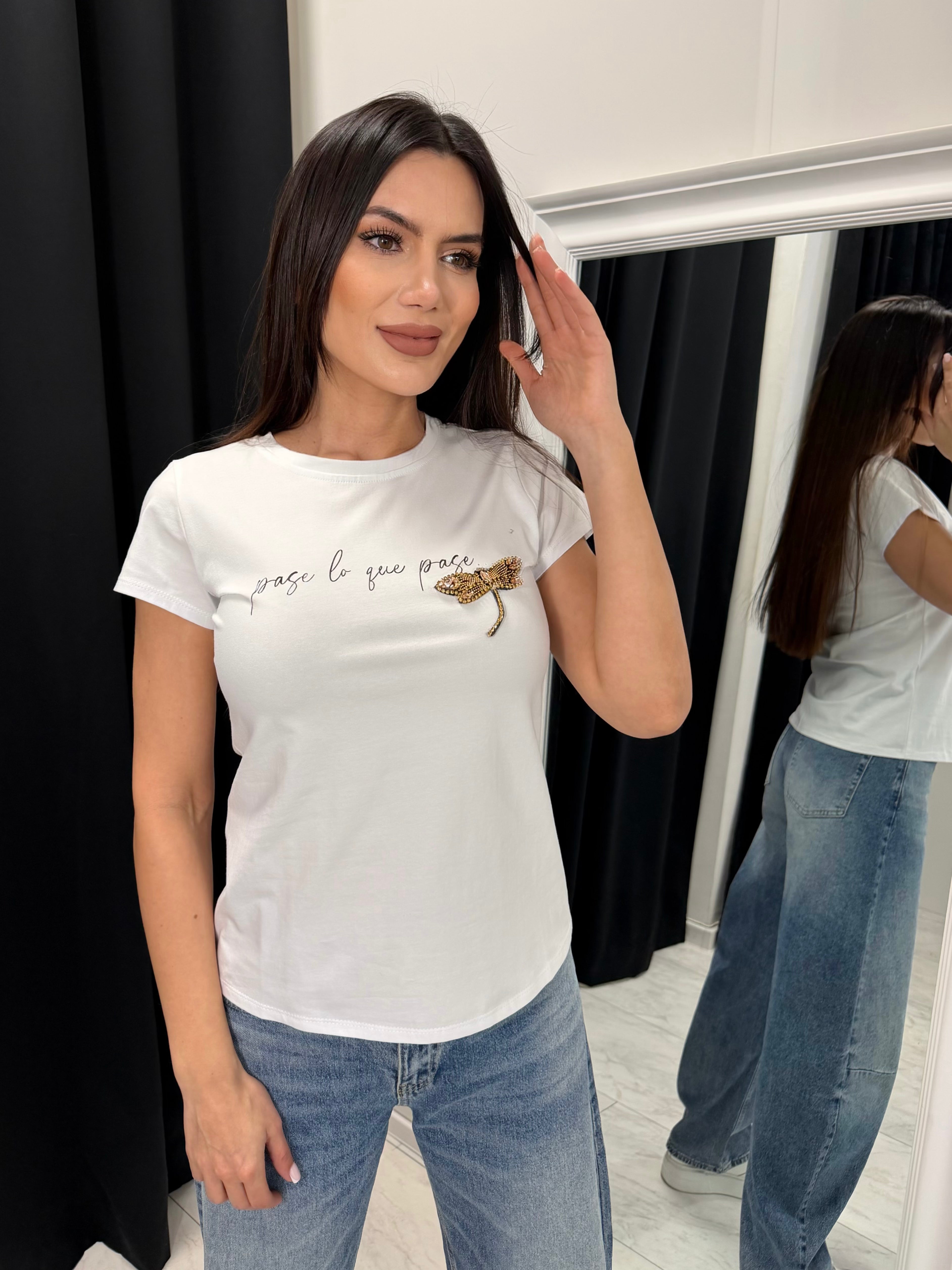 The PAIX Dorée Tee combines a clean silhouette with a delicate golden embellishment. The subtle script detail and metallic leaf accent elevate this essential piece into a chic statement.