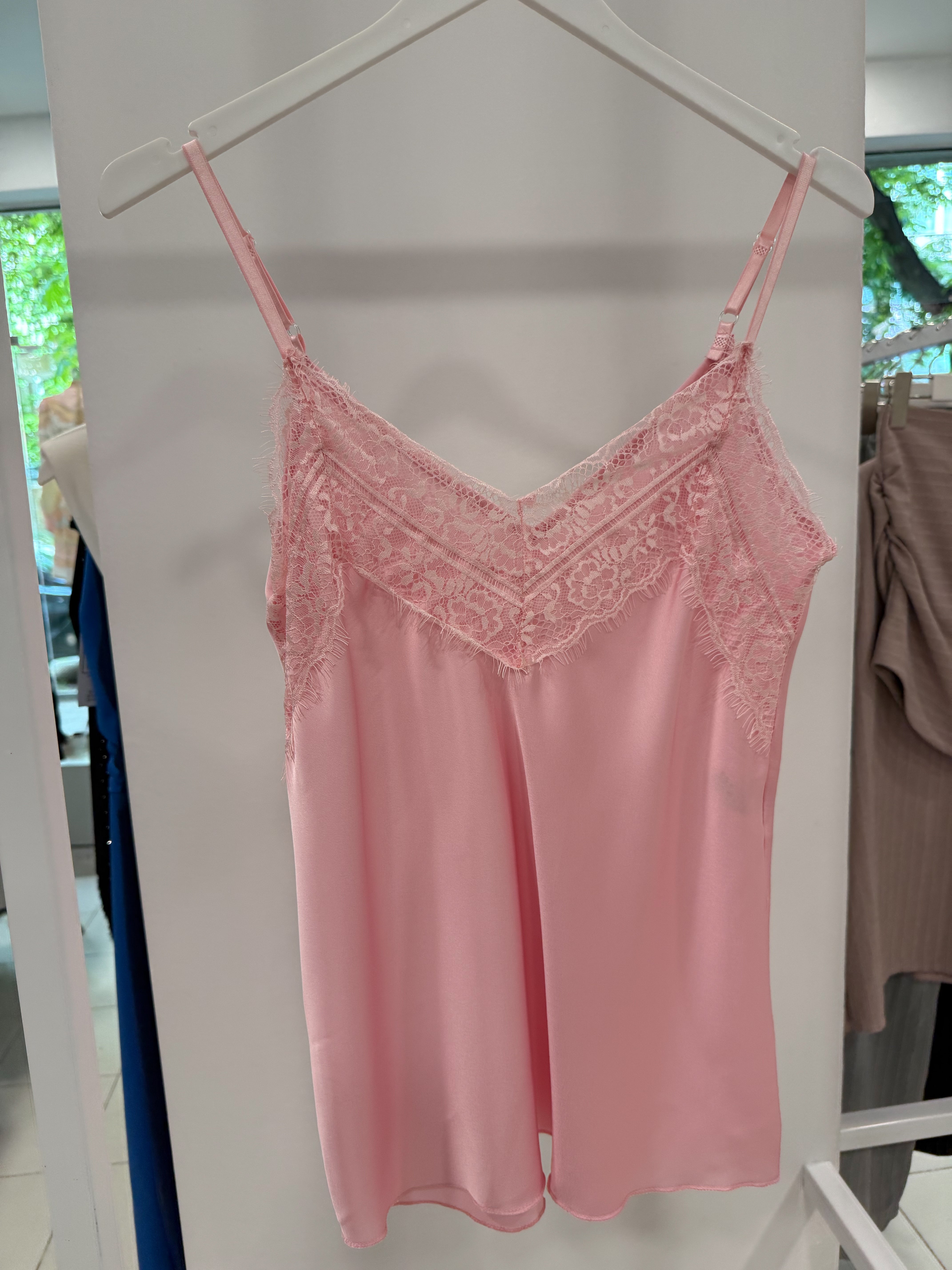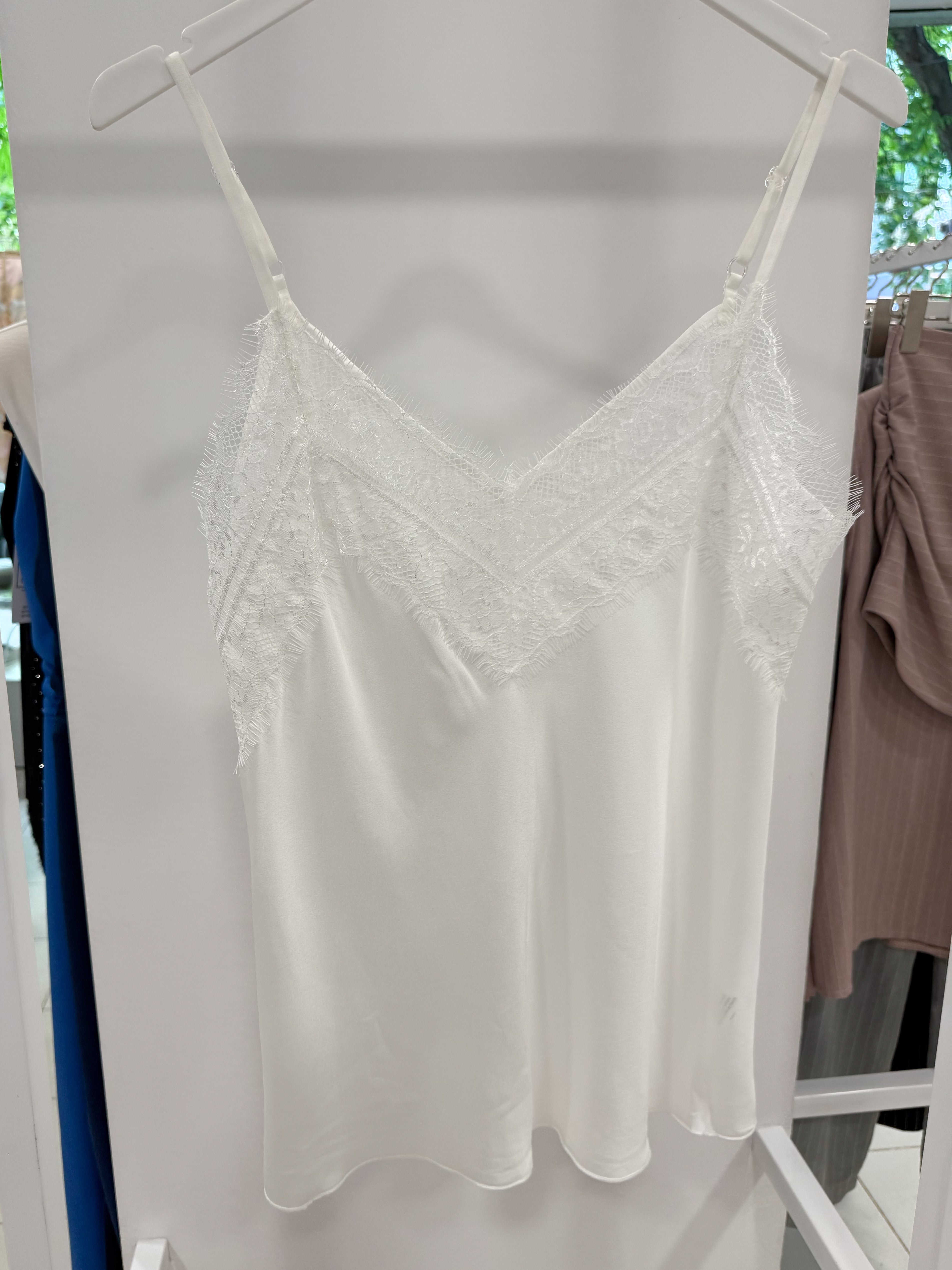 SATIN SWEATER WITH LACE on the front neckline.