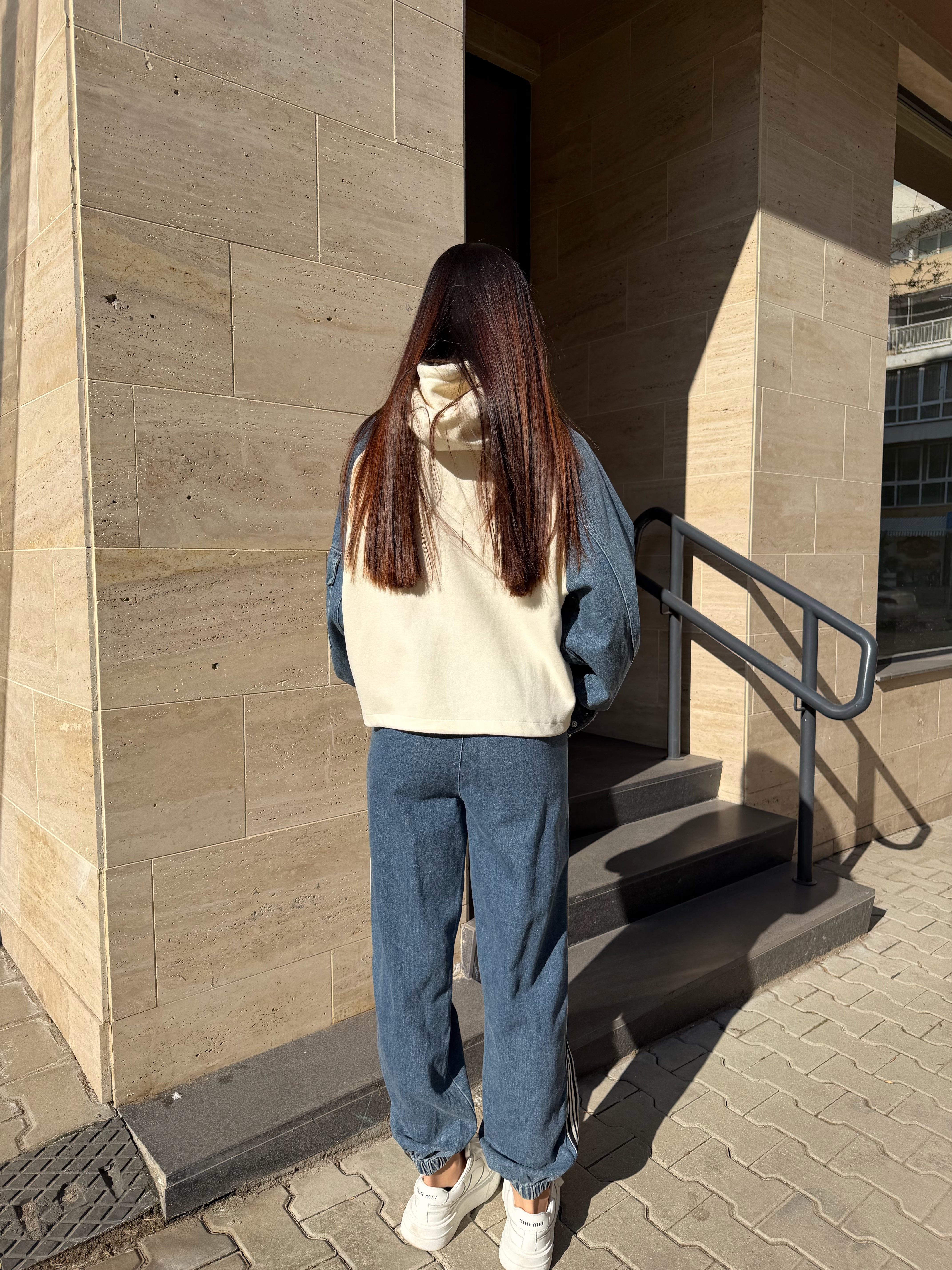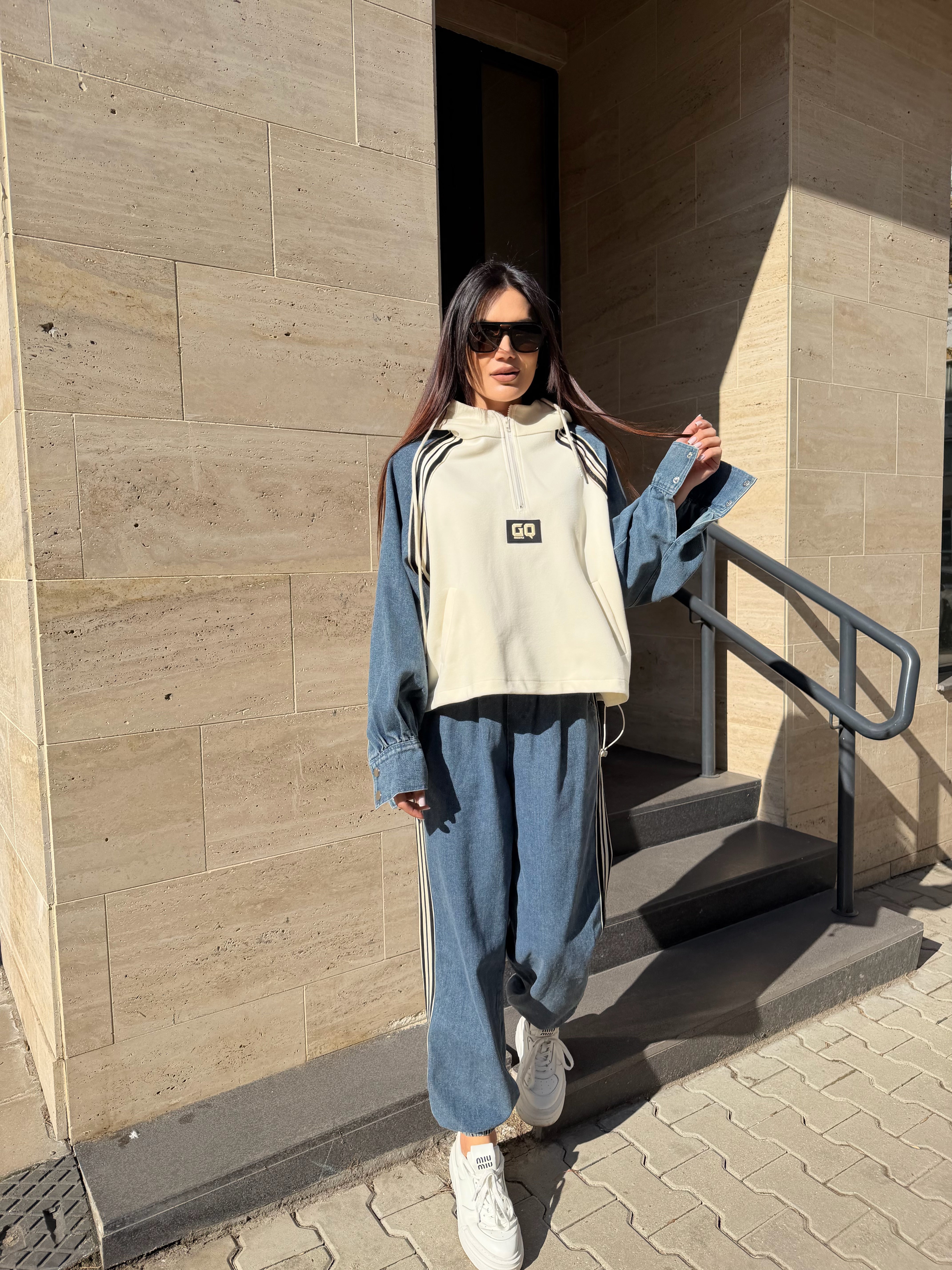 A modern urban-style set combining comfort and contemporary design. The outfit features wide-leg denim trousers with an elastic waistband and a sporty hoodie with zip detail.