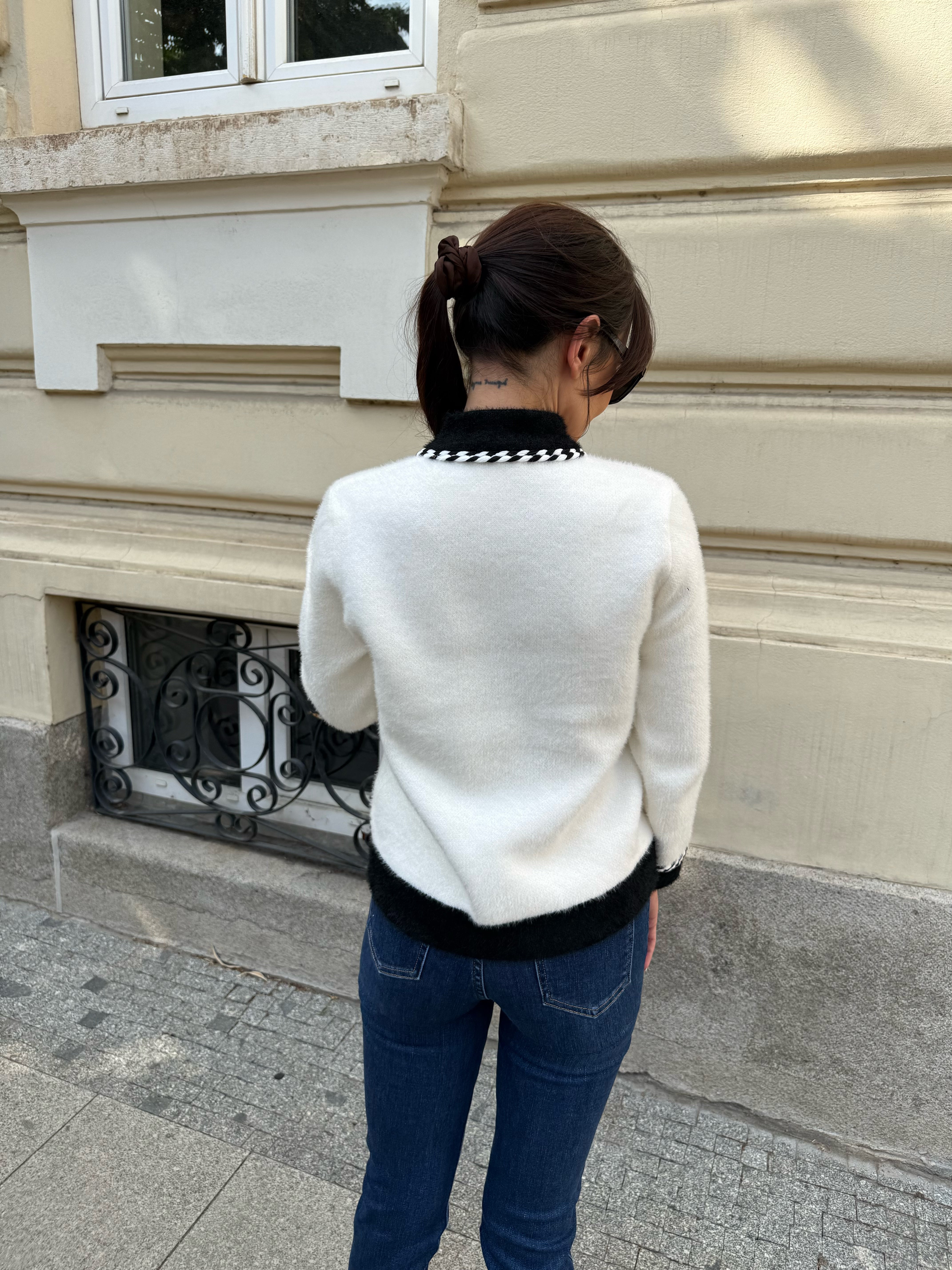 Women 's cardigan with a loose fit and external pockets on the front. The accent is the gold thread.