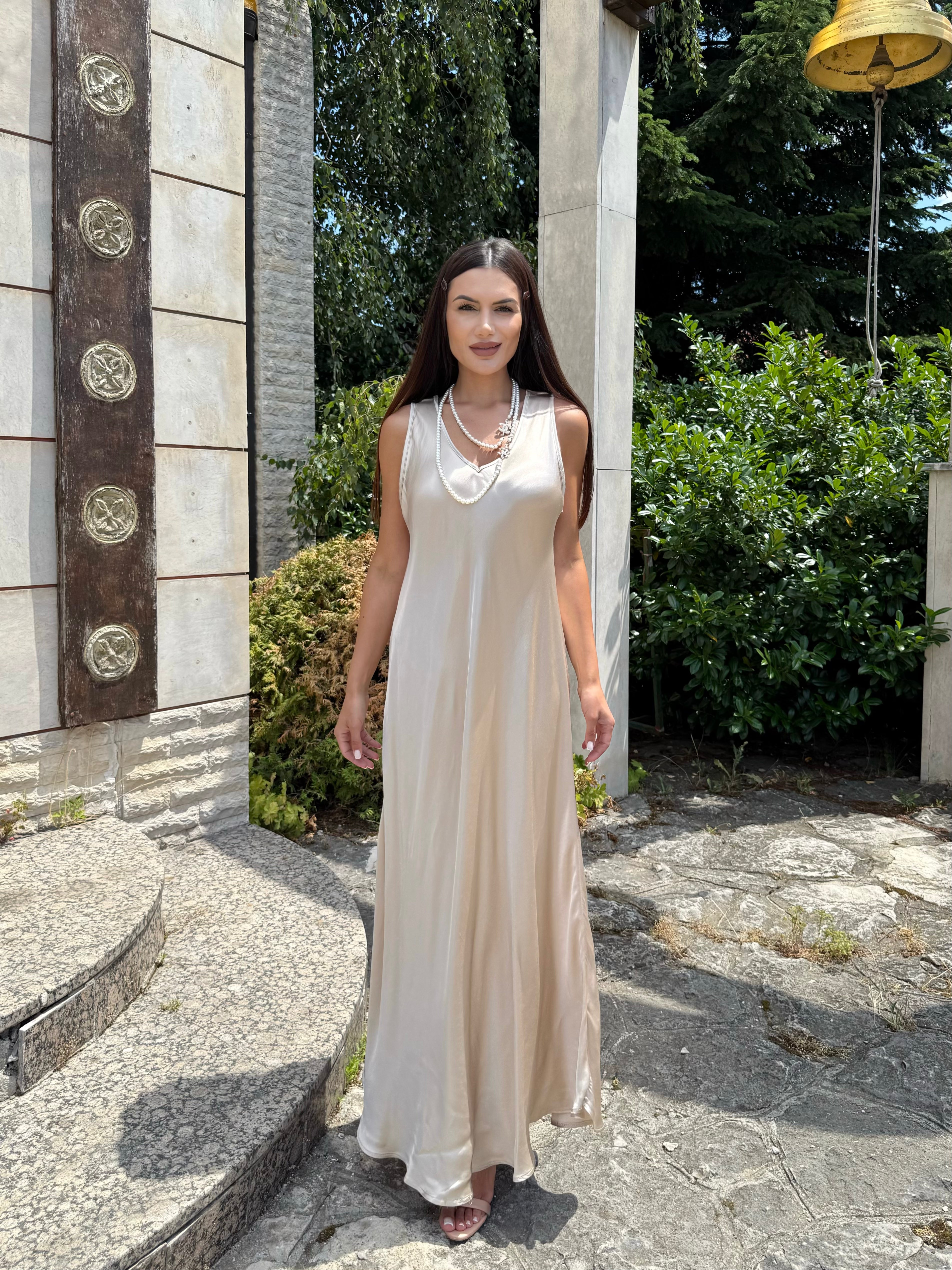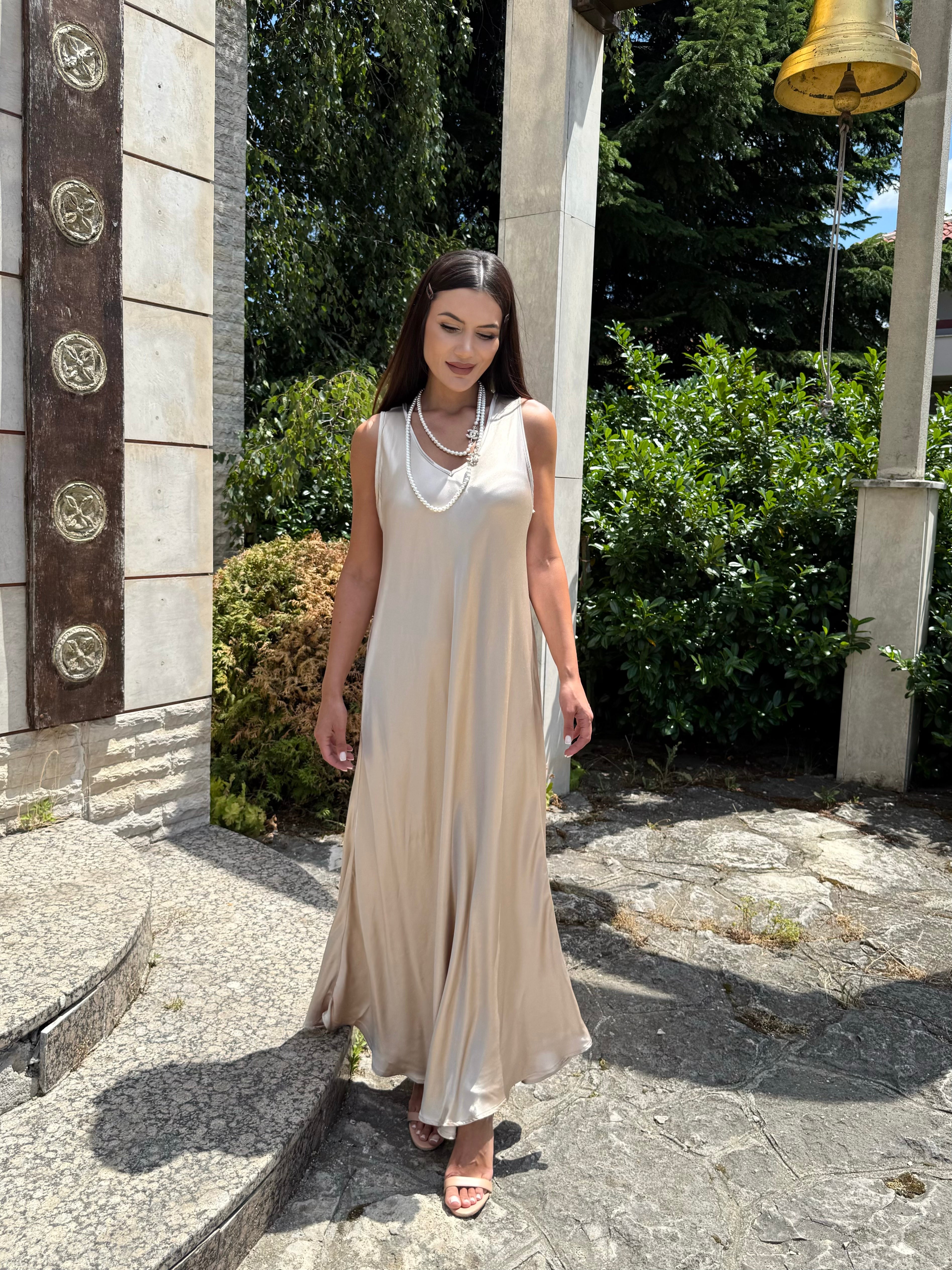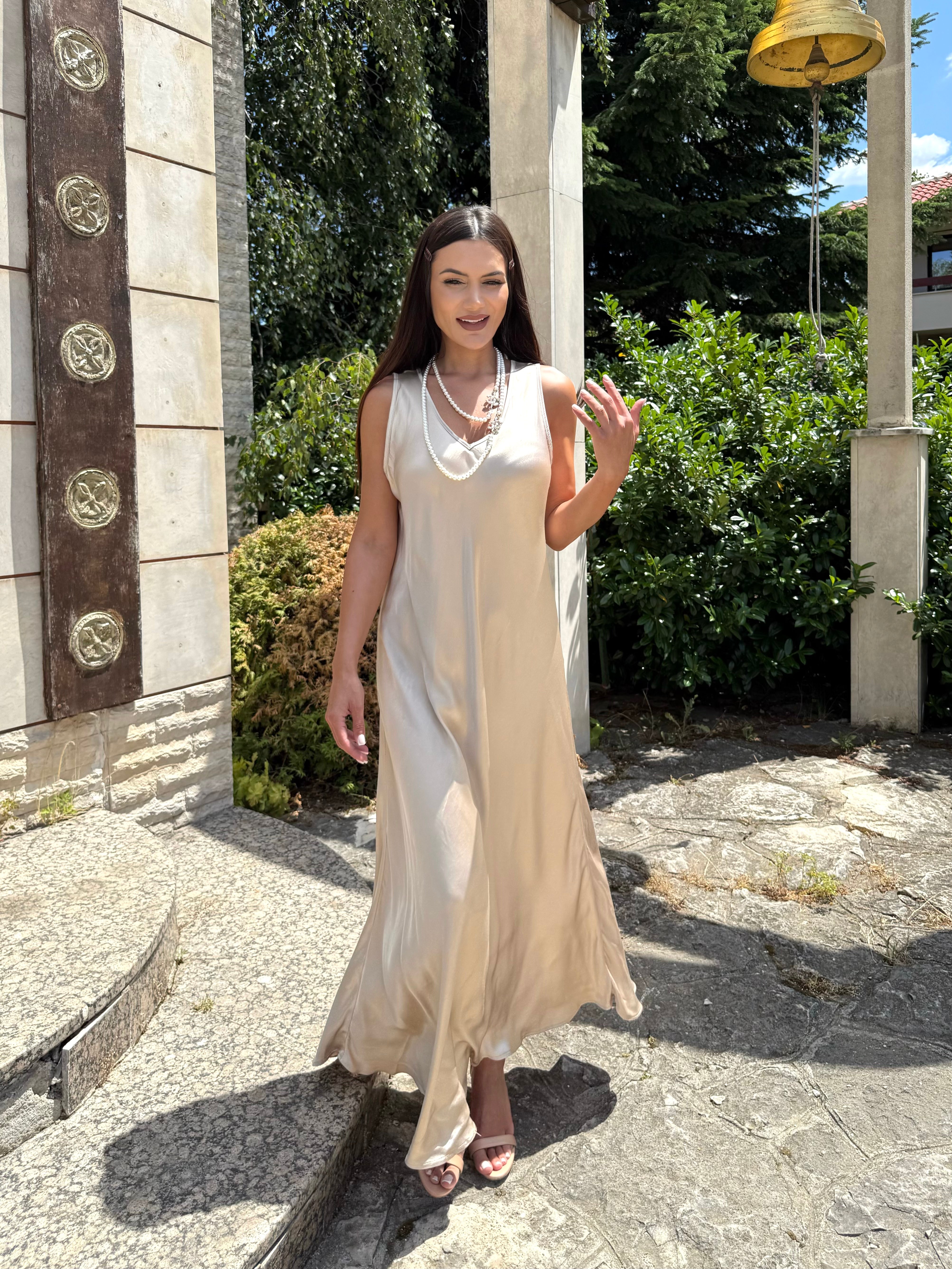 Champagne Glow е въплъщение на изисканата женственост. Създадена от 100% висококачествена вискоза, тя се плъзга ефирно по тялото и създава усещане за лекота и лукс. Нейната универсална кройка обгръща гръдна обиколка от 90 до 120 см и дължина 144 см, което я прави подходяща за различни силуети.