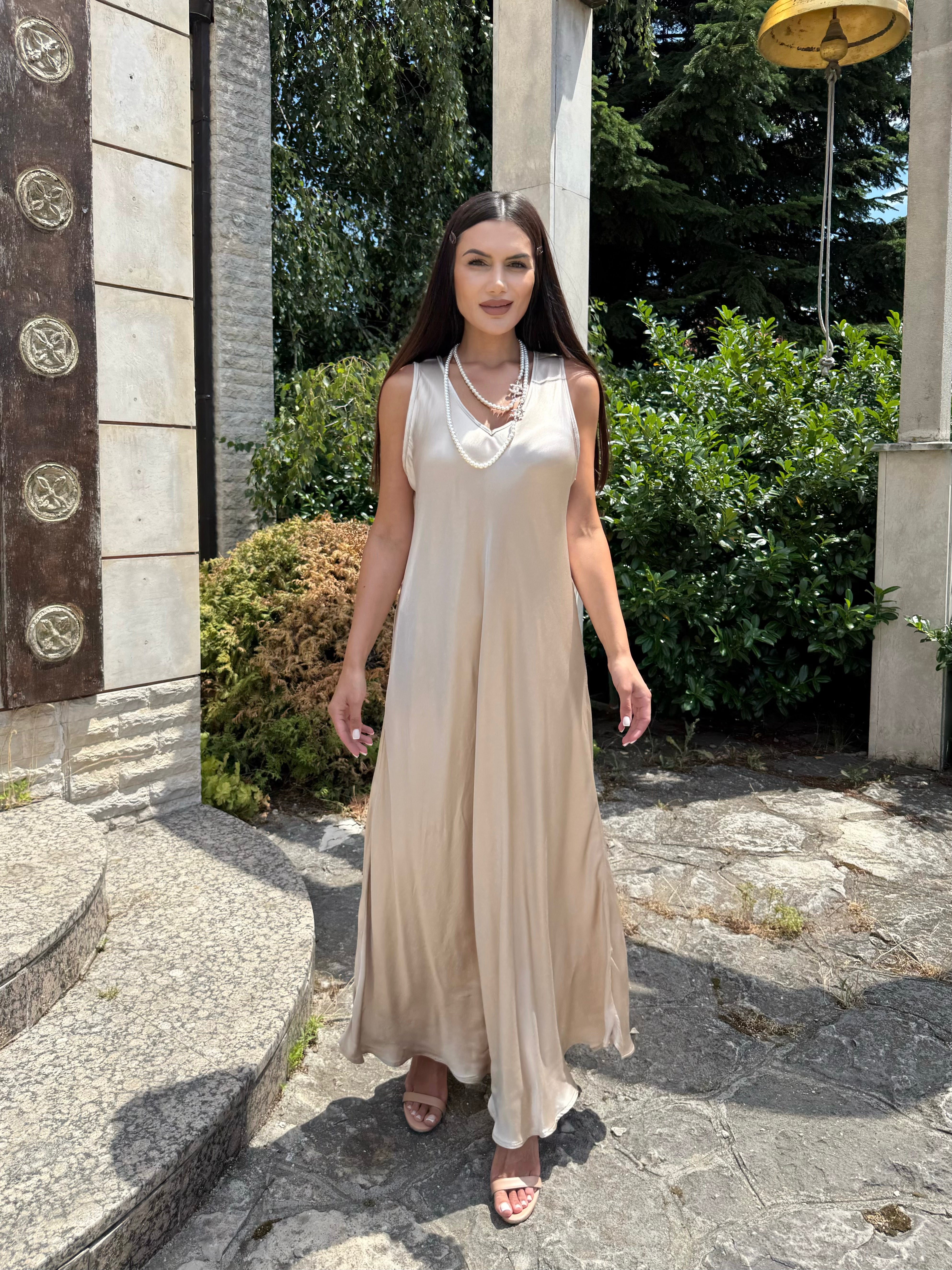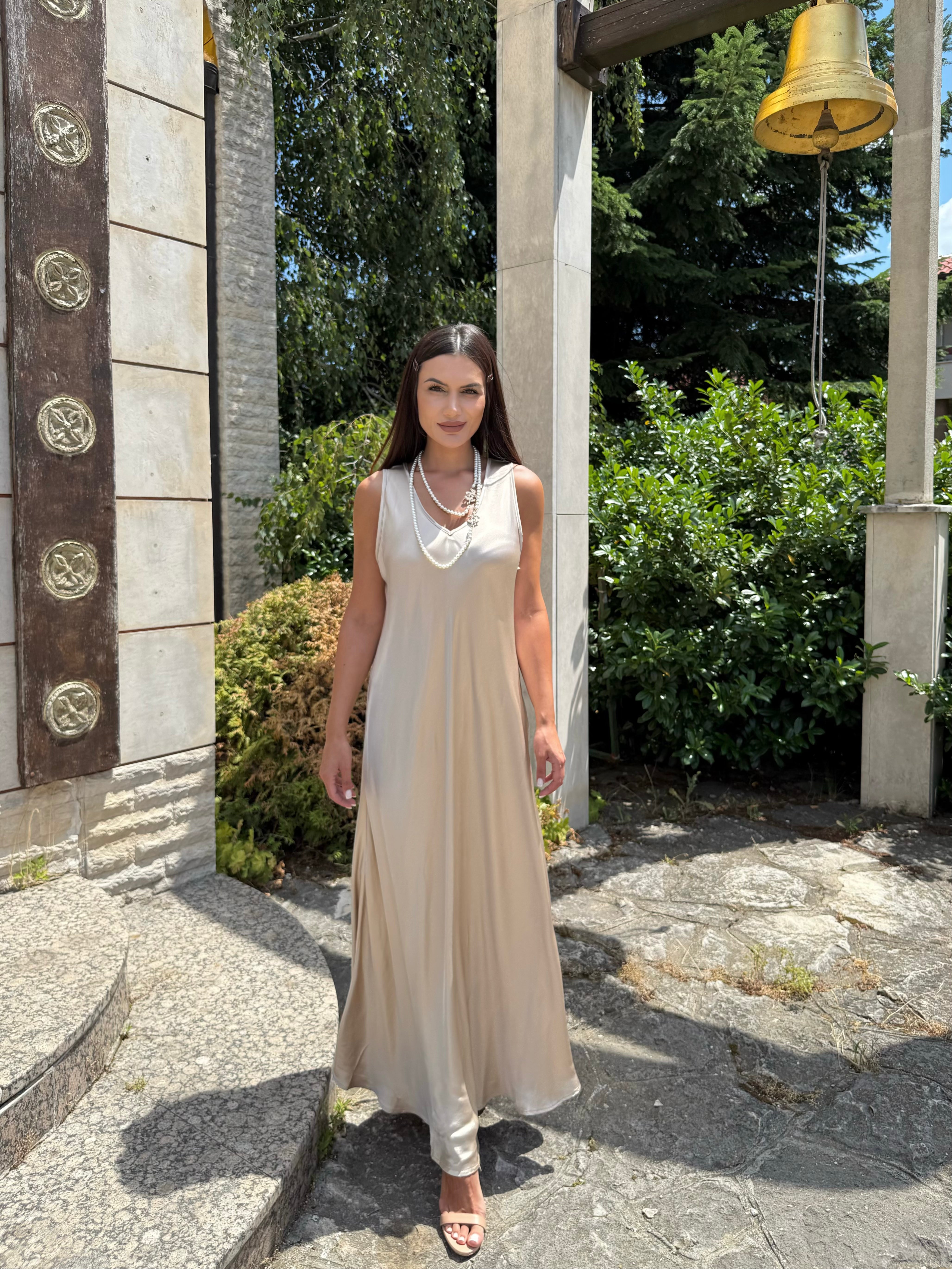 Предлага се в три изискани цвята – слонова кост, шампанско и карамелено кафяво – за да изразиш своята индивидуалност. Идеалният избор за специални поводи, вечерни излизания или елегантен летен стайлинг.