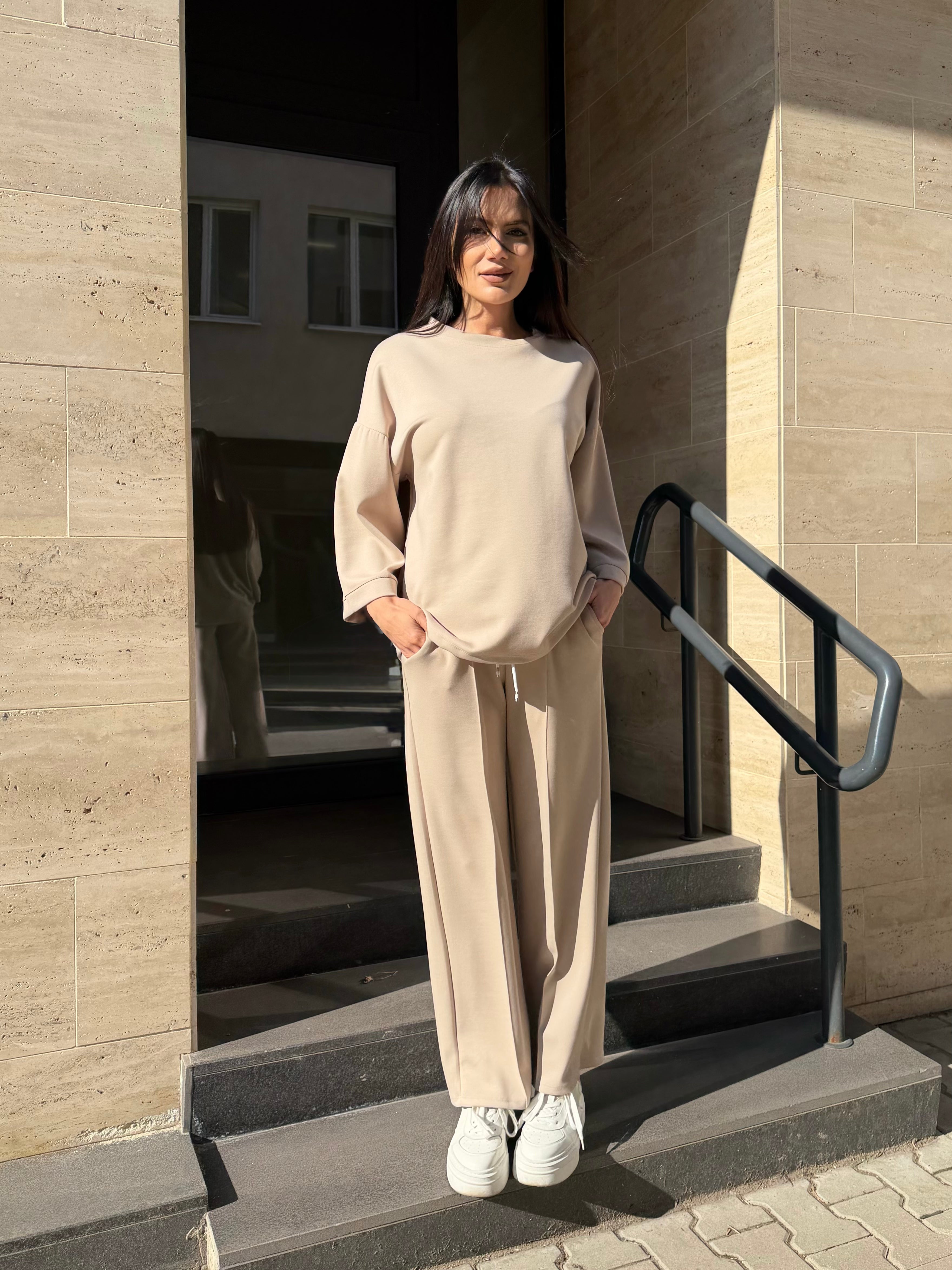 Елегантен комплект от две части, създаден за стил и комфорт в ежедневието. Моделът включва свободна блуза с модерна линия и широк панталон с еластична талия, който подчертава силуета и осигурява удобство през целия ден.