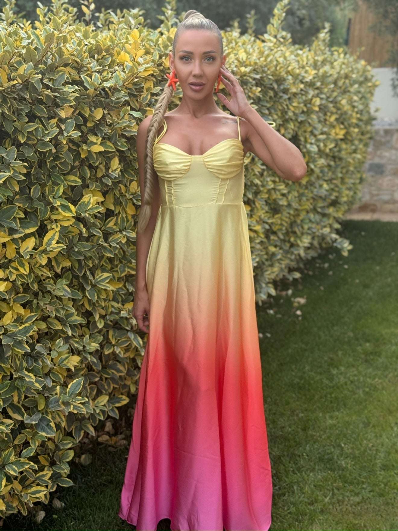 Потопи се в магията на вечерната елегантност с роклята “Moonlight Ombre”. Изработена от сатен с деликатен блясък и плавен преход от жълт към цикламен нюанс, тази рокля е синоним на изтънчен стил. Регулируемите връзки на раменете осигуряват перфектно прилягане, а леката материя създава комфорт при всяко движение. Подходяща за специални поводи, романтични вечери или стилни събития.