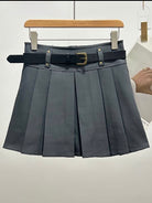 Класическа ученическа линия с модерно 24 DELUXE излъчване – PLEATED BELT SKIRT е мини пола с широки плисета и идеална форма, която се движи красиво и запазва структурата си през целия ден. Моделът подчертава талията, а включеният черен колан с метална тока придава премиум контраст и завършен вид.