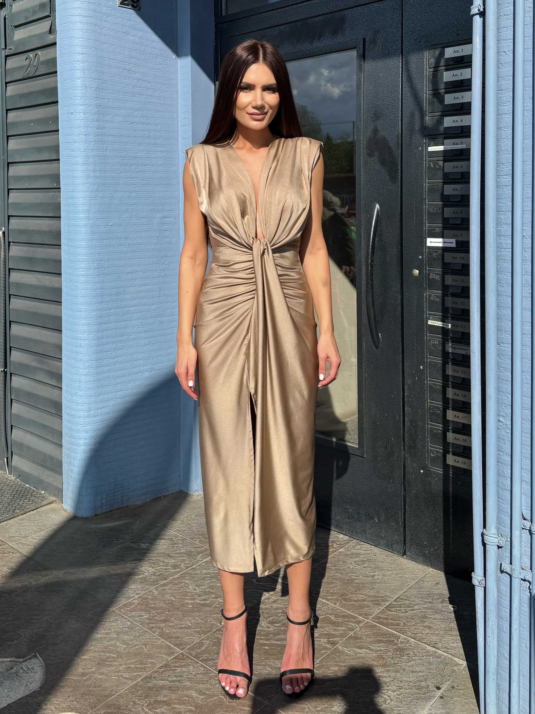 Роклята KIM е създадена за жени, които не се страхуват да бъдат забелязани. С елегантна драпировка, подчертана талия и дълбоко V-деколте, този модел комбинира сексапил с изисканост. Изработена от лека, еластична материя с луксозен сатениран финиш, роклята подчертава силуета и се адаптира към тялото благодарение на универсалния си размер.