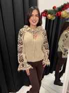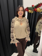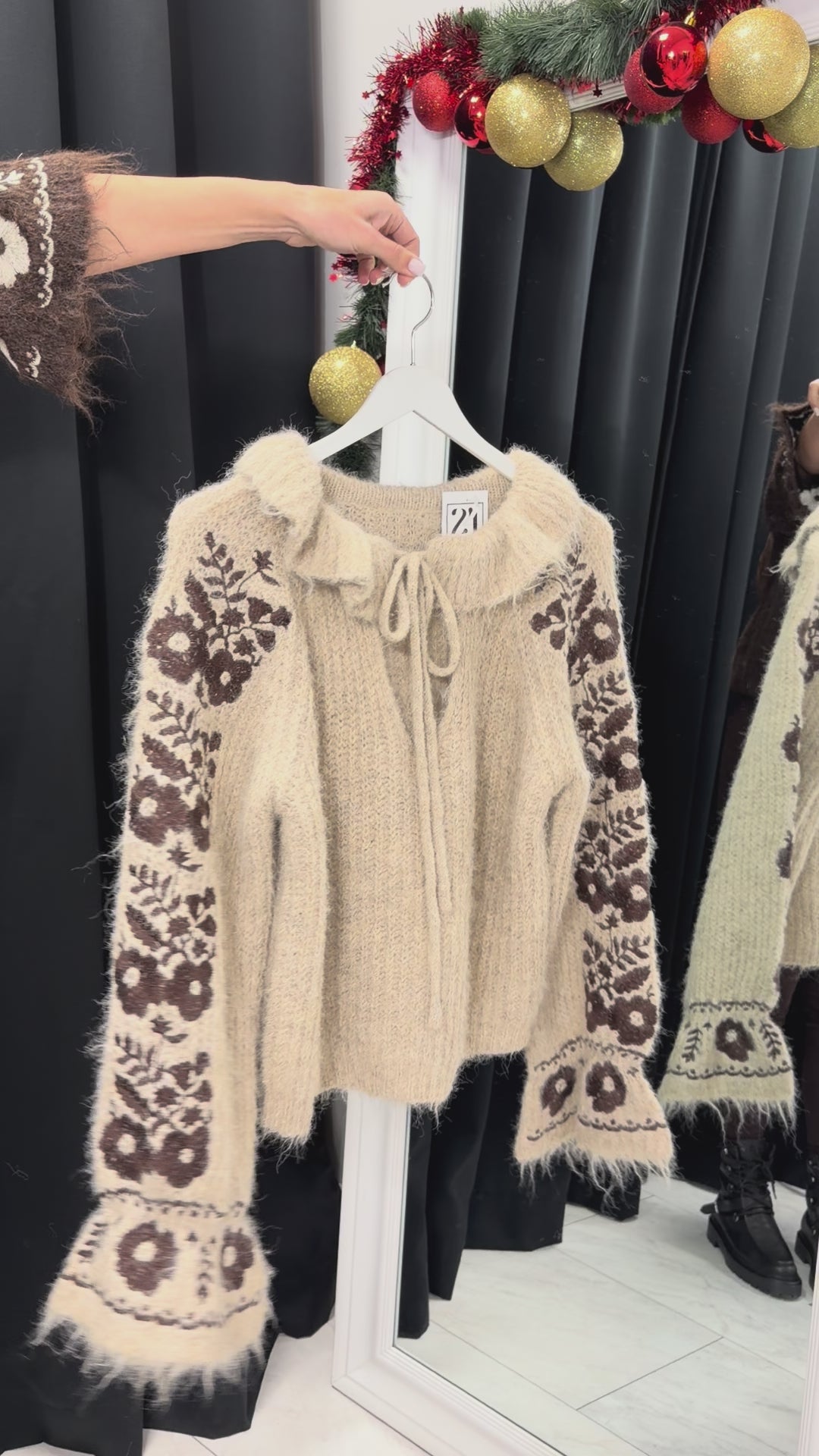 SCANDI BLOOM е пухкав сканди-бохо пуловер с богата флорална плетка по ръкавите, разкроени маншети и деликатна панделка на деколтето.